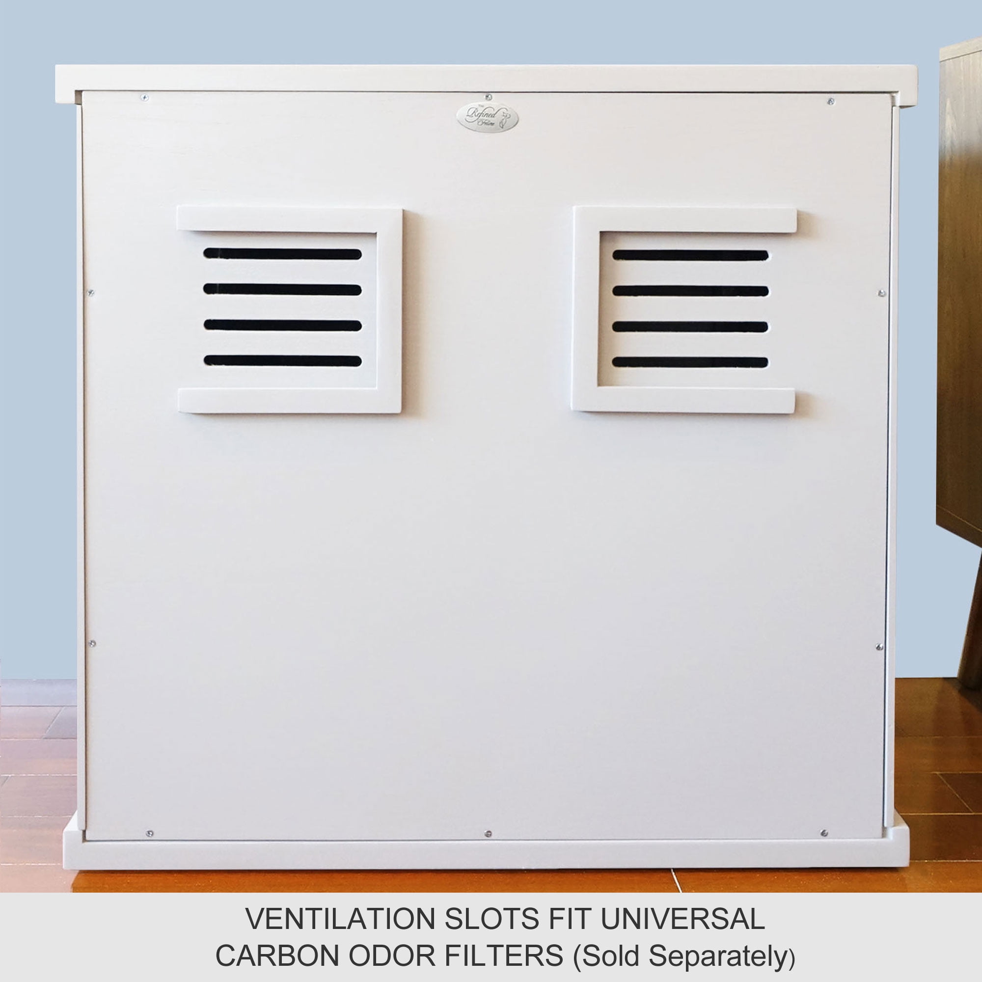 Design can customized with various style panels and feet; Internal plastic litter liner with high walls contains stray litter; Offers a top storage drawer for litter accessories ; Walls reversible for left or right entry; Rear ventilation slots fit universal carbon odor filters (not included); Large: Fits most large and jumbo plastic litter pans