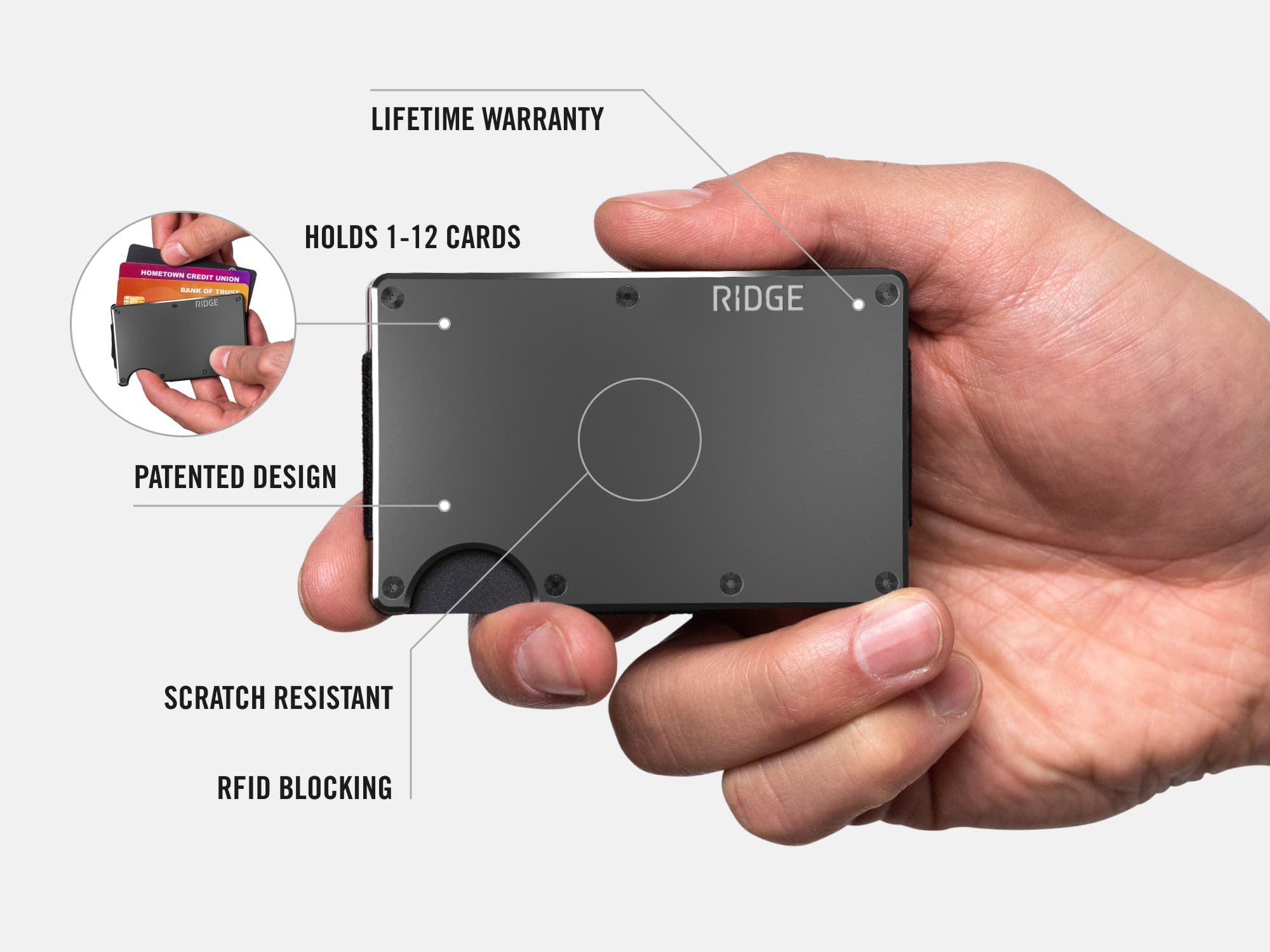 The Ridge is a minimalist, RFID blocking wallet. The main cardholder uses elastic to expand to hold up to 12 IDs and credit cards. The typical leather bifold gets packed with faded receipts and unnecessary cards, resembling something more like a suitcase than a wallet. The Ridge is minimalist without being limiting. It’s about carrying less but always having what you need.