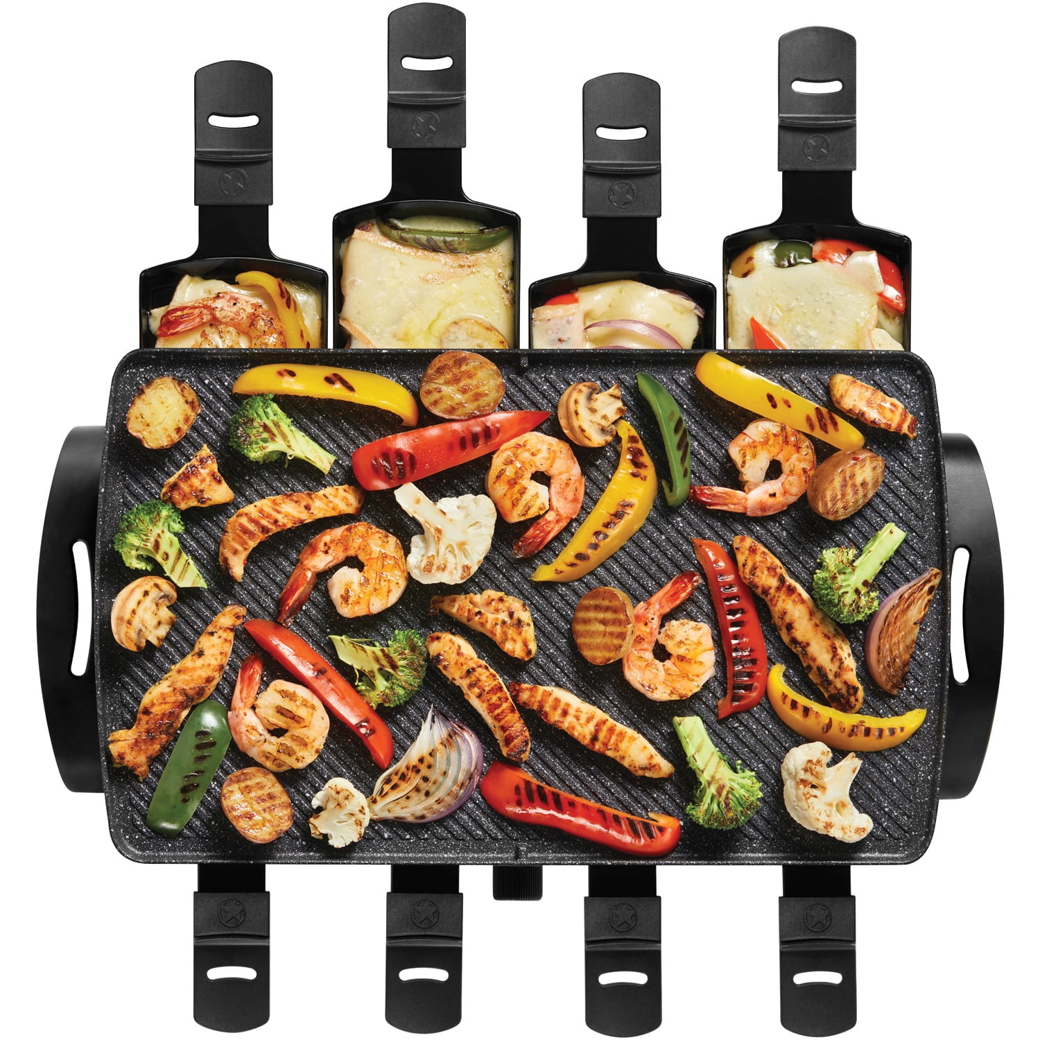 1,500 watts of power Nonstick surface developed using patent-pending Rock.Tec manufacturing process 2-in-1 reversible nonstick plate: griddle and grill Large cooking surface: 16 in. x 9.5 in. Extra-thick plate, cast-aluminum body Detachable, dishwasher-safe plate 8 raclette dishes and spatulas Adjustable temperature control Cool-touch, Bakelite handles ETL certified
