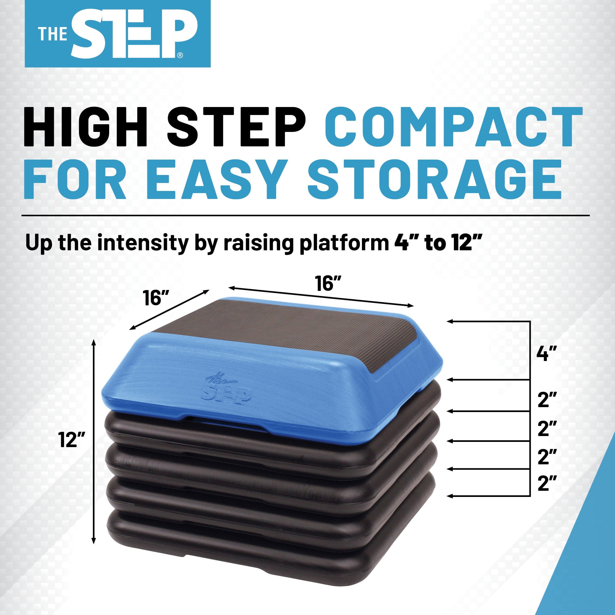 The Step High Step Aerobic Platform with High Step Blue Aerobic Platform and 4 Black Risers: Made from durable, recyclable high-density polyethylene High Step (13 L x 9 W x 4 H) aerobic platform, 4 risers, and streaming videos Platform features grooved, nonslip top and supports 275 pounds Four nonskid feet on each riser and platform prevents sliding or scratching floors Vary workout difficulty by adjusting platform height from 4 to 12 using risers