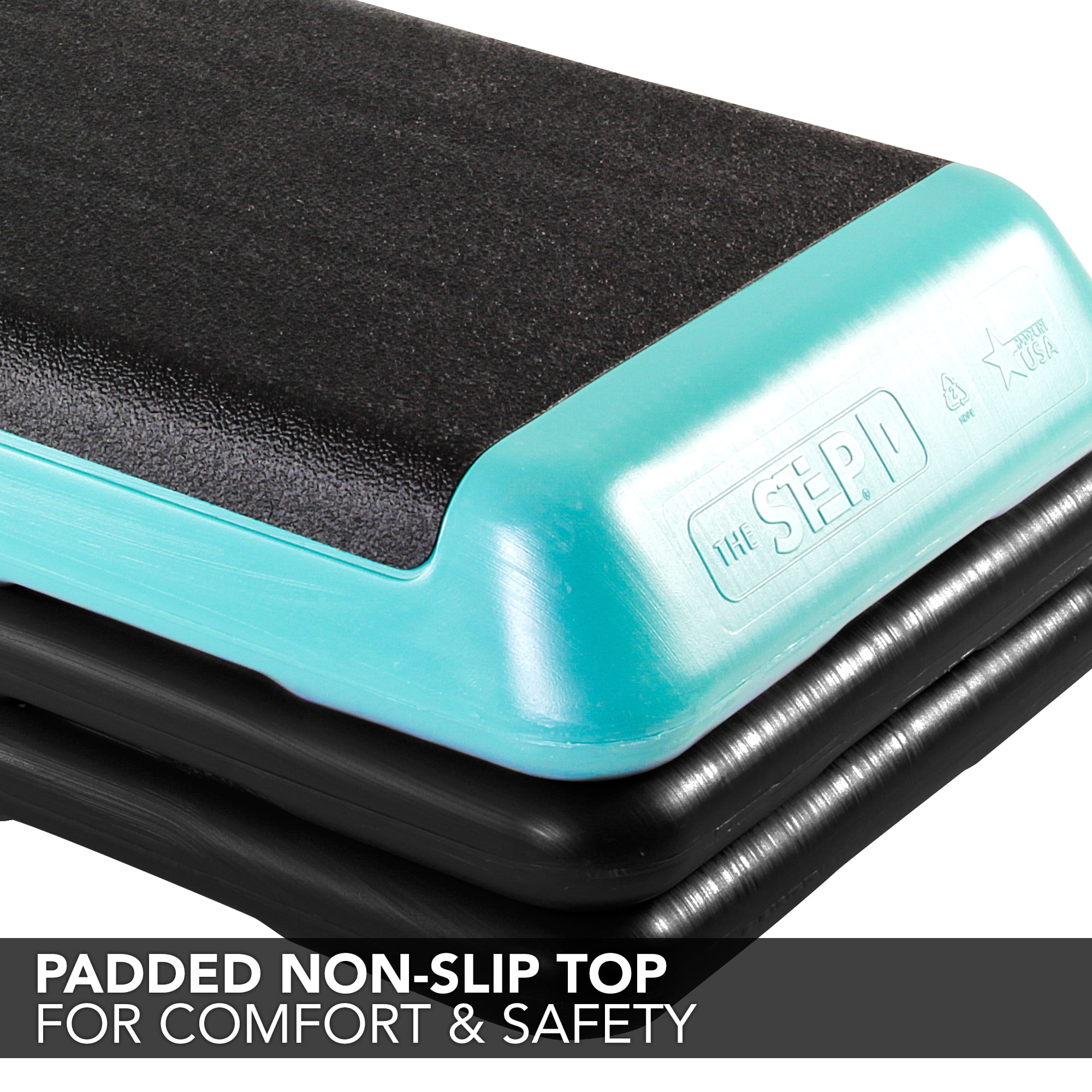 Achieve total-body fitness with The Step original aerobic platform health club size the same step used in fitness clubs across the country. This set includes a teal platform with a premium comfort cushion top and four original purple risers to create the foundation of any workout program. The original health club size platform features a wide 40 L x 14 W x 4 H stepping surface with a nonslip grip for added safety and a comfort cushion (non-latex) top that is easy on the hands, feet, and back. Burn more calories the higher you step with 4, 6, and 8 platform height options using the 16 L x 16 W x 2 H risers. These sturdy risers can be used on any type of indoor flooring from carpet to concrete to hardwood without leaving behind scratches. The Step is a great home-fitness tool for beginners to experts and is customizable for a variety of aerobic and strength exercises.