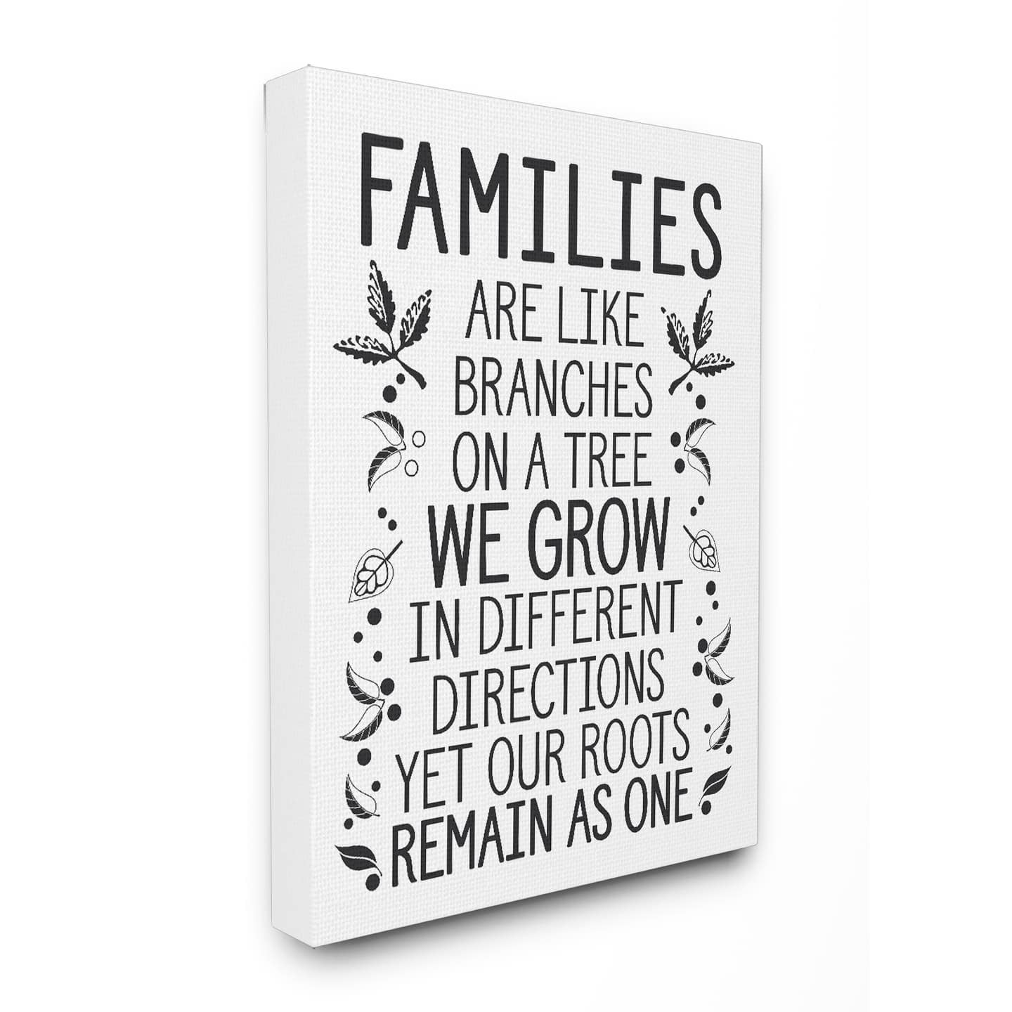 Choose from available sizes For indoor use Features Families Are Like Branches in black on white backdrop with leaf details Printed on canvas over solid wood frame Choose from framed, wall plaque, or canvas options while available Hanging hardware included