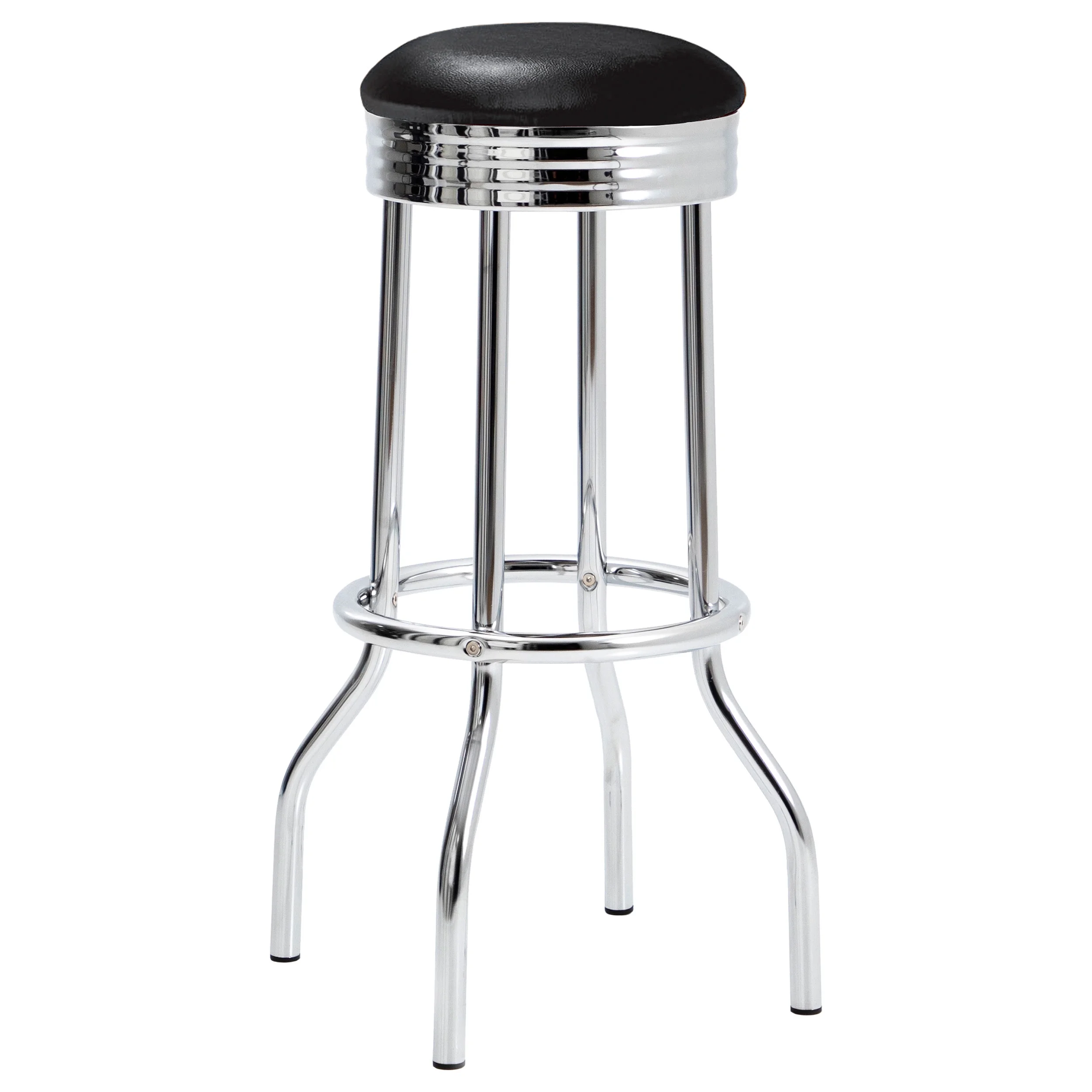 Buck the modern and embrace the retro with this classic soda fountain style bar stool Leatherette upholstered cushion combined with a comfortably placed round footrest ensures you can kick back with ease Stool’s steel and MDF construction provides a solid base for any patron, tall or small Iconic ribbed apron provides an understated but distinct flair next to any kitchen counter, pub bar, or throwback soda fountain Two stools included with each order and assembly is required Quantity: 2 (table not included) Color: Black and chrome Dimensions (L x W x H): 19 x 19 x 30 inches Weight: 22 pounds Manufacturer warranty: 1-year warranty