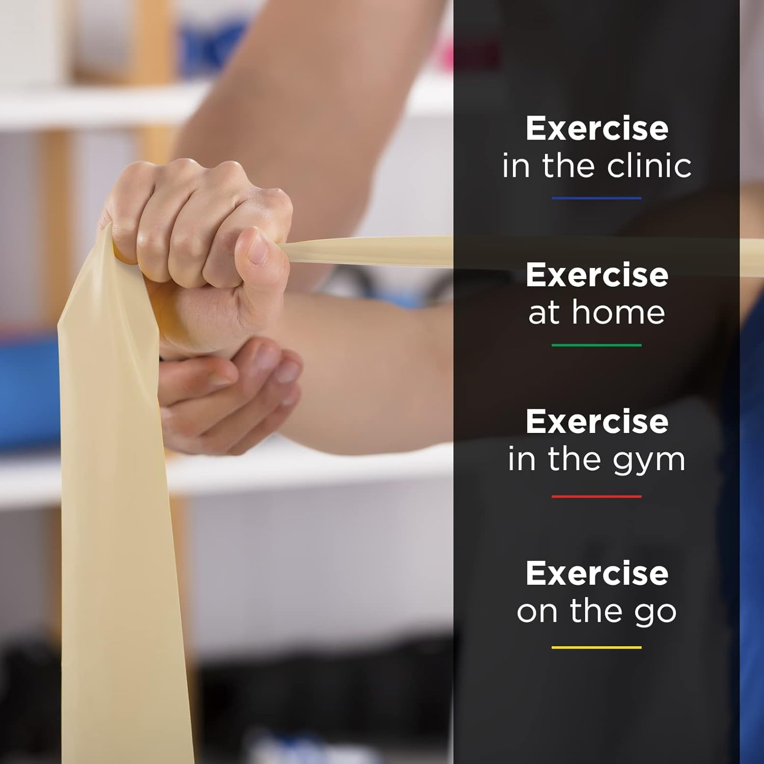 Improves strength, range of motion and flexibility in a simple to use, portable product that works in the clinic, the gym, at home or on the road Color-coded Progressive Resistance system allows users to recognize improvement as it happens, as you grow stronger you can move up to the next color Highest quality natural rubber latex resistance bands are recognized as the original system of progressive resistance for over 40 years Extra Thin, Tan Bands are the first of eight levels of resistance and are great for rehabilitation or those beginning an exercise program, they offer 2.4 lbs. resistance at 100% elongation and 3.4 lbs. at 200%, roll measures 50 yards long x 5″ wide