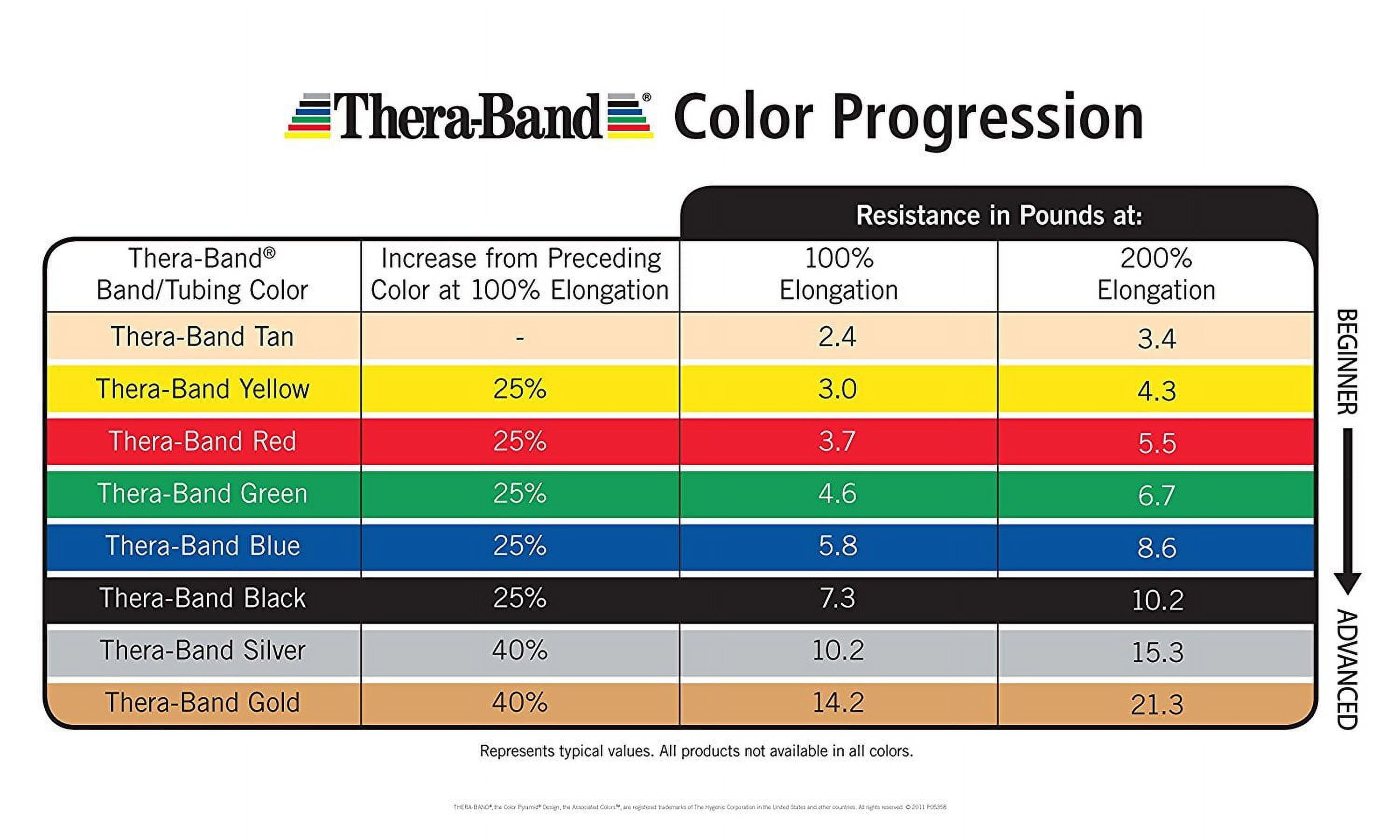 THERABAND Professional Latex Resistance Tubing is available in seven color-coded levels of resistance. Different resistance levels are determined by the thickness of the tubing and can be used for rehabilitation with light to moderate resistance or as an alternative to weight training. Proper use of these systems for resistance exercises provides both positive and negative force on the muscles, improving strength, range of motion, and flexibility. Color-coded progressive resistance gives at-a-glance documentation of progress from one level to the next. Tubing can be incorporated with a number of attachments to expand versatility and number of uses.