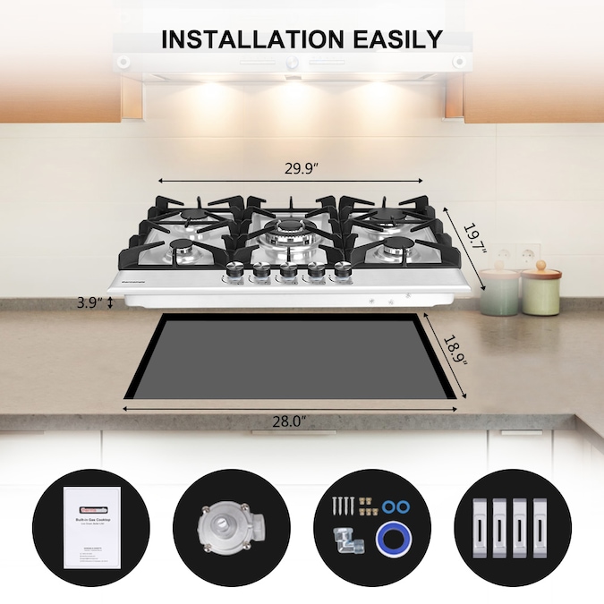 - The built-in size is 28.0” W X 18.9”D while the whole product size is 29.9” W X 19.7”D X 3.9”H for this built in gas cooktop.