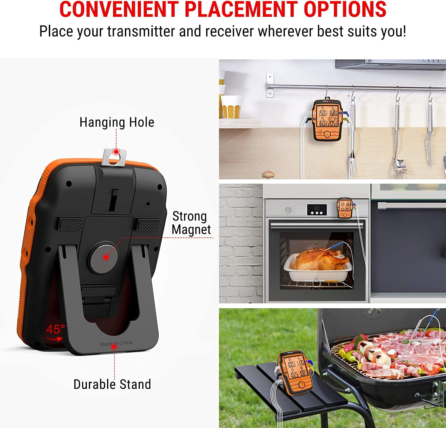 4 Color-coated Probes to Avoid Confusion – Smoker thermometer with 4 probes can simultaneously monitor up to 4 different kinds of meat or the smoker/oven/grill’s ambient temperature; Easily identify which probe is inserted into what piece of meat with the color coated probe plug and corresponding color coated probe 500 Feet Long Remote Range – Wireless thermometer features next generation RF wireless technology to achieve extended range up to 500feet and stronger signal strength through obstacles and walls, essential when monitoring meals at a long distance and guaranteeing to reach anywhere in your home or yard Standalone Transmitter – ThermoPro meat thermometer for cooking features a unique design where all key programmable buttons are located on transmitter to allow usage of the BBQ thermometer without the receiver, perfect for those fast cooking meats like fish or steak in short distance Optimal Accuracy & Simple Setup – Digital meat thermometer for grill features 6.2inches food grade stainless steel probes with a 43inches mesh cable which boasts an accuracy of ±1.8 Fahrenheit to ensure meat is cooked to perfection and the probes will work with any grill. Food thermometer for cooking is pre-synchronized, no synchronization required Smart Temperature Alarm – Grilling thermometer contains a unique alarm mode that vibrates and turns on a flashing backlight on both the receiver and transmitter to inform you when the meat/bbq temperature reaches your setting; Never miss the perfect moment to take your meat off the heat