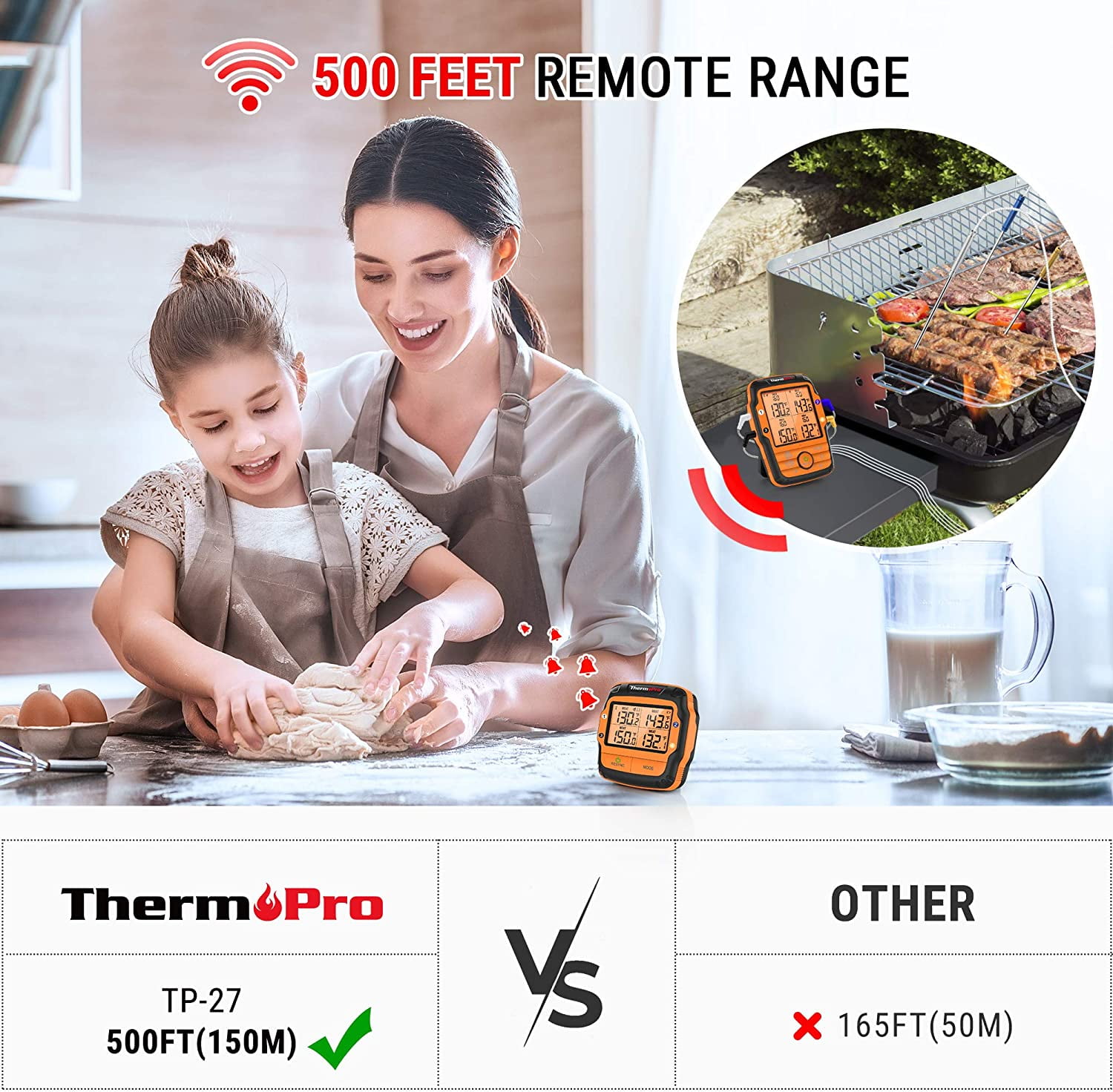 ThermoPro – Cook Like A Pro Every Time! ThermoPro TP-27 Wireless BBQ Meat Thermometer ThermoPro meat thermometer TP27 features 4 color-coated probes which can monitor 4 different kinds of meat, or the smoker/grill/oven’s temperature simultaneously. Remote thermometer can monitor the meat temperature from a long distance of up to 500ft. Perfect for tracking temps in your backyard or kitchen. With the unique alarm function, feel free to mingle, do chores or watch TV without ever having to physically check on your food! A must-have kitchen gadget. Video Introduction: Smart Temperature Alarm – Once the temperature of the MEAT/BBQ reaches your set temperature, both the transmitter and receiver will sound an alarm with vibration, the LCD backlight will turn on, and the corresponding probe on the display will flash to inform you which meat is ready, never miss the perfect cook again! – You could silence your devices for those late night or early morning cooks! High Accuracy & Heat Resistance Probe and Wire can withstand up to 716°F (380°C). Meat thermometer wireless has upgraded 6.5″ Super Long food grade stainless steel probe with ±1.8°F/1°C accuracy in a range from 14°F to 572°F (-10°C to 300°C) to detect the core temp of meat. Large LCD Display with Touch Backlight The compact receiver features a Large LCD screen with touchable backlight button that shows the ALL current temperature readings. The backlight makes it superbly easy to view in all light conditions, even at night; Select between Celsius/Fahrenheit readings. Convenient Placement Options With a strong magnetic back, the meat probe thermometer can be attached to the side of your grill/smoker or any other non-heated metal surface. You can also put your grill meat thermometer on a countertop with the tabletop stand and place it on a kitchen hook with the hanging hole. A versatile kitchen tool. Package Contents: 1 x Digital Cooking Thermometer Receiver 1 x Digital Thermometer Transmitter 4 x Stainless Steel Probe 2 x Probe Clips 4 x AAA Battery 1 x User Manual Key Features:
