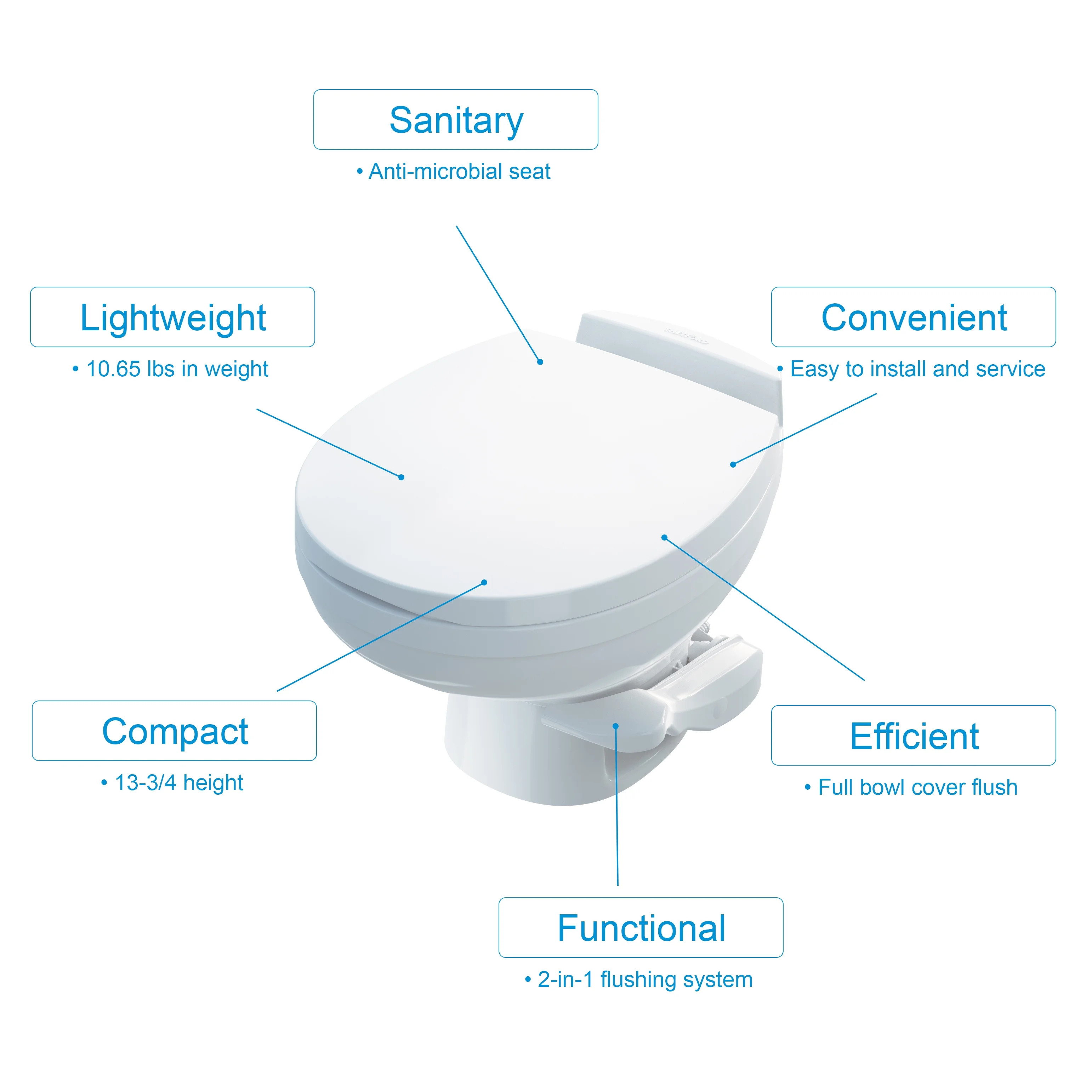 Thetford Aqua-Magic Residence is a stylish, comfortable, and lightweight toilet, suited for all RV type The toilet uses a single-pedal system – pressing the pedal halfway adds water to the bowl, while pressing the pedal all the way flushes, giving 100% bowl coverage flush Residence comes with an antimicrobial seat, which inhibits mold and odor-causing bacteria growth Lightweight RV toilet – 10.65 lbs – with full-size residential seat that can be customized Aqua-Magic Residence can be fitted with an optional water-saving hand sprayer for a hand rinse wash down