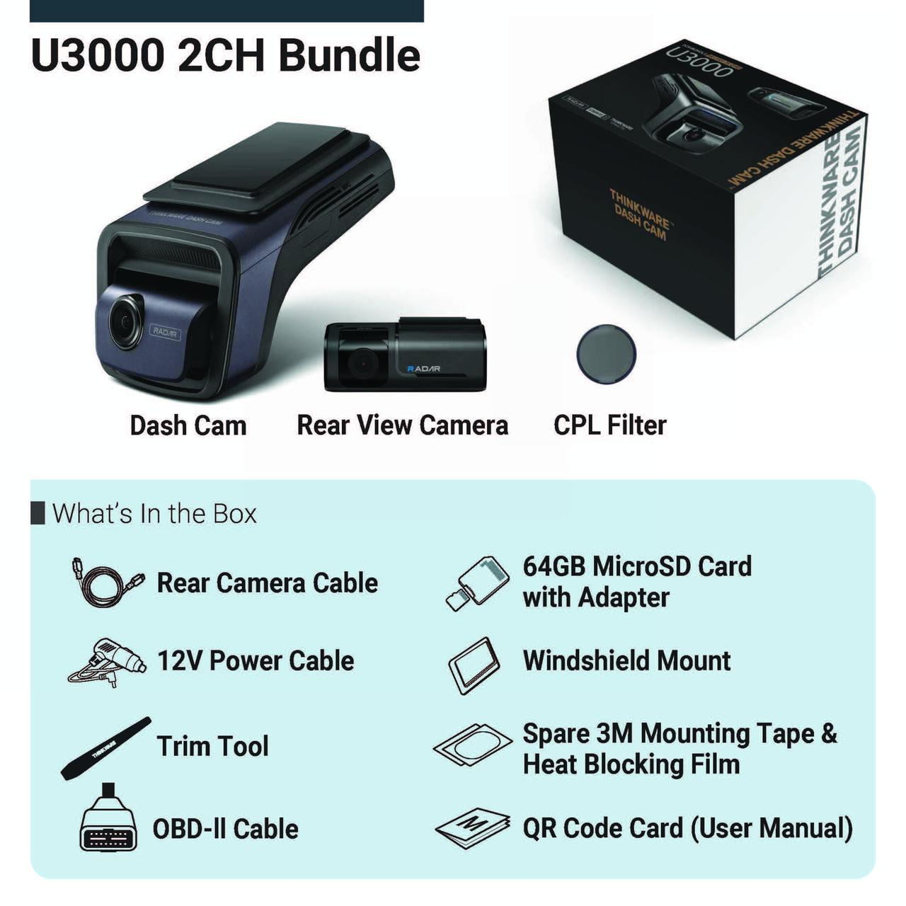 【4K FRONT + 2K REAR & SUPER NIGHT VISION 4.0 W/ SONY STARVIS 2 SENSOR】The U3000 delivers improved 4K front and 2K rear recording compared to the U1000, thanks to STARVIS 2 and a more powerful Ambarella CPU. The addition of an adjustable bitrate offers the flexibility to record sharper footage. Also, the U3000 features Super Night Vision 4.0 which takes advantage of STARVIS 2’s high sensitivity and low noise technology to help the dash cam capture clearer footage in low-light conditions. 【NEW RADAR PARKING MODE WITH BUILT-IN RADAR】 Radar Parking mode is a low-powered recording mode that utilizes the U3000’s built-in radar to monitor motion with minimal power consumption (requires hardwiring or OBD-II cable; OBD included). This allows for longer parking surveillance with buffering so you have footage of events leading to an incident. When a motion or impact is detected, the U3000 will save a 20-sec video clip of the incident (10s before and after the motion or impact is detected) 【EASY WI-FI DEVICE PAIRING WITH THINKWARE LINK APP & BLUETOOTH】 Built-in Bluetooth allows hassle-free dash cam pairing with your compatible Android or iOS device via the Thinkware Link App. Once paired, replay your latest driving videos and manage your dash cam’s settings with the Thinkware Link App. 【EASY ACCESS WITH THINKWARE CONNECTED APP】THINKWARE CONNECTED App provides easy access to your Thinkware Dash Cam so you can watch your vehicle live remotely, get instant impact notifications, and more, all in the same app. (Internet connection is required, carrier charges may apply) 【SPEED AND RED LIGHT CAMERA ALERT】The built-in GPS antenna tracks the speed and time data of your vehicle and enables the dash cam to alert you of upcoming red light cameras and speed cameras. 【EASY INSTALLATION W/ INCLUDED OBD-II CABLE】Enable Parking Mode without hassle using the included OBD-II Cable.