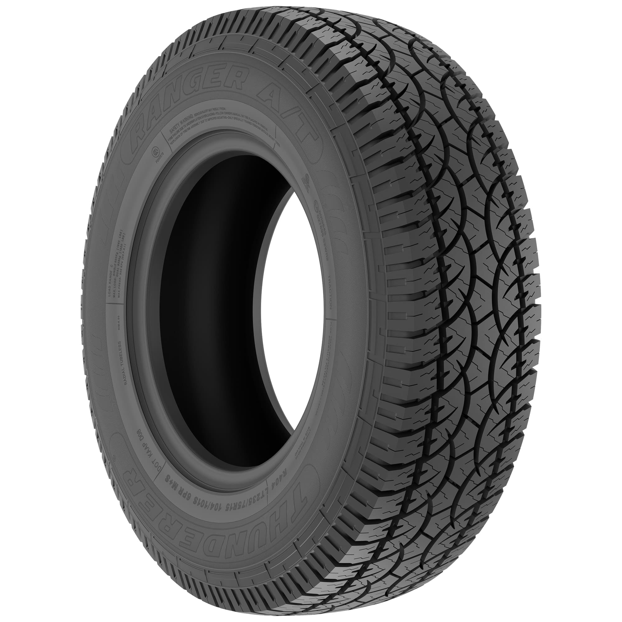 Thunderer Ranger A/T R404 265/50R20 107T OVERVIEW The Ranger A/T R404 from Thunderer is an all-terrain tire for light trucks and features an aggressive tread pattern for off-road traction, rim guard and reinforced sidewall, durable tread formulation, and is designed for great responsiveness and road manners on the highway. Additionally, the Ranger A/T R404 is backed by a 55,000 mile limited manufacturer tread life.