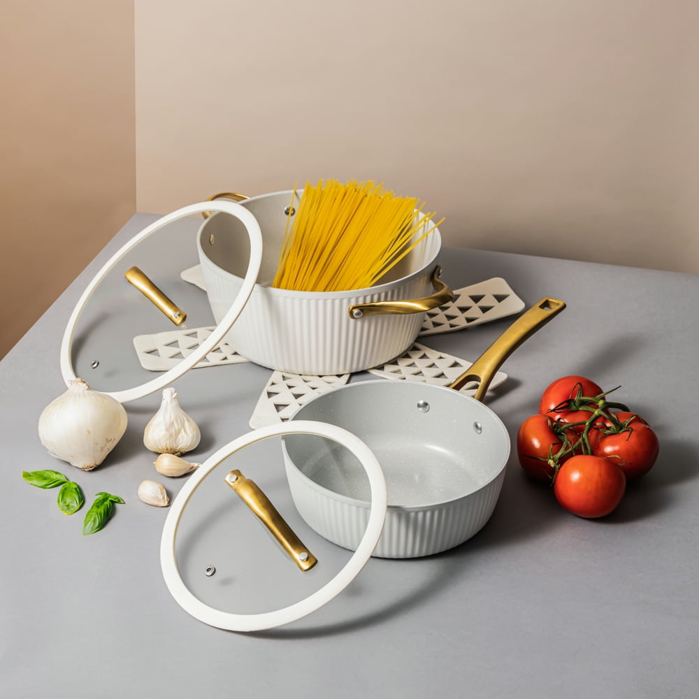 Meet your new Signature kitchen tool, Thyme & Table 12-Piece Ceramic Non-Stick Ribbed Cookware Set, elegantly designed in White & Gold. This set is the perfect blend of style and functionality, ensuring a top-notch cooking experience with every use. This set includes a generous 5.5-quart stock pot, a 2.5-quart saucepan, a 2-quart sauté pan, a 10-inch fry pan, and an 8-inch fry pan, equipping you for any culinary challenge. Additionally, it comes with 4 cookware protectors to keep your investment in pristine condition for years to come.