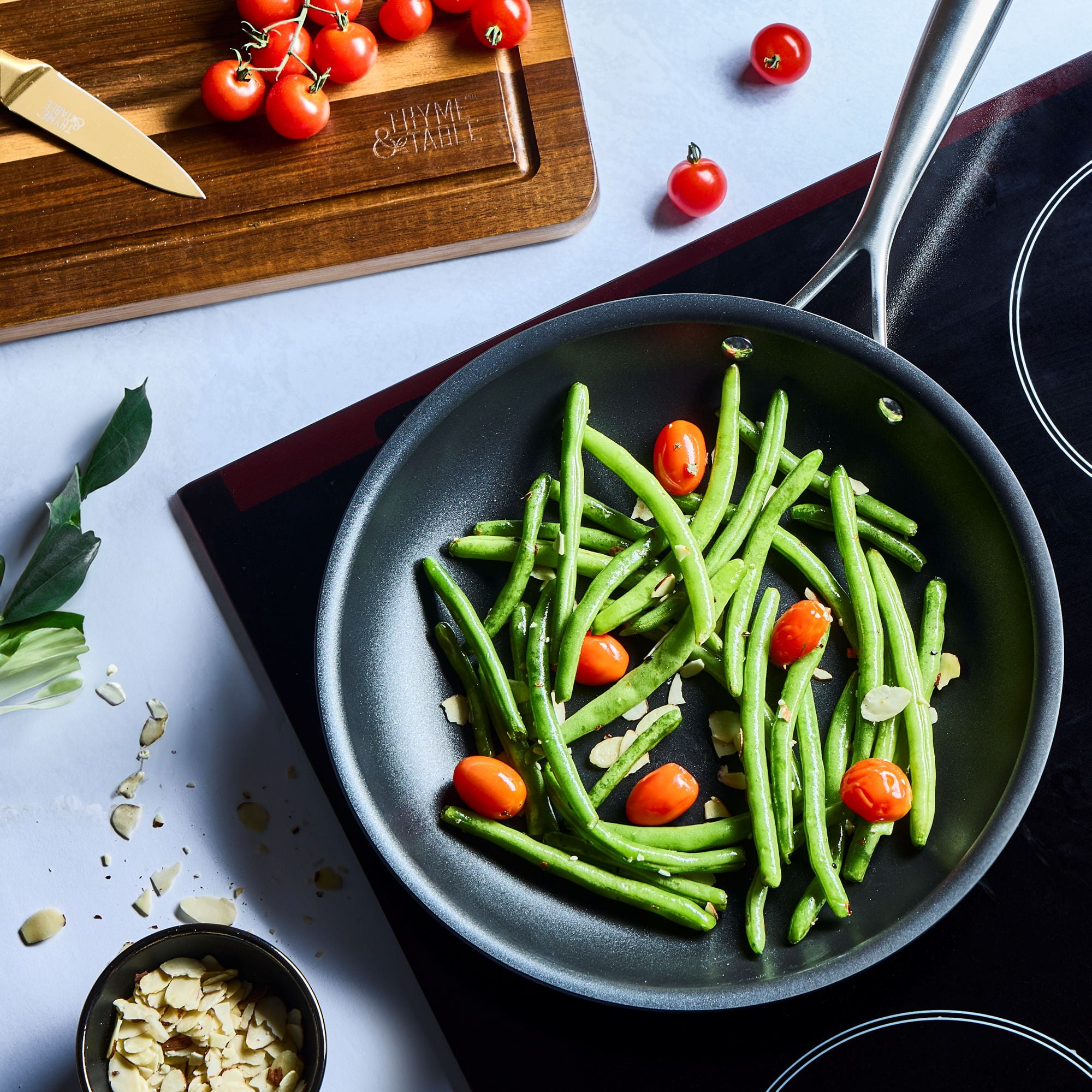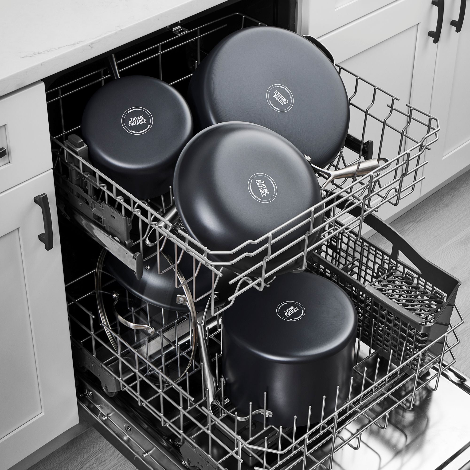 Introducing the Thyme & Table Nonstick 15-Piece Hard Anodized Cookware Set, Pro Series – the pinnacle of culinary excellence. Crafted to meet the highest standards of passionate chefs and home cooks, this collection redefines durability, versatility, and top-tier performance in your kitchen. This set features two stock pots: a spacious 8-quart pot with a glass lid and a 4-quart pot with a glass lid. You’ll also find a 3-quart and 2-quart saucepan, each with a pouring spout and glass lid, along with a 5-quart sauté pan and two frying pans 12- and 8-inch, ensuring you’re ready for any culinary challenge. Plus, it includes three cookware protectors to keep your investment in top condition for years to come. Ultimate Engineering: Experience the superior craftsmanship of our hard anodized aluminum construction. This advanced process creates a tough, resilient surface that is twice as hard as stainless steel, offering exceptional durability that meets the demands of daily cooking. Versatility: Prepare to be impressed as heat distributes evenly across the entire cooking surface, eliminating hotspots for precise temperature control. The non-stick coating ensures easy food release, and the cookware is oven safe up to 400°F. Plus, the cooking surface is safe for use with metal utensils, offering versatility and convenience. Cook like a Pro in your own Kitchen: From searing steaks to simmering delicate sauces, and everything in between, our cookware consistently delivers outstanding results every time. Crafted to exceed the expectations of both passionate chefs and home cooks, this collection redefines durability, versatility, and performance in the kitchen. Discover the Thyme & Table Nonstick 15-Piece Hard Anodized Cookware Set, Pro Series, and elevate your culinary experience. Use and Care Dishwasher Safe, Handwash Recommended
