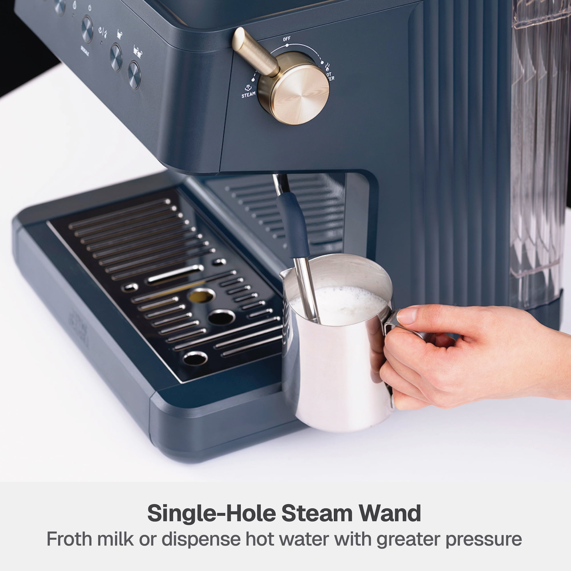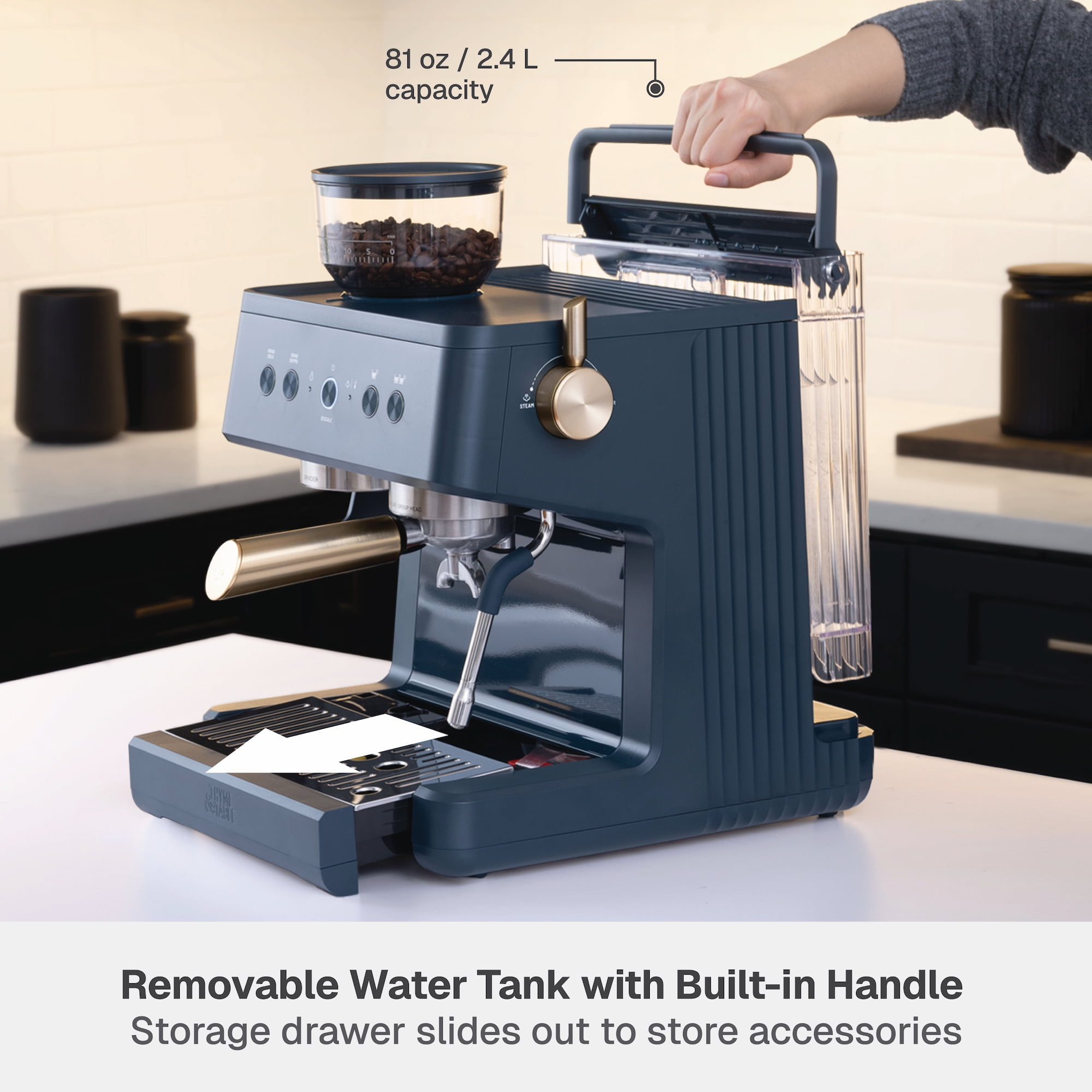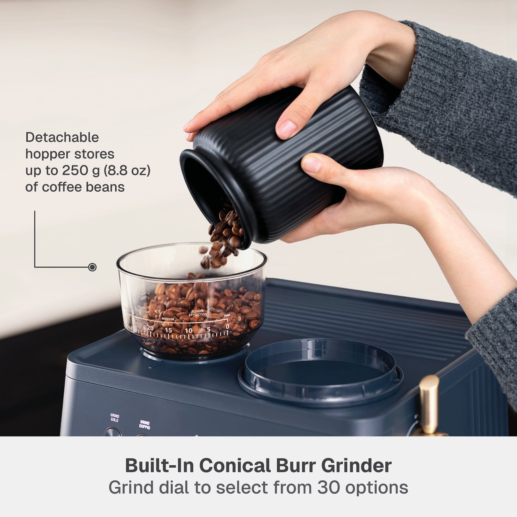 Barista-grade technology: experience barista-quality espresso faster with rapid heating & full-bodied brewing Built-in conical burr grinder with grind dial to select from 30 options 250 g detachable hopper 15-bar pressure Single-hole steam wand to delicately froth milk or dispense hot water with greater pressure Precise temperature control, optimal pressure & rich flavor extraction Interior storage compartment to store cleaning tools Programmable functions Solo (single) & Doppio (double) options for grinding or brewing Non-slip ribbed warming surface to prep cups for brewing Removable 1.6 qt water tank with built-in handle Drip tray with removable plate & low-water indicator Thermoblock boiler boils water in less than 1 min Includes: 58 mm portafilter, 58 mm tamper, 2x stainless steel filter baskets, stainless steel frother cup, cleaning brush, cleaning pin & priming pump Recipe cards included for daily inspiration Total product weight: 25.6 lbs Exclusively sold at