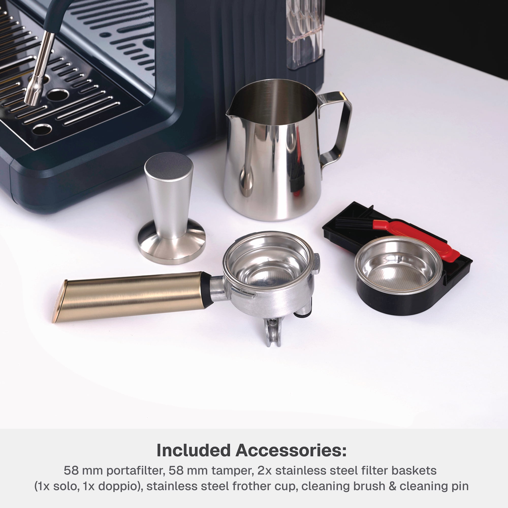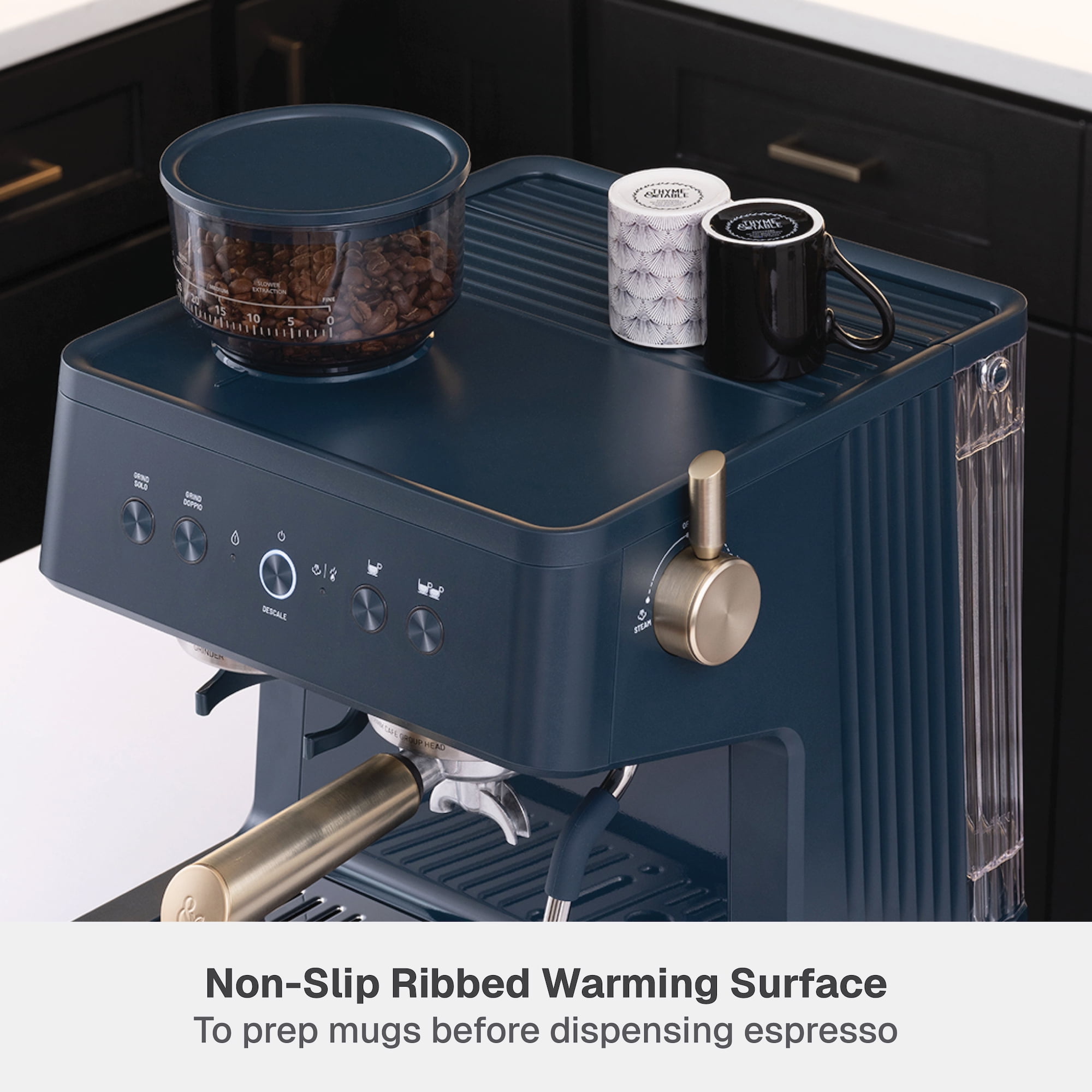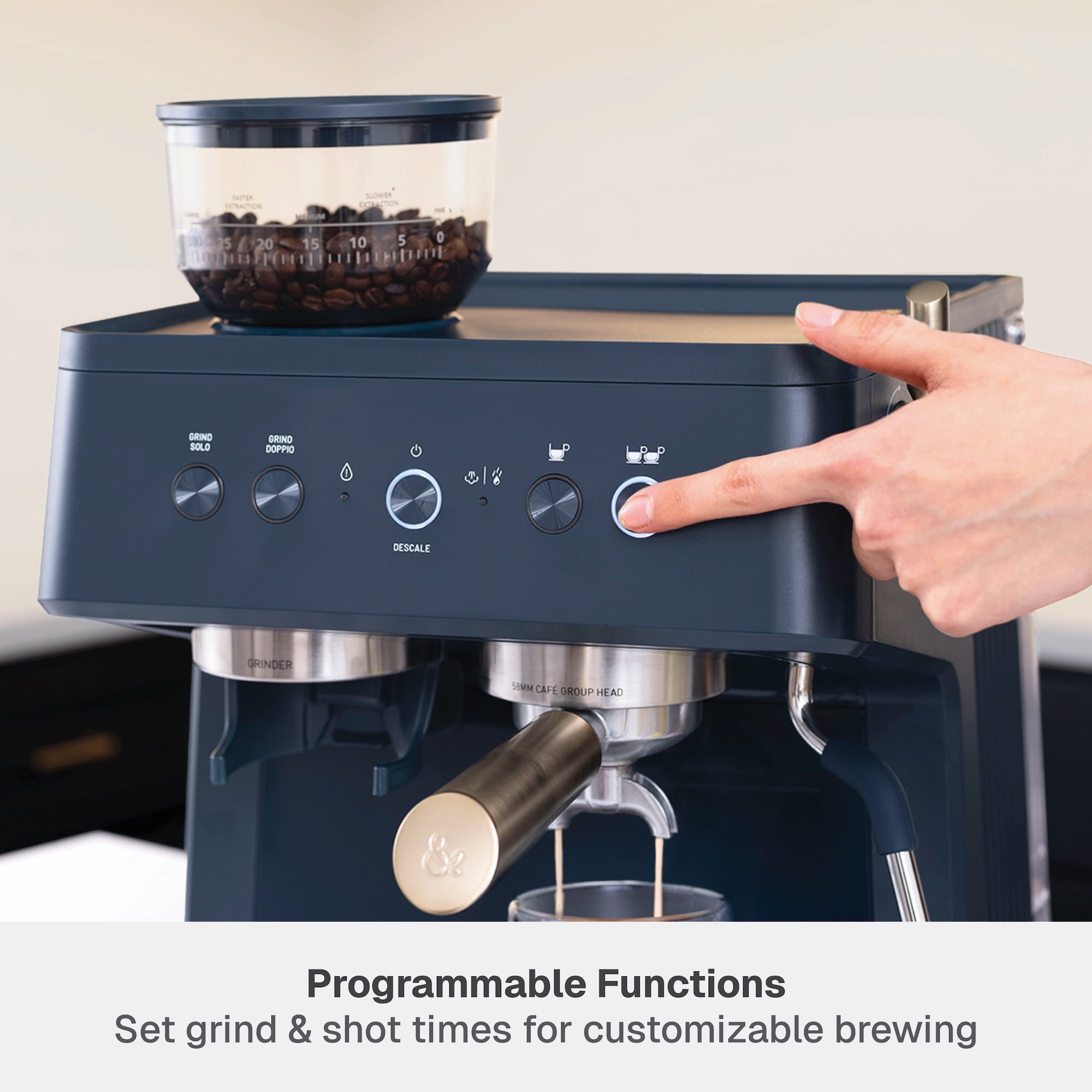 Barista-grade technology: experience barista-quality espresso faster with rapid heating & full-bodied brewing Built-in conical burr grinder with grind dial to select from 30 options 250 g detachable hopper 15-bar pressure Single-hole steam wand to delicately froth milk or dispense hot water with greater pressure Precise temperature control, optimal pressure & rich flavor extraction Interior storage compartment to store cleaning tools Programmable functions Solo (single) & Doppio (double) options for grinding or brewing Non-slip ribbed warming surface to prep cups for brewing Removable 1.6 qt water tank with built-in handle Drip tray with removable plate & low-water indicator Thermoblock boiler boils water in less than 1 min Includes: 58 mm portafilter, 58 mm tamper, 2x stainless steel filter baskets, stainless steel frother cup, cleaning brush, cleaning pin & priming pump Recipe cards included for daily inspiration Total product weight: 25.6 lbs Exclusively sold at