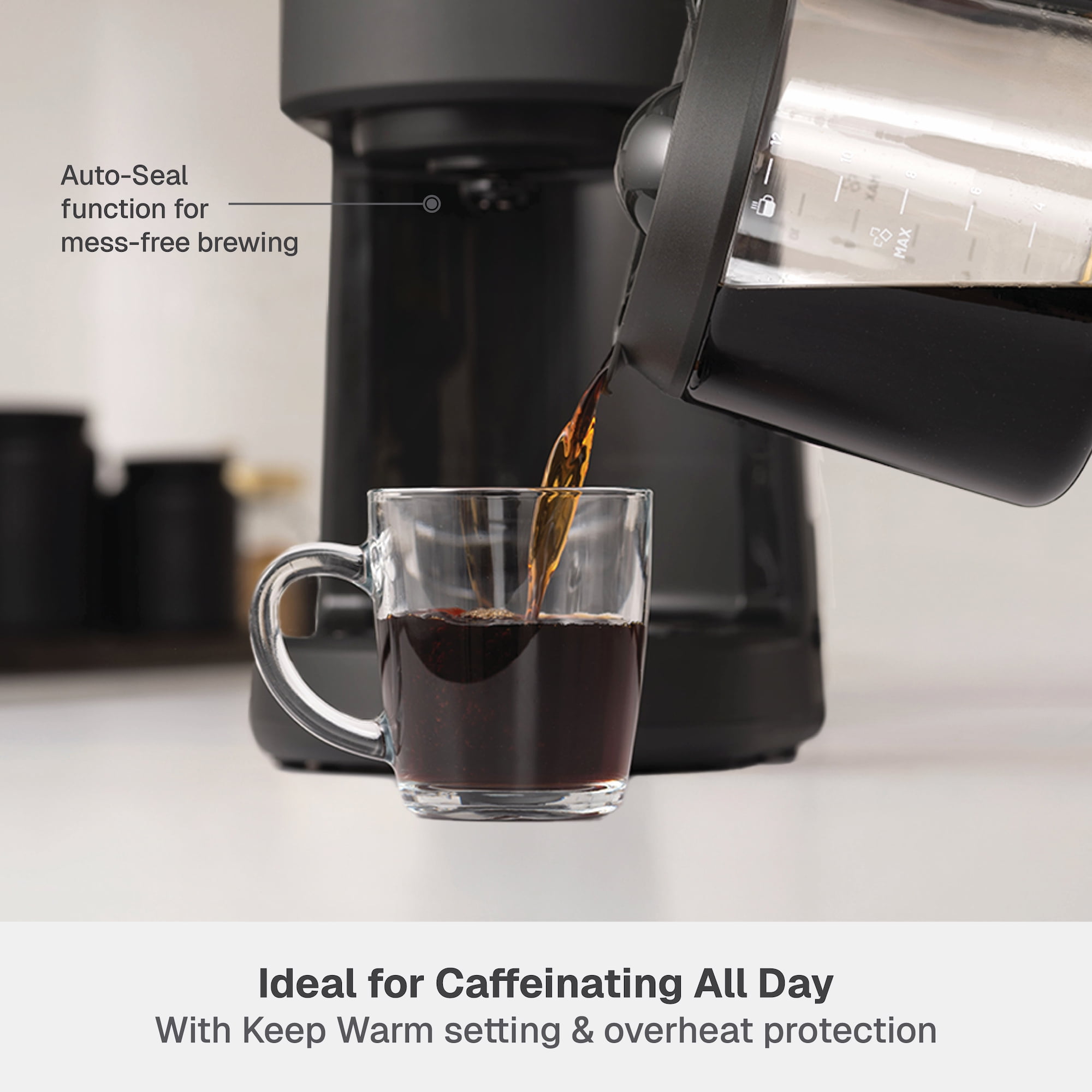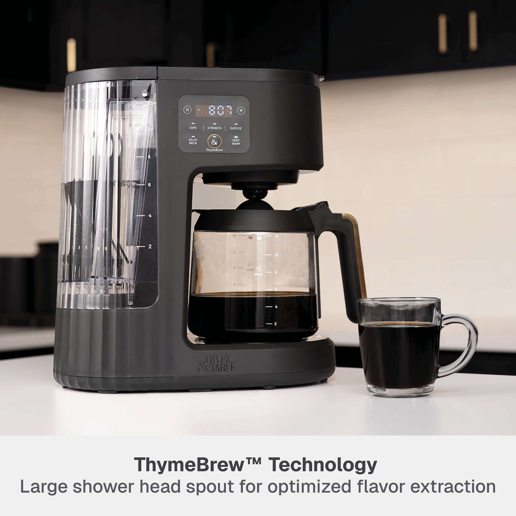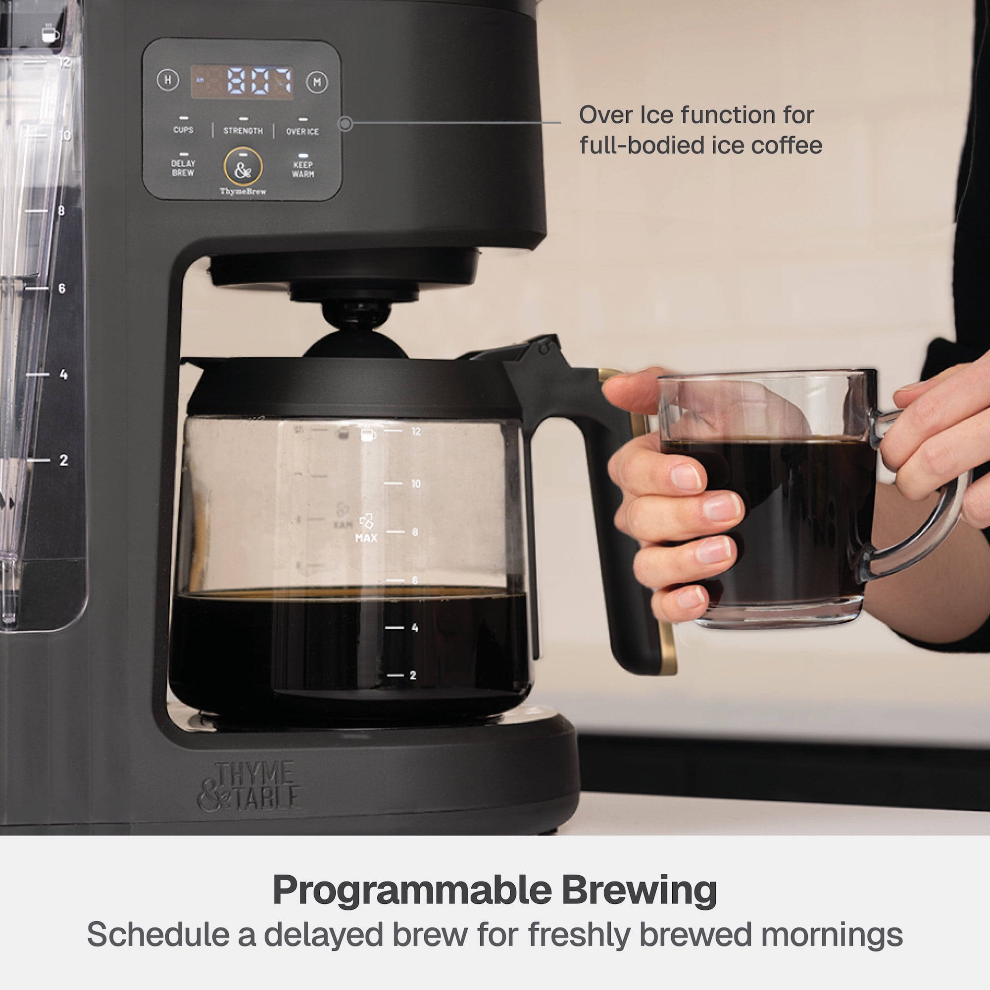 Smoother. Bolder. Sleeker. Elevate your coffee experience with the Thyme&Table 12-cup programmable Drip Coffee Maker featuring an XL shower head spout that fully extracts flavor from your grounds. Enjoy programmable brewing options, an over ice mode, and adjustable cup sizes for a personalized brew.Drip Coffee Maker Slate.
