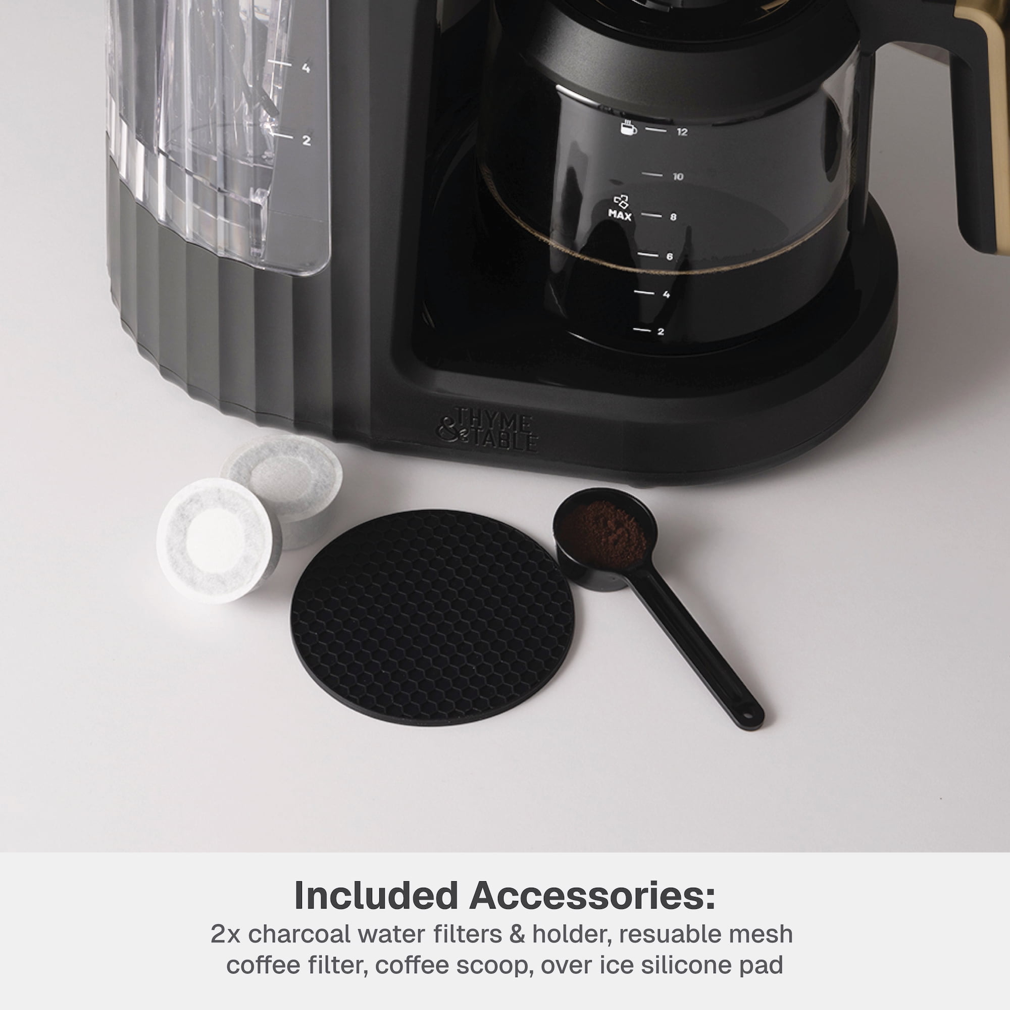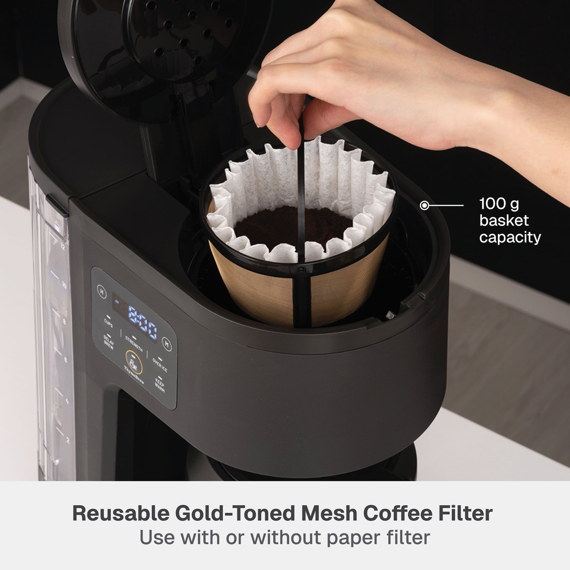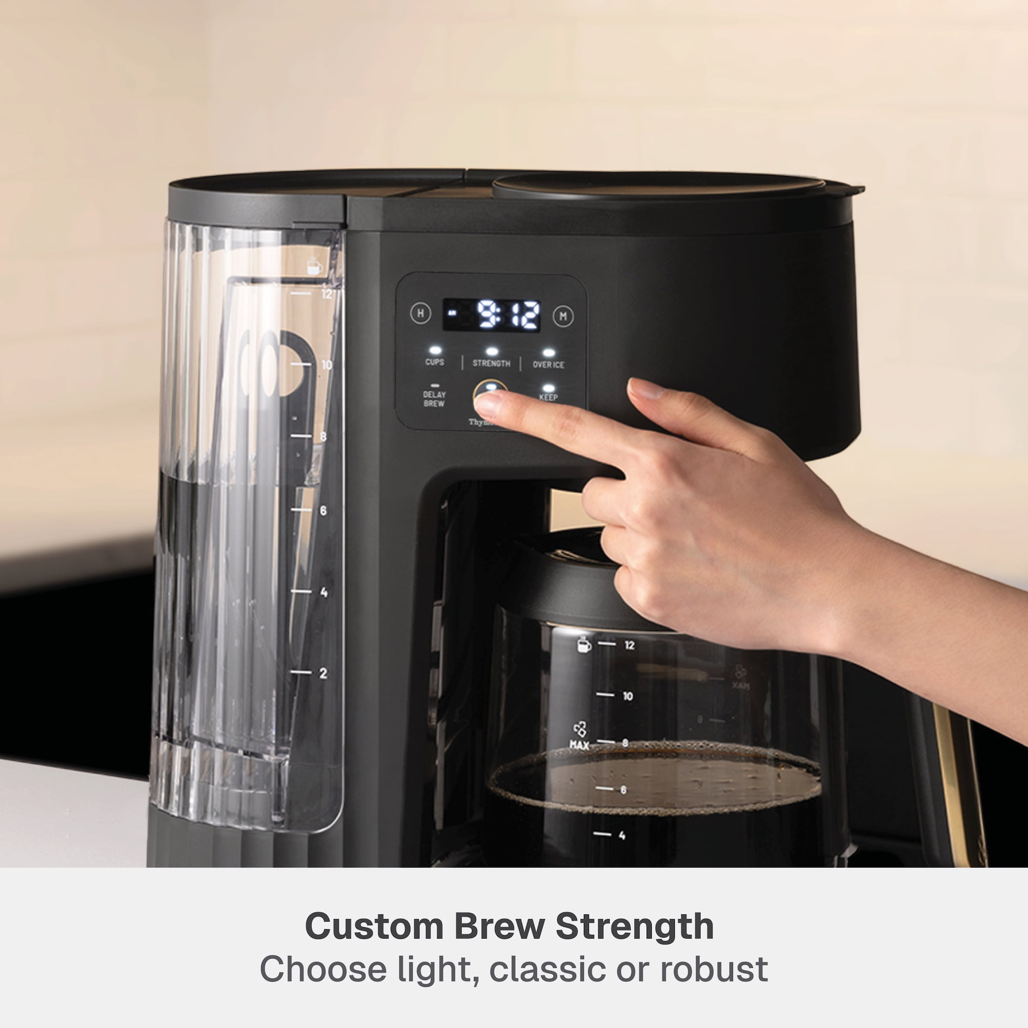 ThymeBrew™ Technology & XL shower head spout for max flavor extraction Programmable brewing 4 brewing modes: Light, Classic, Robust & Over Ice Over Ice preset for brewing coffee that easily chills without diluting flavor Removable water tank (60 oz/1.8 L) to easily clean & refill 100 g basket capacity Keeps warm up to 4 hours Overheat protection system Charcoal filter helps prevent impurity build-up & provide a more flavorful cup of coffee Auto-seal function to automatically stop coffee drips when the carafe is removed Borosilicate glass carafe with metal handle to withstand daily use Includes: 2x charcoal water filters & holder, reusable mesh coffee filter, coffee scoop, over ice silicone pad Recipes included for daily inspiration Total product weight: 7.7 lbs Exclusively sold at