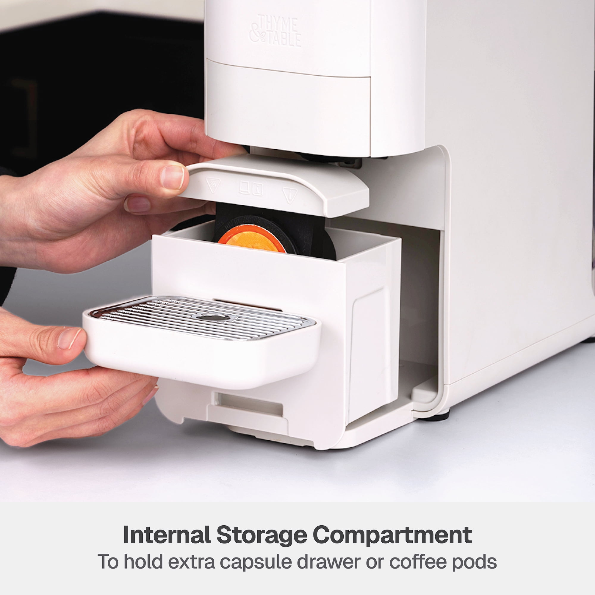 Smoother. Faster. Sleeker. Experience seamless brewing with the Thyme & Table™ Multi-Capsule Machine, featuring intelligent capsule matching. Simply insert your desired drawer & the machine will detect the right way to brew with corresponding presets. Customize your brewing by selecting the volume & moving the adjustable drip tray. The compact, versatile design is ideal for efficient brewing, especially in small spaces.