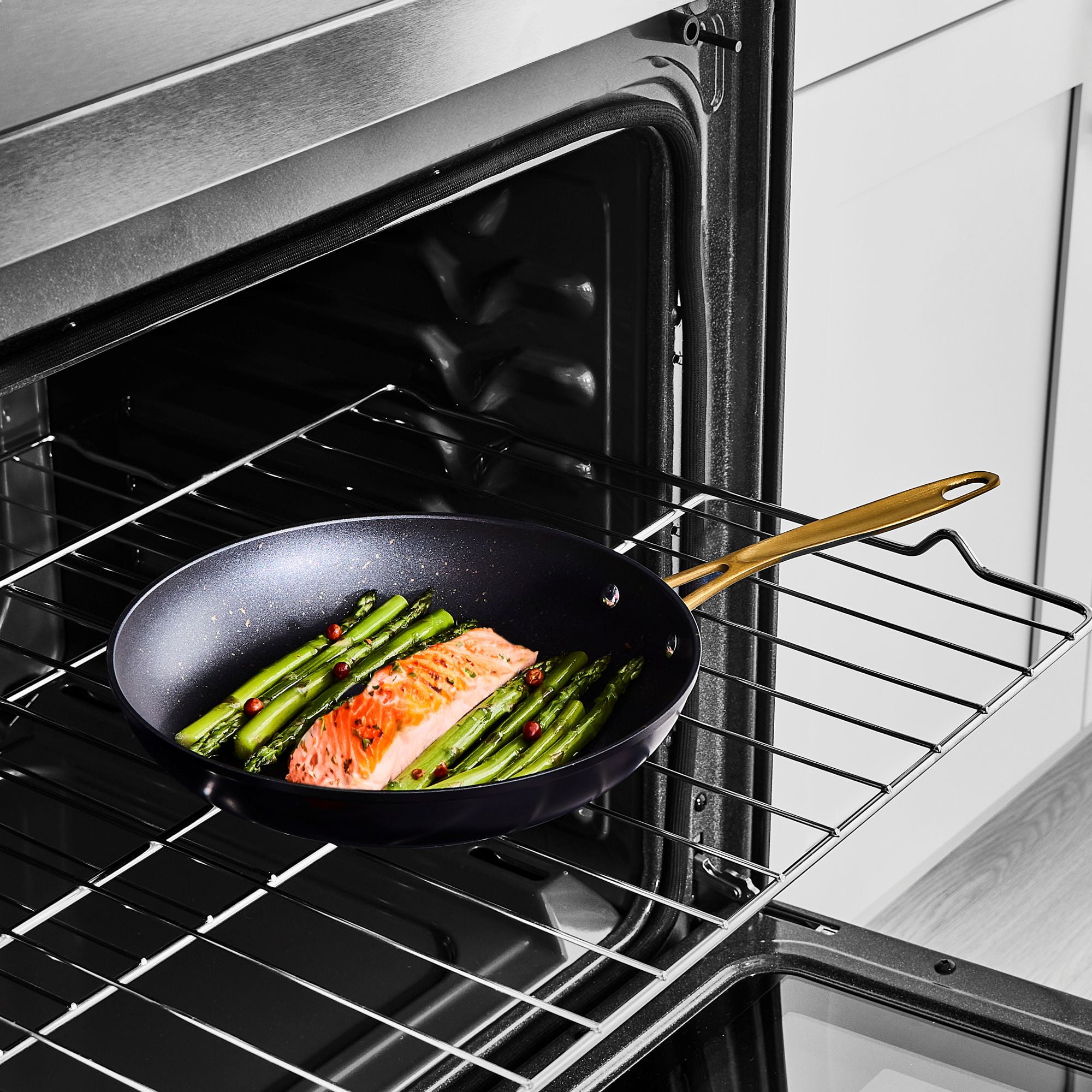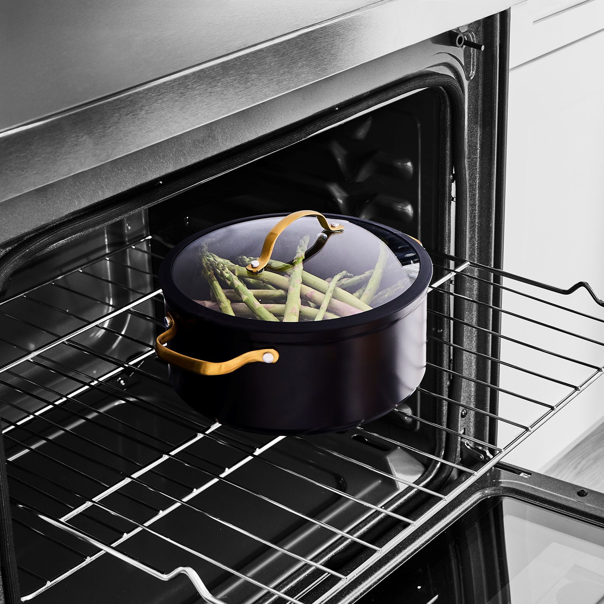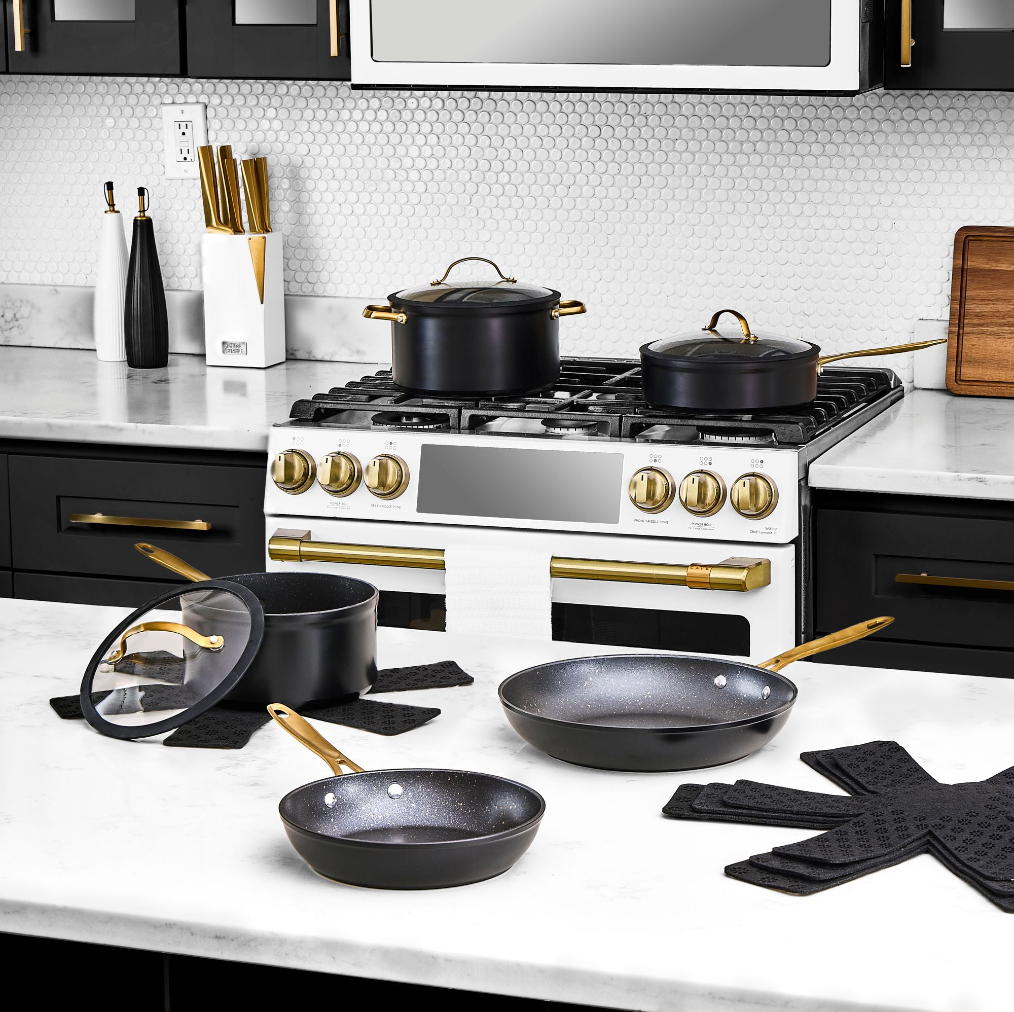 Elevate your kitchen with high-quality cookware and style Durable Cookware made with aluminum Healthier Cooking due to non-stick coating Suitable for all Cooktops; gas, electric, induction, ceramic, and Oven Safe Top Notch cooking experience under $100 Thyme & Table 12-Piece Ceramic Non-Stick Signature Cookware Set, Black and Gold Speckle