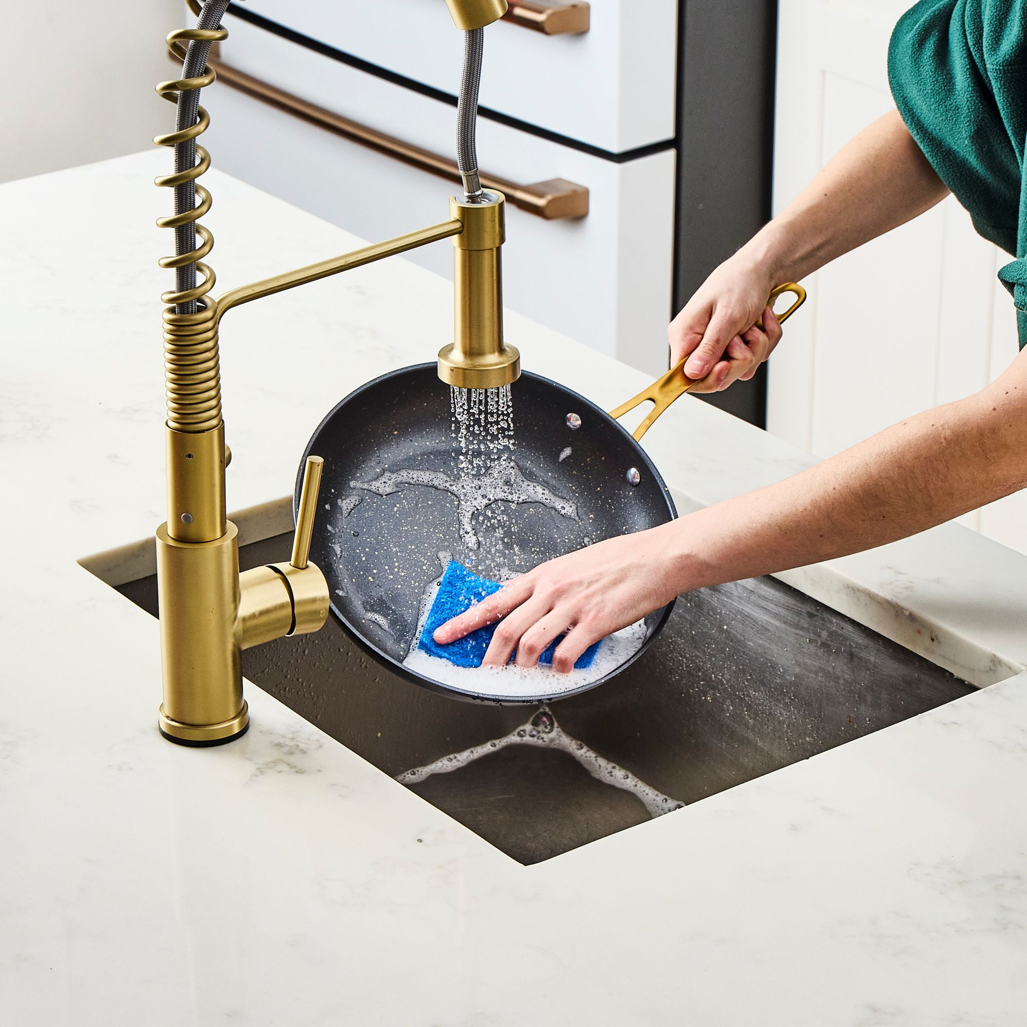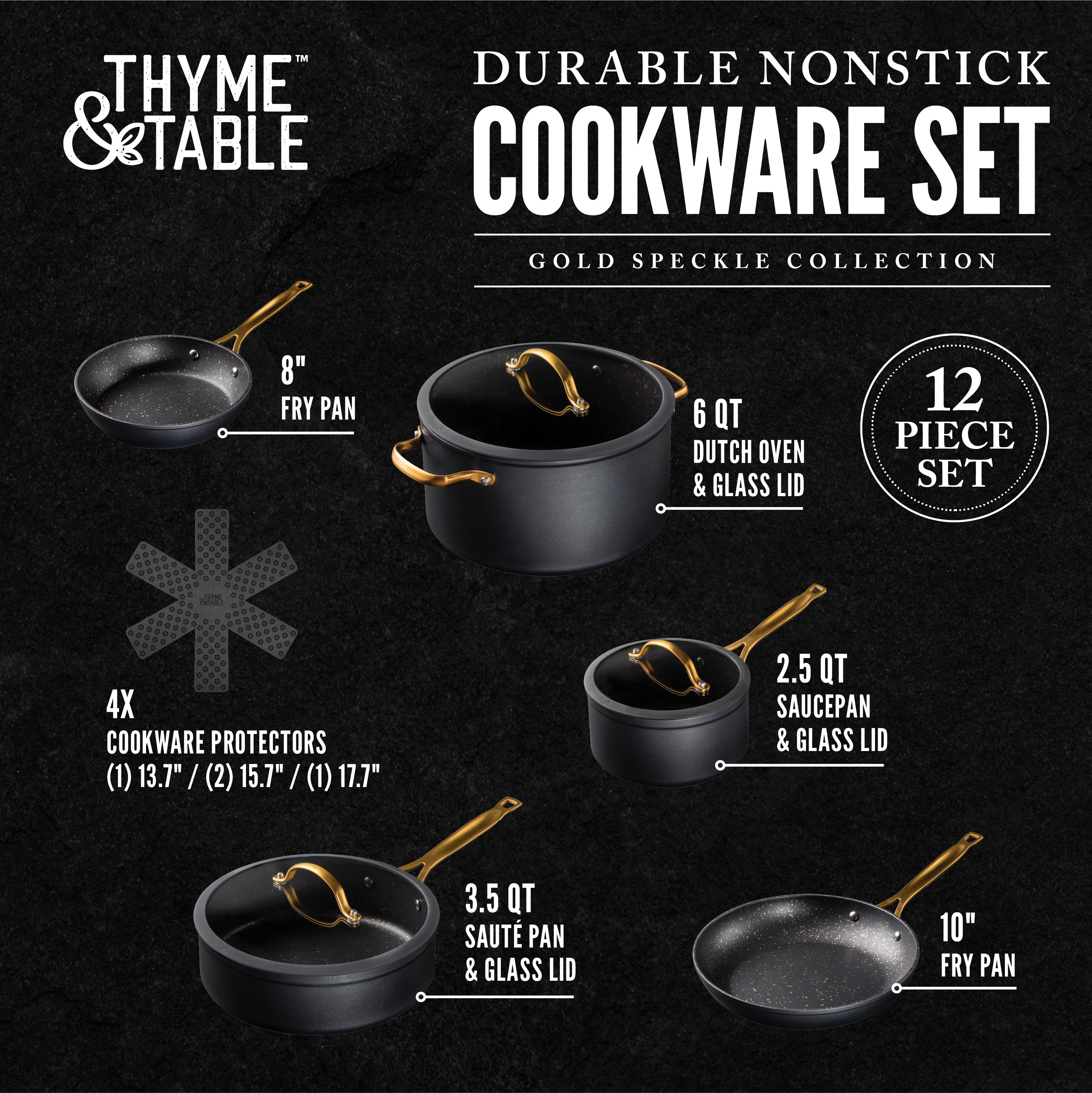 Meet your new Signature kitchen tool, Thyme & Table 12-Piece Ceramic Non-Stick Signature Cookware Set, elegantly designed in black with gold speckle. This set is the perfect blend of style and functionality, ensuring a top-notch cooking experience with every use. This set includes a generous 6-quart stock pot, a 2.5-quart saucepan, a 2-quart sauté pan, a 10-inch fry pan, and an 8-inch fry pan, equipping you for any culinary challenge. Additionally, it comes with 4 cookware protectors to keep your investment in pristine condition for years to come. Ultimate Engineering: Each piece is crafted to perfection using heavy gauged aluminum, ensuring exceptional results with every dish. Because of its stainless-steel induction base our cookware is engineered for all cooktops, including gas, electric or induction, and oven safe up to 500° Fahrenheit. Healthier Cooking and Non-Stick: The ultimate feature is its non-stick coating, allowing for quick cleanup, and helps to promote healthier cooking with effortless cleanup. Optimal Handling: Designed for ease and precision, our cookware features ergonomic riveted handles that provide superior grip and balance, ensuring safe and effortless maneuvering in the kitchen. Revolutionize your Kitchen: Capable of handling everything from frying and searing to simmering, braising, and boiling, this comprehensive set is designed to revolutionize your cooking experience. Offering versatility and durability in one stylish package, it elevates your kitchen setup. Enhance your culinary creativity with confidence using the Thyme & Table 12-Piece Ceramic Non-Stick Signature Cookware Set, Black and Gold speckle. Use and Care Dishwasher Safe, Handwash Recommended