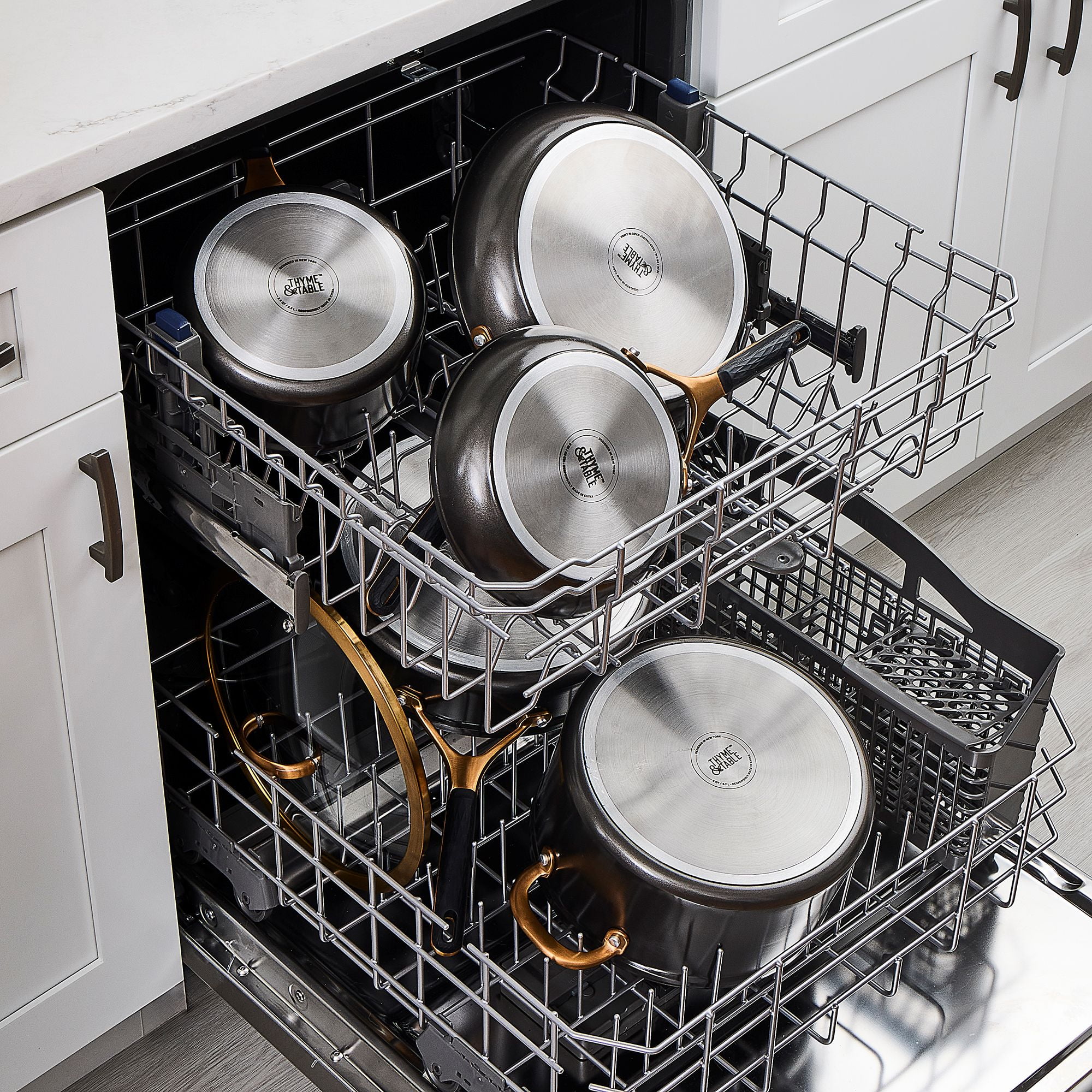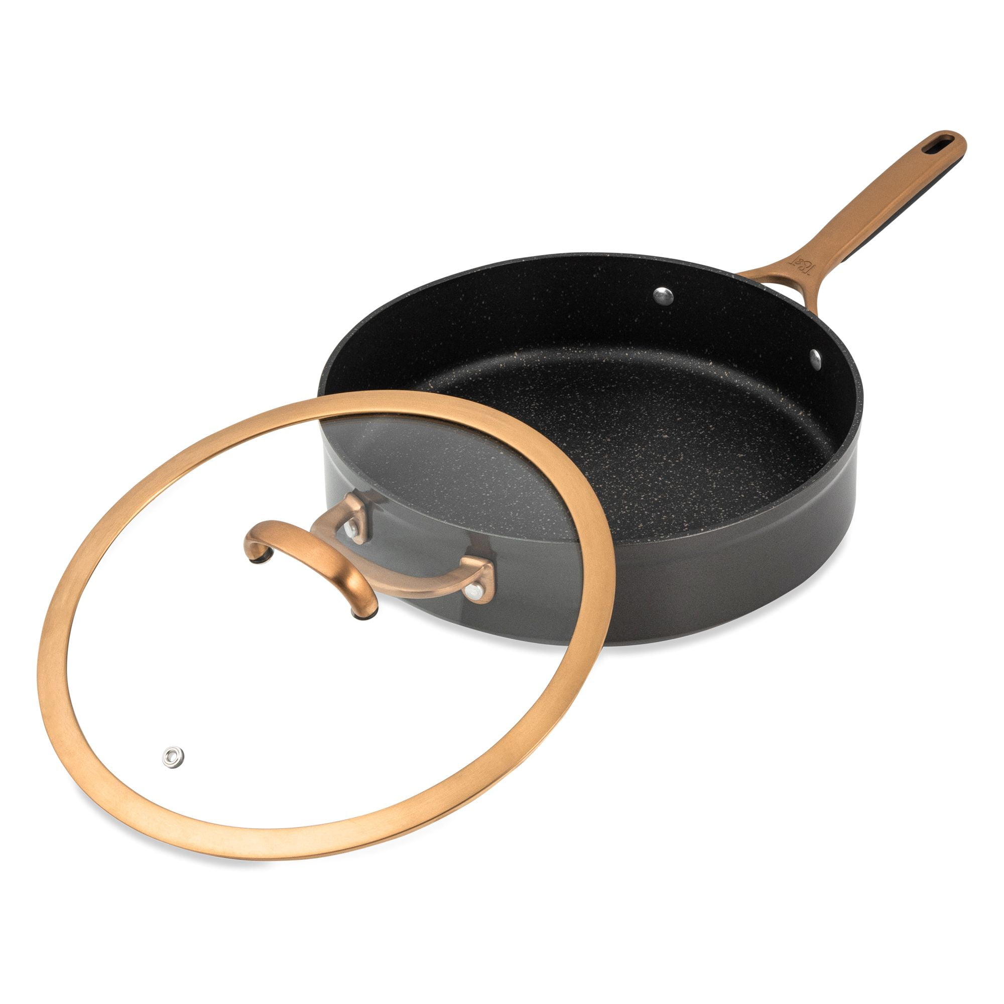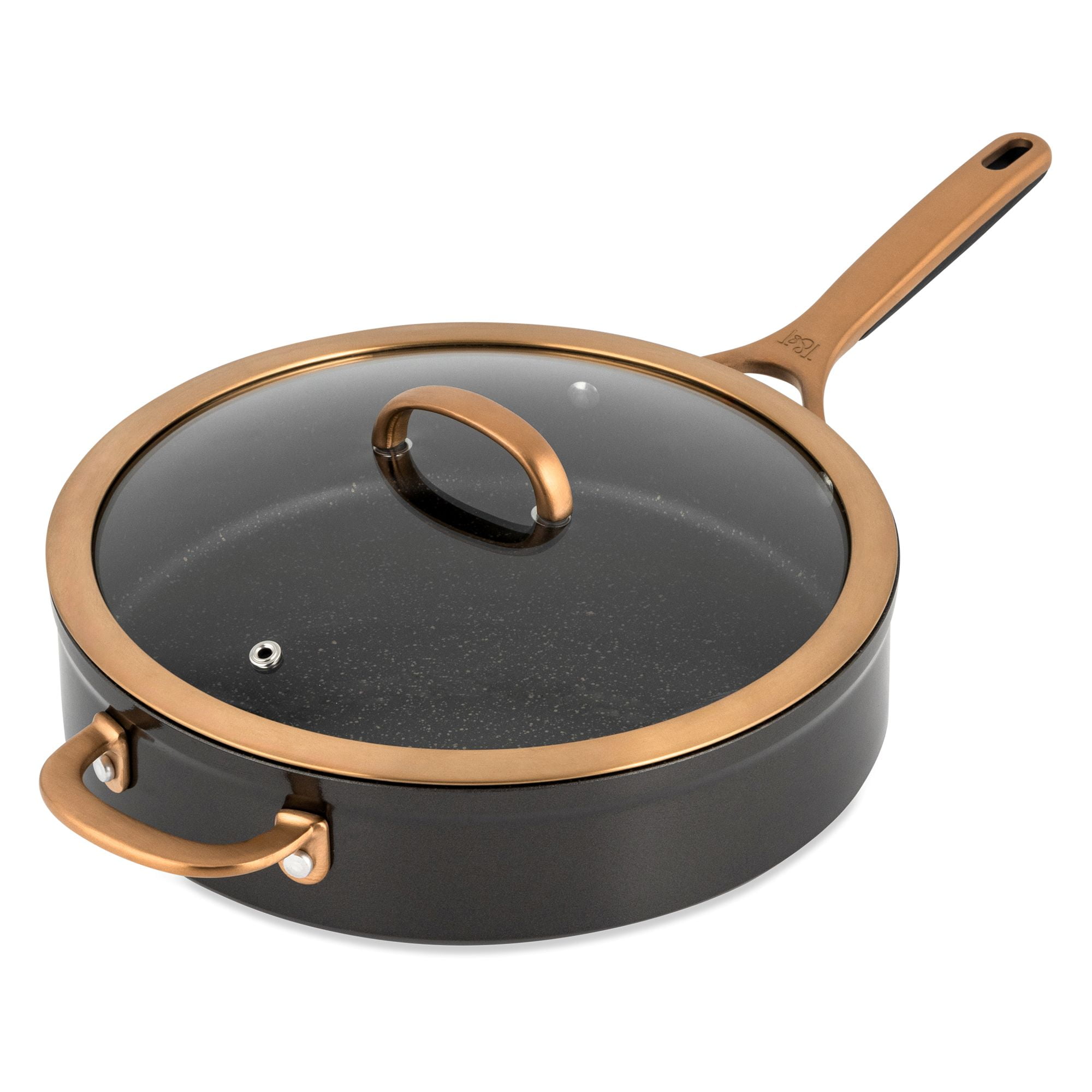 Supreme Durability: The best in cooking performance with premium tri-ply construction cookware. Our break-resistant, domed glass vented lids offer a clear view of your culinary creations while cooking. Ergonomic Design: Designed with you in mind, our cookware features solid cast stainless steel ergonomic handles that provide maximum comfort and control, ensuring a pleasant cooking experience every time. Handles that feature a hanging hole allow you to showcase your high-quality cookware or elevate the aesthetic of your kitchen by giving it a professional and organized look. Stainless Steel Induction Base: The induction base ensures uniform heat distribution across the cookware. This uniformity helps in avoiding hot spots, ensuring that food cooks evenly. Whether you’re a professional chef or a passionate home cook, this set is the perfect tool for creating delicious meals with ease. Non-Stick: Nonstick coating prevents foods from sticking to the surface of the cookware, allowing for easy flipping and turning of foods like pancakes, eggs, and delicate fish fillets. An added health benefit with a nonstick surface, you can cook with less oil or butter, making your meals healthier by reducing the amount of added fats. Make your Kitchen Supreme: With its exceptional quality, elegant design, and superior performance the Thyme & Table Nonstick 12 Piece Supreme Cookware Set, Bronze is suitable for both professional kitchens and home use. Our handles feature a hanging hole that allows you to showcase your high-quality cookware. Its ability to endure rigorous daily cooking tasks ensures that it will last for years to come while elevating your kitchen. Cleaning Care: Dishwasher Safe