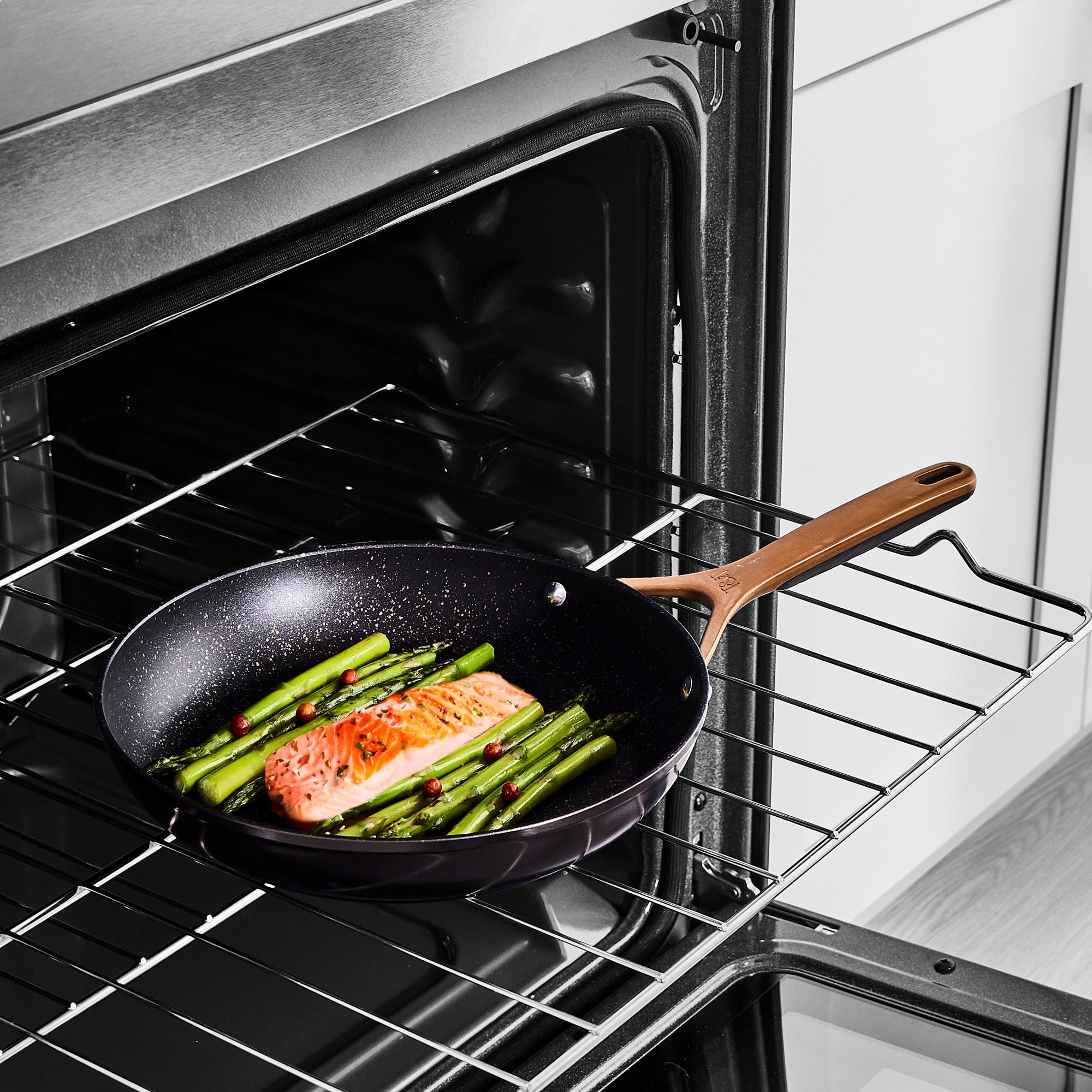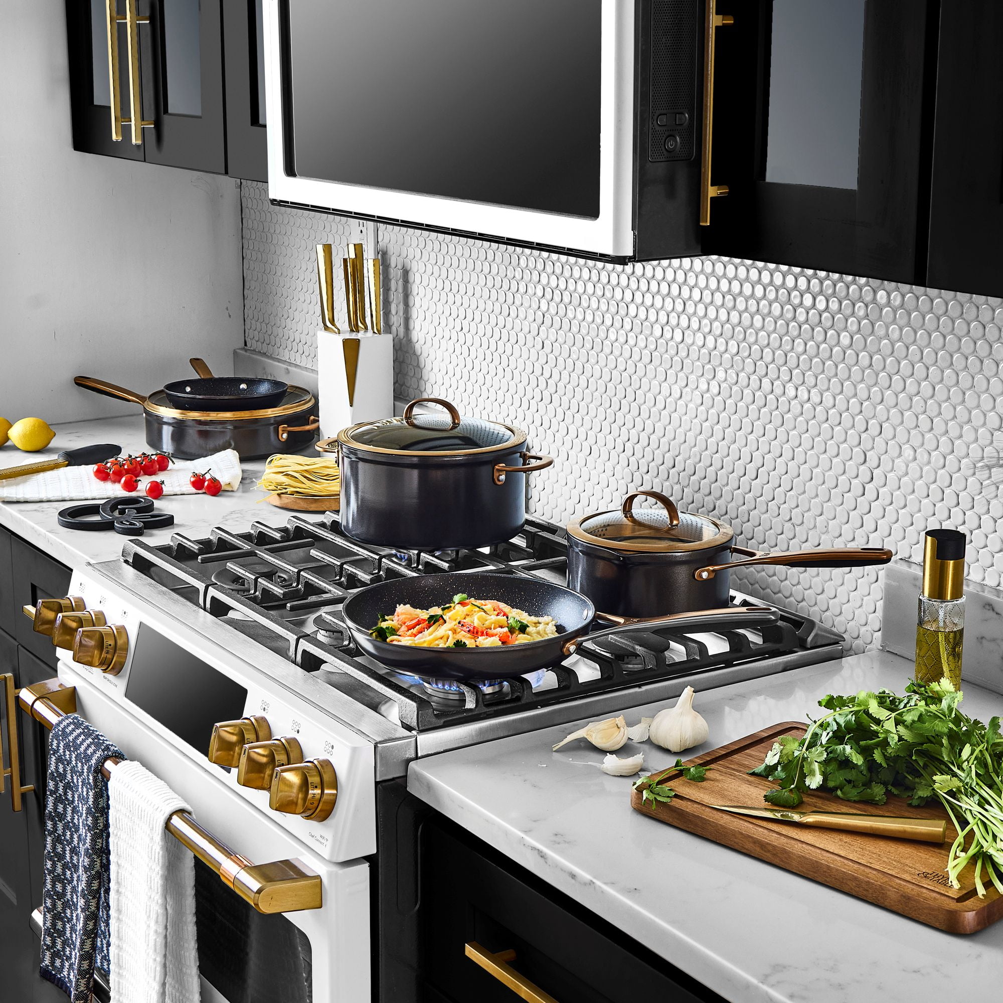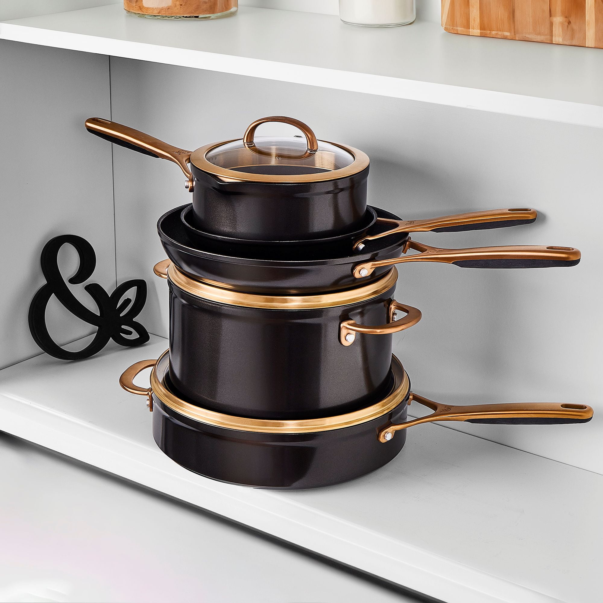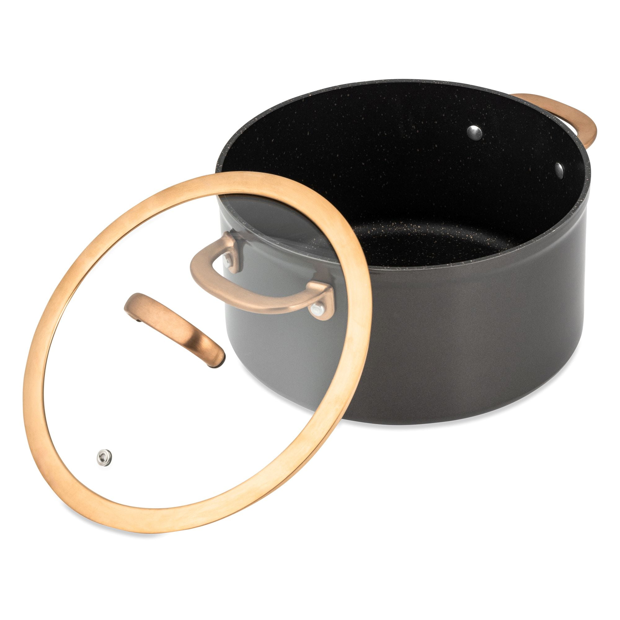 Supreme Durability: The best in cooking performance with premium tri-ply construction cookware. Our break-resistant, domed glass vented lids offer a clear view of your culinary creations while cooking. Ergonomic Design: Designed with you in mind, our cookware features solid cast stainless steel ergonomic handles that provide maximum comfort and control, ensuring a pleasant cooking experience every time. Handles that feature a hanging hole allow you to showcase your high-quality cookware or elevate the aesthetic of your kitchen by giving it a professional and organized look. Stainless Steel Induction Base: The induction base ensures uniform heat distribution across the cookware. This uniformity helps in avoiding hot spots, ensuring that food cooks evenly. Whether you’re a professional chef or a passionate home cook, this set is the perfect tool for creating delicious meals with ease. Non-Stick: Nonstick coating prevents foods from sticking to the surface of the cookware, allowing for easy flipping and turning of foods like pancakes, eggs, and delicate fish fillets. An added health benefit with a nonstick surface, you can cook with less oil or butter, making your meals healthier by reducing the amount of added fats. Make your Kitchen Supreme: With its exceptional quality, elegant design, and superior performance the Thyme & Table Nonstick 12 Piece Supreme Cookware Set, Bronze is suitable for both professional kitchens and home use. Our handles feature a hanging hole that allows you to showcase your high-quality cookware. Its ability to endure rigorous daily cooking tasks ensures that it will last for years to come while elevating your kitchen. Cleaning Care: Dishwasher Safe