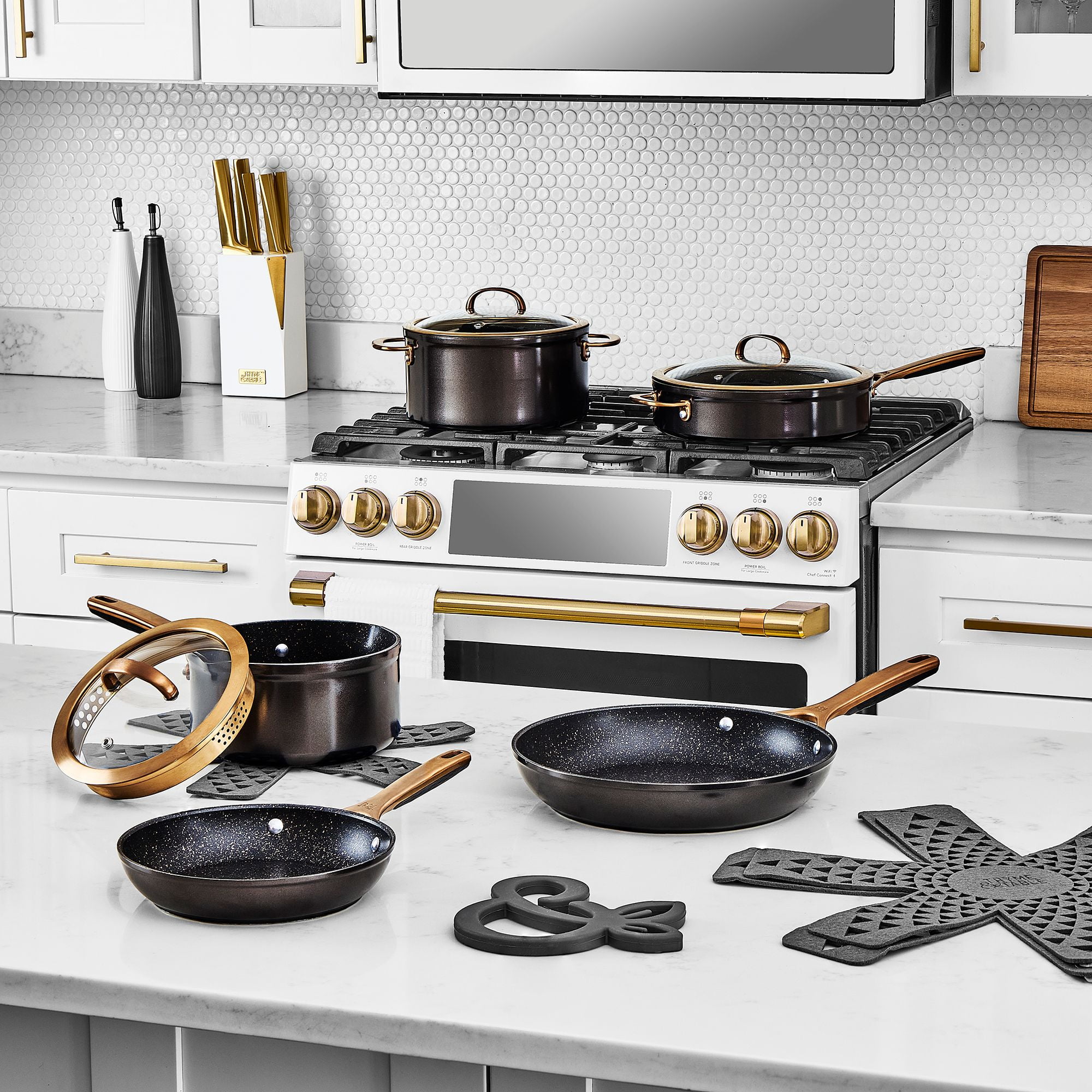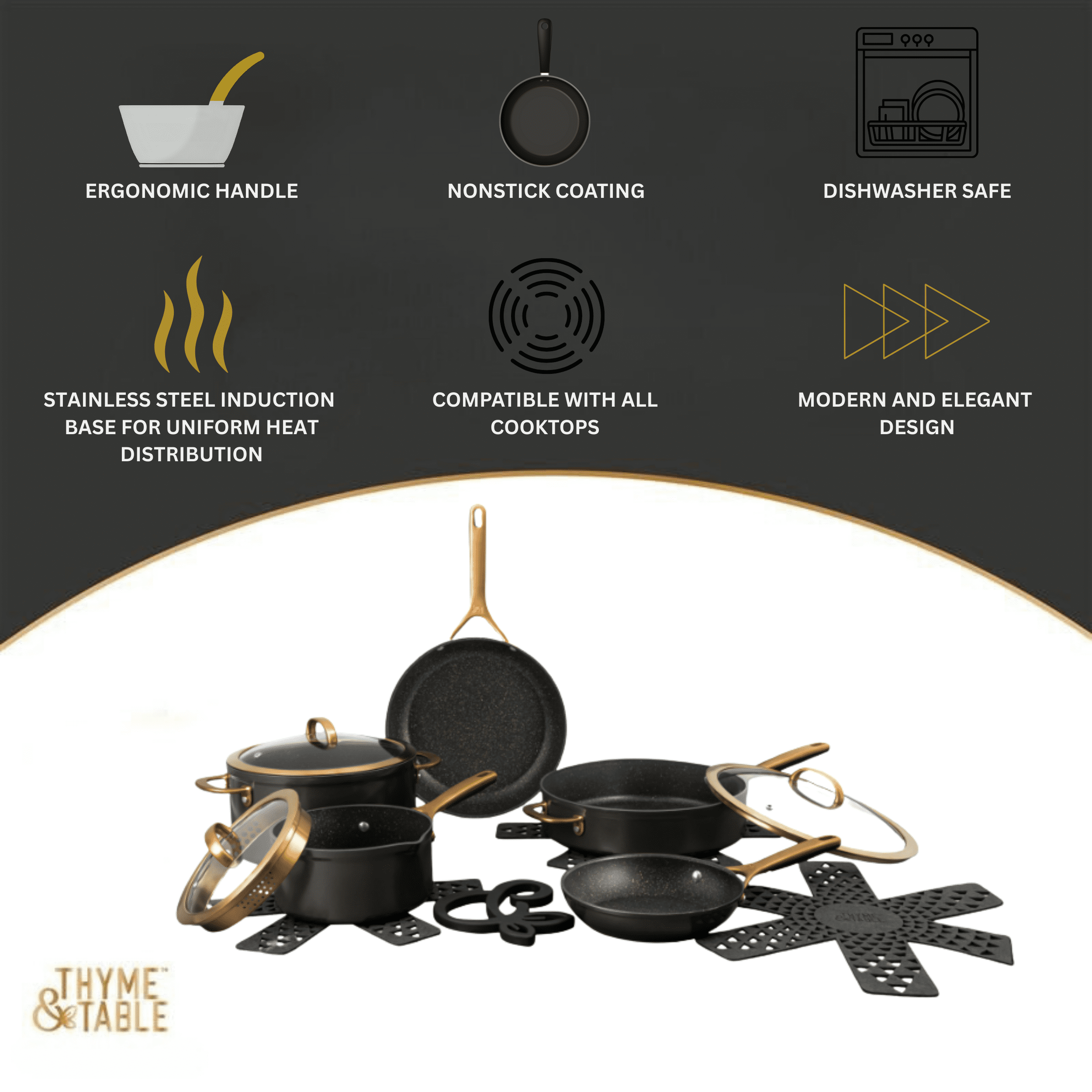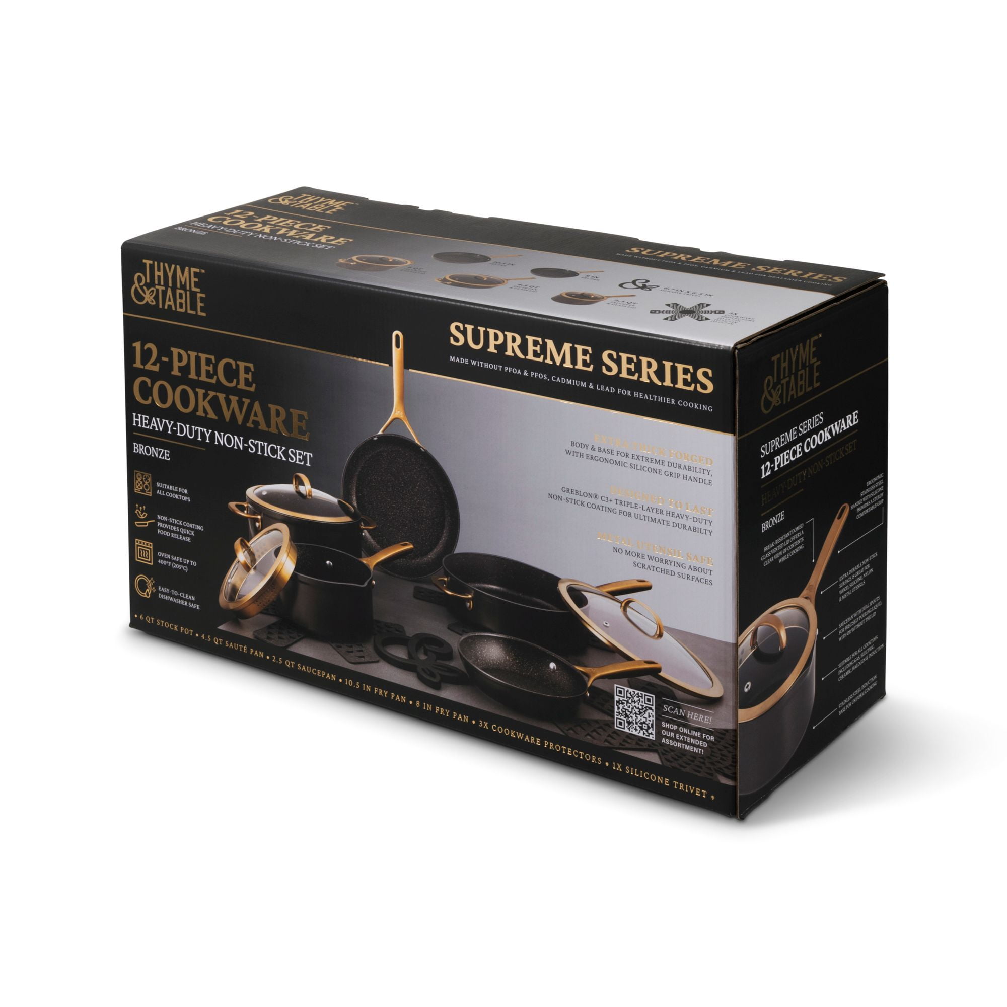 About the Thyme and Table 12 Piece Supreme Cookware Set, Bronze, this Premier Cookware Set includes an 8-inch and 10-inch Fry Pan perfect for searing or sautéing. 6QT Stock Pot perfect for stews or pastas. 4.5QT Sauté pan for a wide range of cooking techniques, including sautéing, frying, searing, braising, and simmering. 2.5QT Saucepan with built-in pour spot to allow for easy and mess-free pouring of liquids. 3 Cookware Protectors and a Silicone Trivet are designed to help maintain the pristine condition of your cookware set over time.