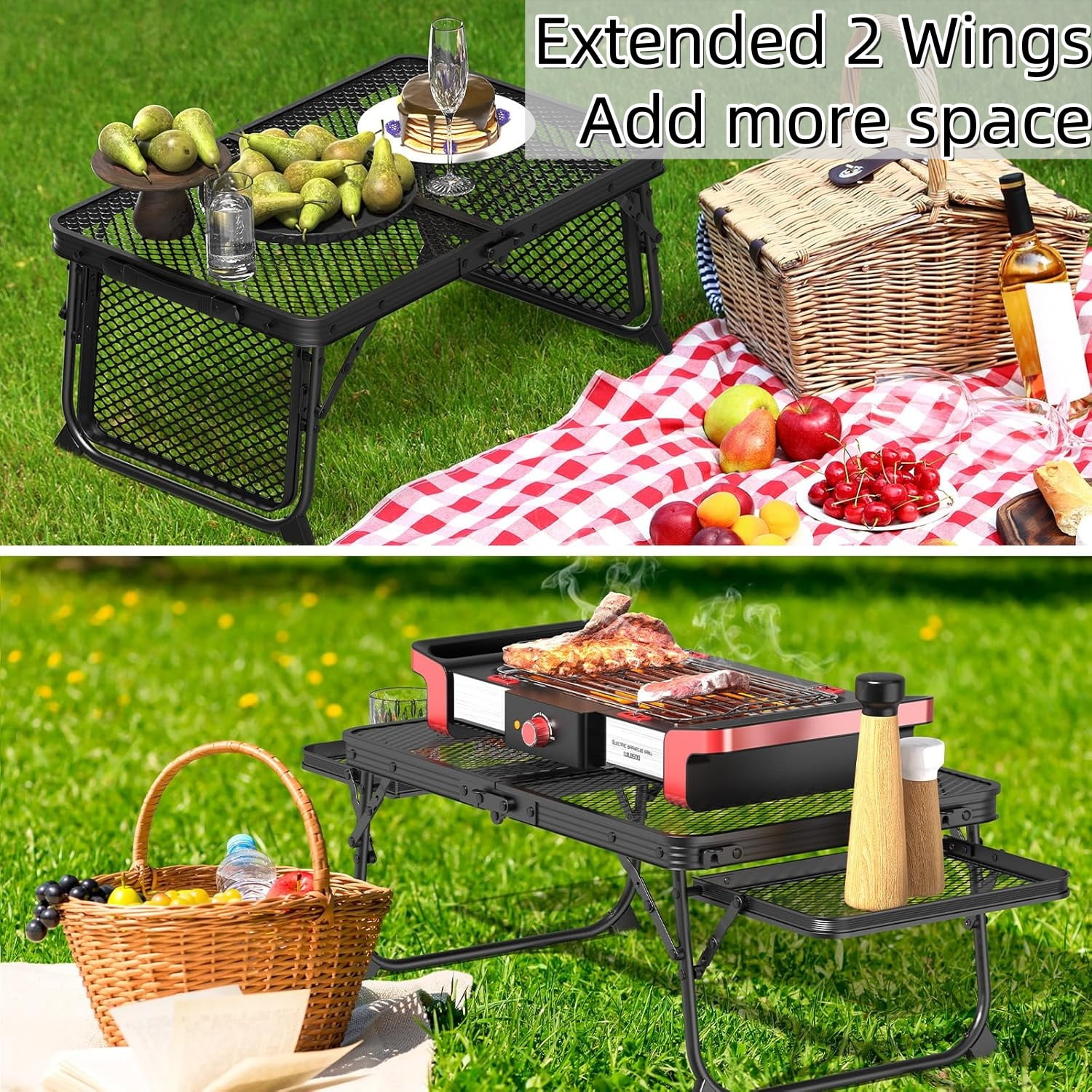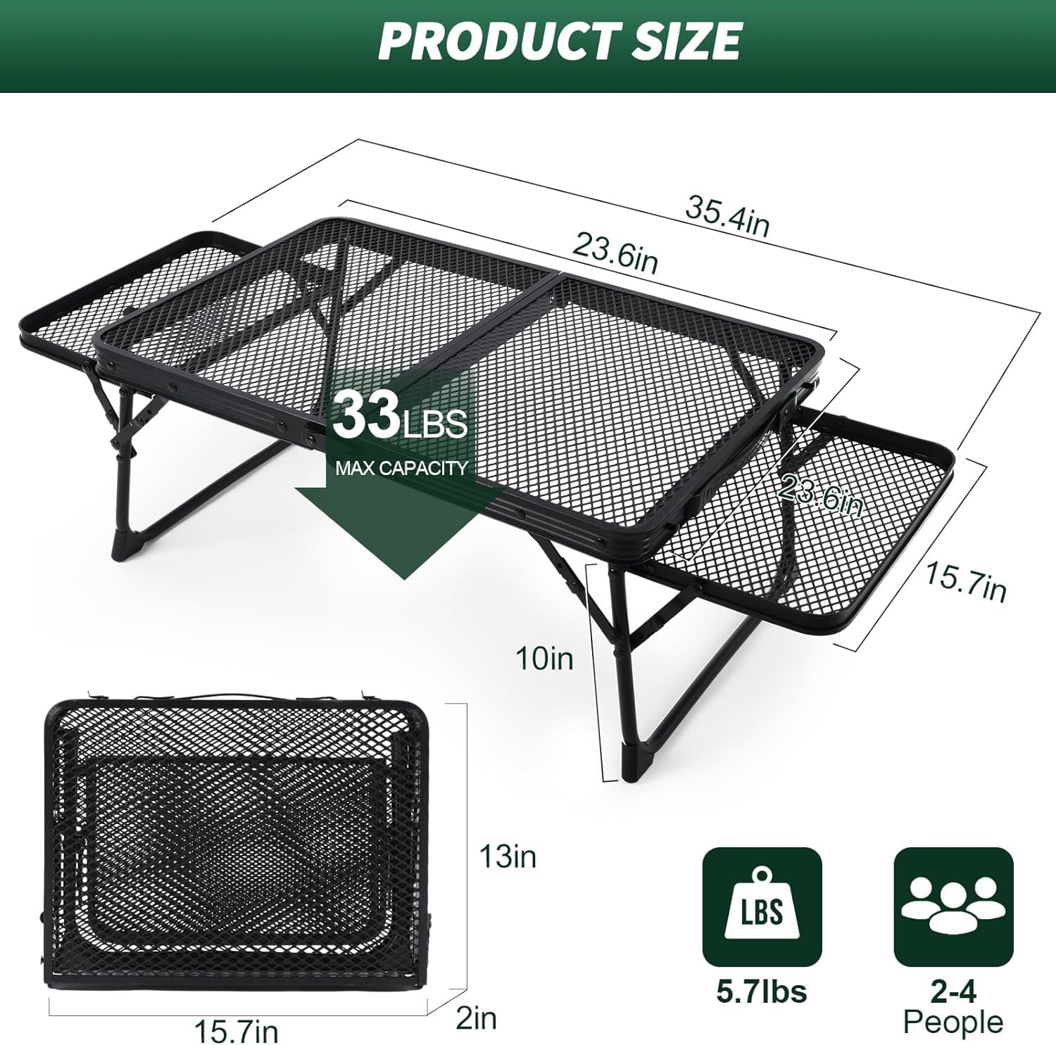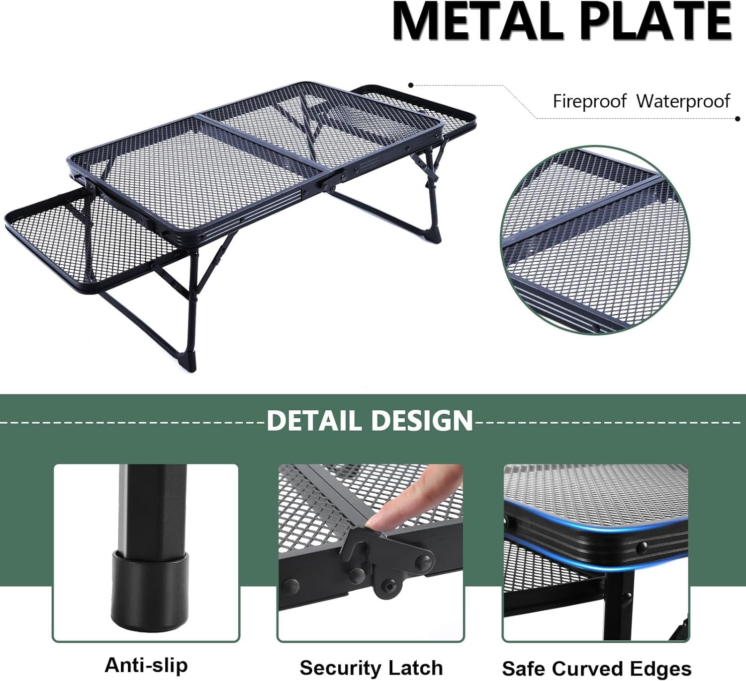 Tiagowell Folding Camping Table Portable Lightweight Collapsible Outdoor Side Table Low Camping Table with Wing Panels: Compact size when folded, but features distinctive 2 wing panels for extra space to hold drinks, stove, snacks, and a coffee maker 2 Side Panels: Larger tabletop compared to other small picnic tables, lightweight and perfect for use on a picnic mat or by a campfire Sturdy Construction: Made with a durable aluminum frame and a sturdy metal steel mesh tabletop, heat and waterresistant for versatile outdoor use Easy to Set Up: Folds easily to fit in the back of your car, RV, or motorcycle; equipped with a compact carrying handle for convenience Versatile Design: Features innovative wing panels for expanded surface area, perfect for food and beverages