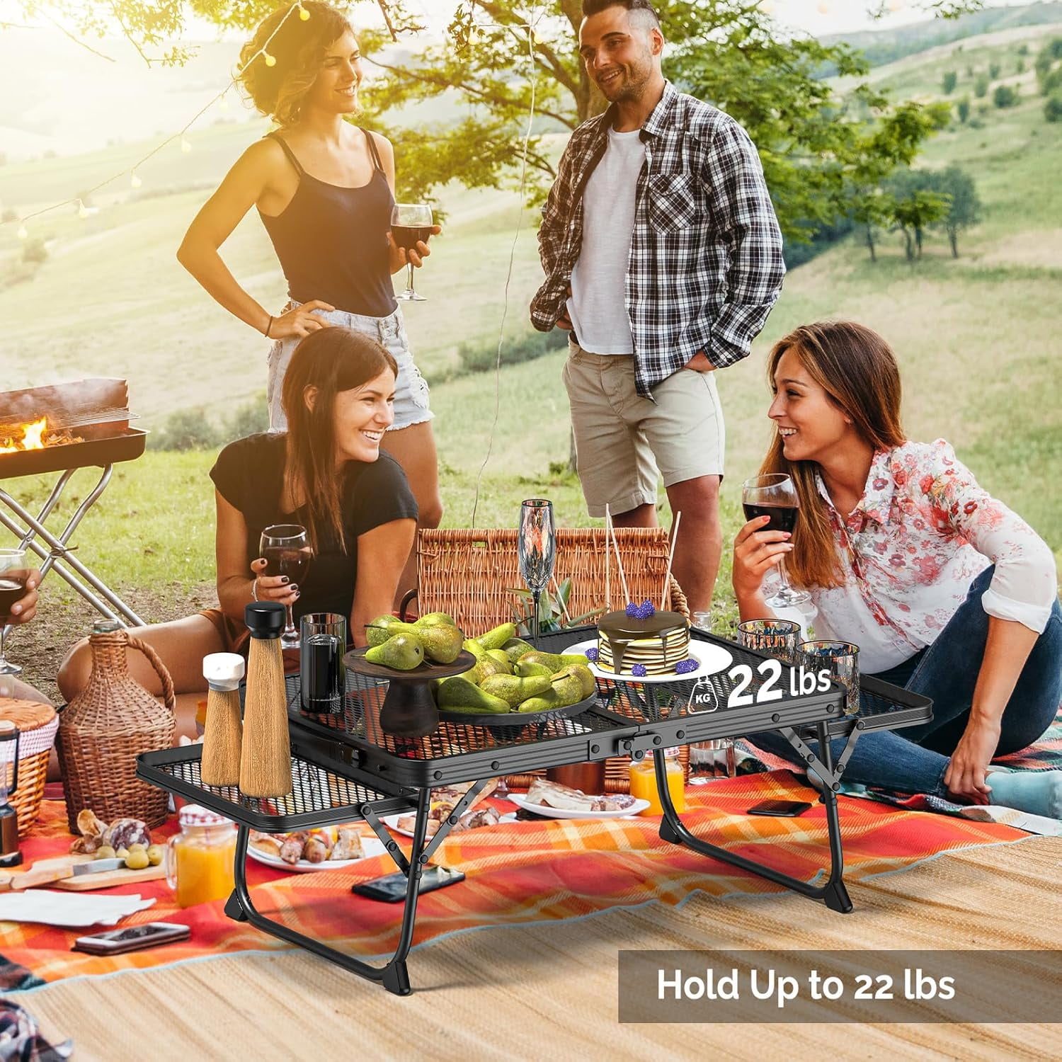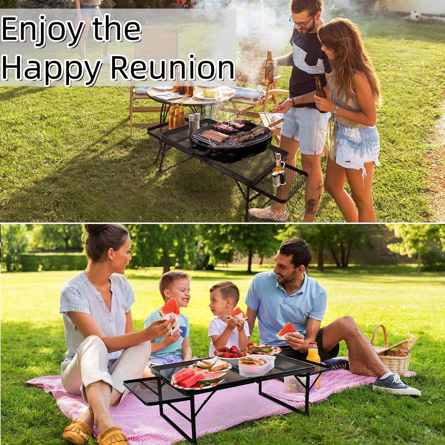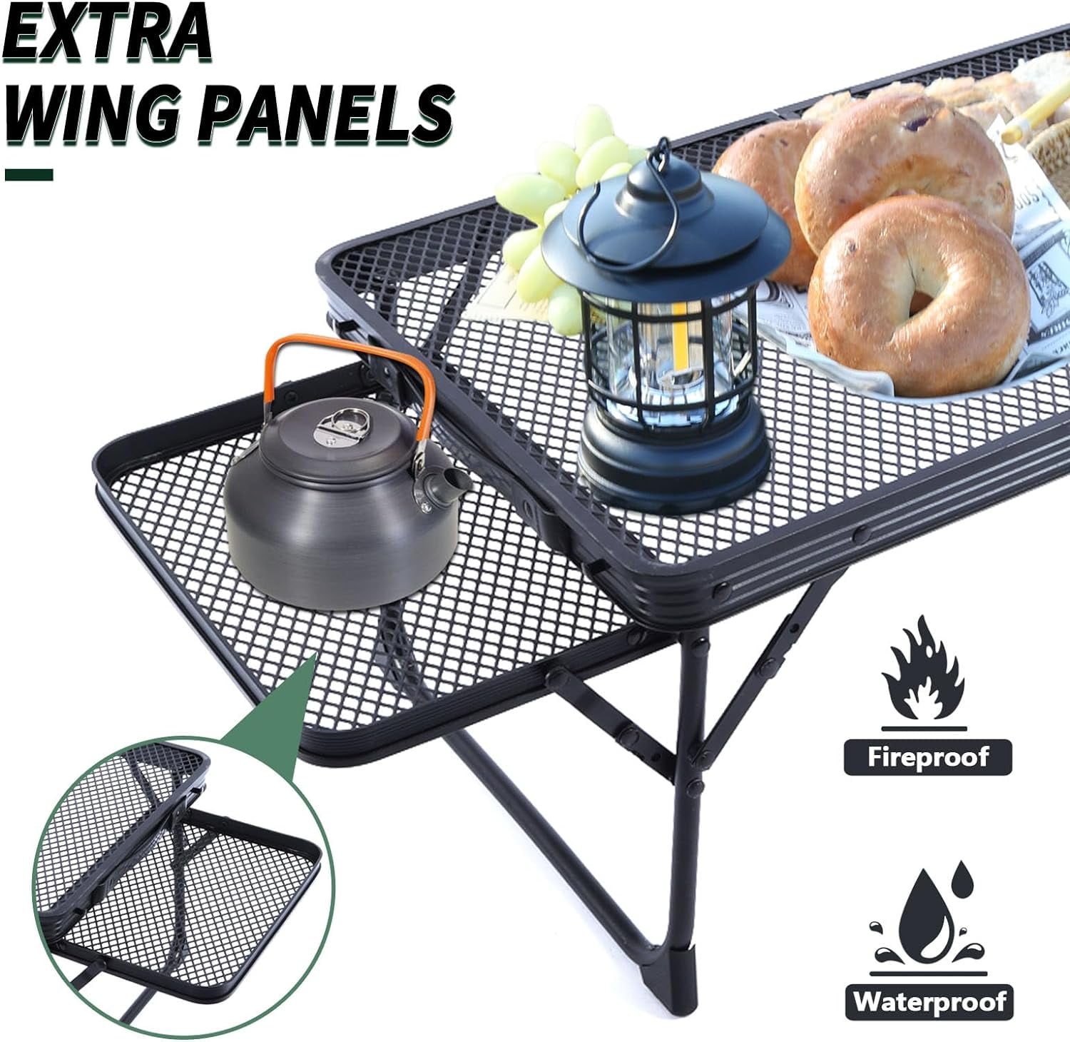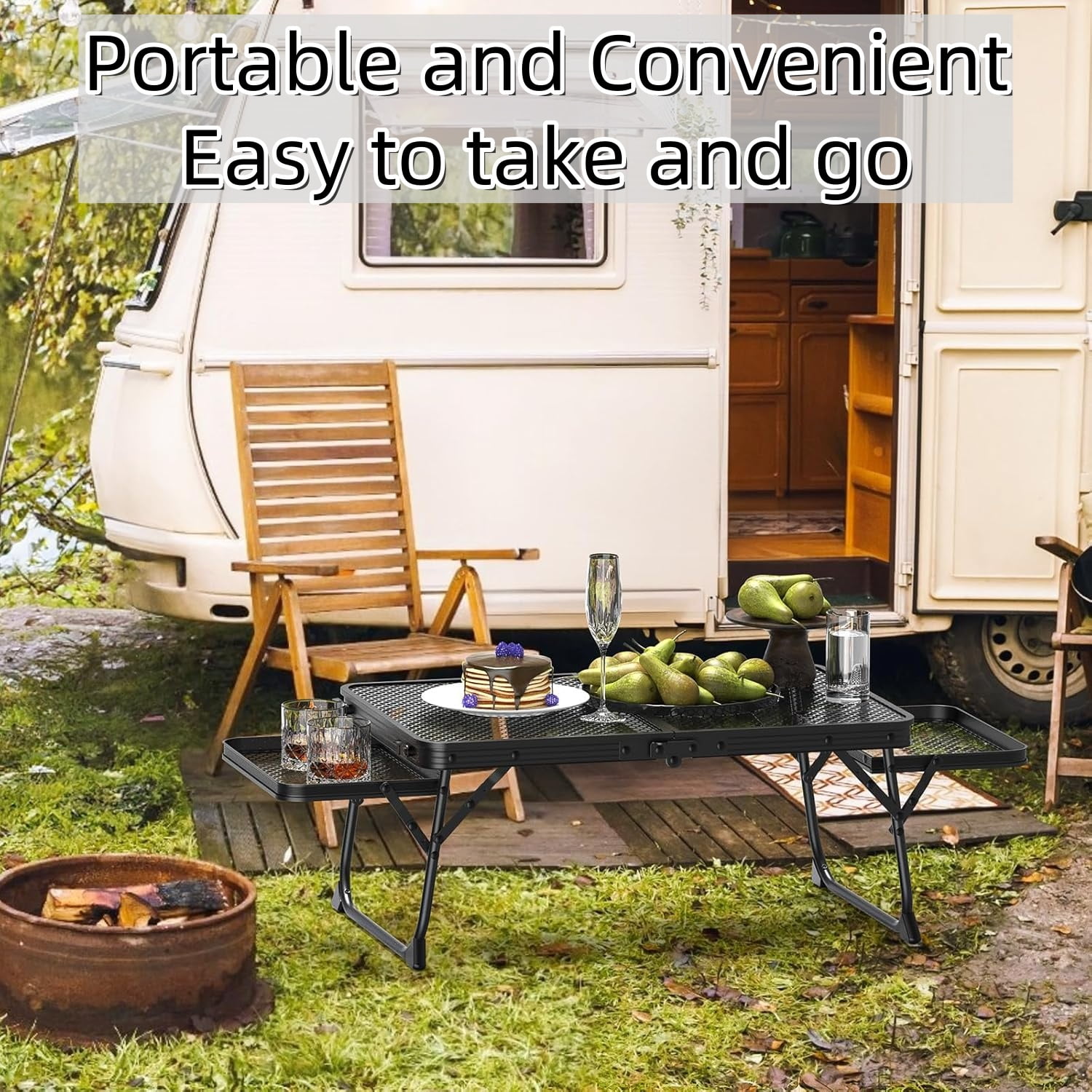 Tiagowell Folding Camping Table Portable Lightweight Collapsible Outdoor Side Table Low Camping Table with Wing Panels: Compact size when folded, but features distinctive 2 wing panels for extra space to hold drinks, stove, snacks, and a coffee maker 2 Side Panels: Larger tabletop compared to other small picnic tables, lightweight and perfect for use on a picnic mat or by a campfire Sturdy Construction: Made with a durable aluminum frame and a sturdy metal steel mesh tabletop, heat and waterresistant for versatile outdoor use Easy to Set Up: Folds easily to fit in the back of your car, RV, or motorcycle; equipped with a compact carrying handle for convenience Versatile Design: Features innovative wing panels for expanded surface area, perfect for food and beverages