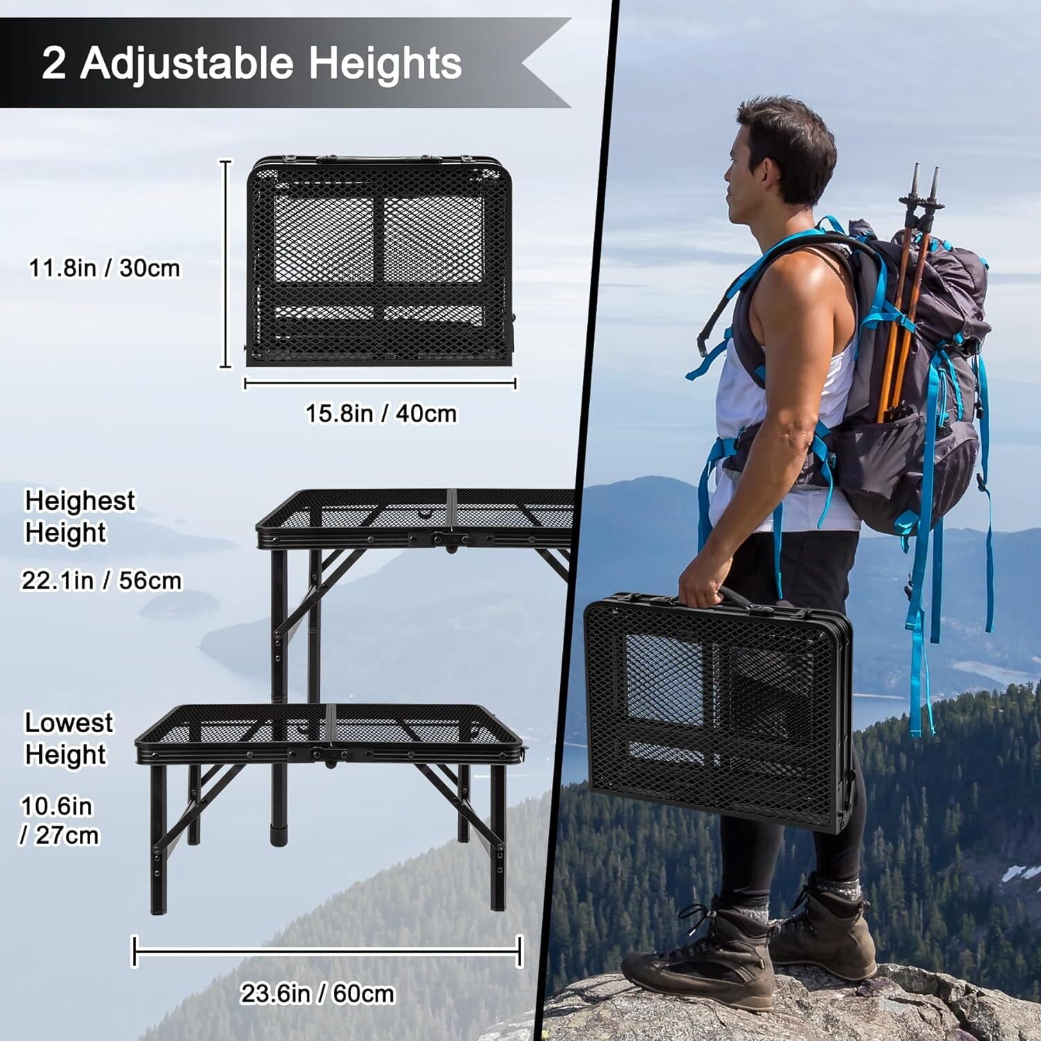 【Adjustable Grill Table】 – From 10.7” to 22.5” inches in height, just by connecting the tube feet can be freely adjusted to a comfortable height, whether you are sitting or standing, it is a perfect match, adults and children are very suitable for you to meet your various needs in any occasion 【Lightweight & Portable】 – Our camping table can be folded into a storage bag after use, measuring 15.8 x 11.8 inches, easy to store, convenient to carry and transport indoors or outdoors, can save a lot of space, can be used in the caravan, barbecue, go out to the beach for a picnic camping, campfire party, etc. 【Sturdy & Durable】 – Grid desktop design with special coating of the picnic table, wear-resistant, waterproof and fire-resistant, but also to avoid rust due to water accumulation, while the hexagonal thickened steel tube legs and the triangular and latches support will greatly increase the load-bearing area and the range of force, improve the support and stability of the entire folding table, has a longer service life 【Convenient to Use】 – This outdoor table can load capacity up to 90 pounds, easy to install and fold without any tools, the unfolding area can reach 23.7*15.8*22.5 inches, enough space, you can set up a small barbecue grill here, enjoy the leisure time on vacation! 【24-hour High-end Service】- This folding grill table is easy to clean, simply wipe it down gently with a rag dampened with water to restore a brand new look. We can guarantee the quality of every product, If in doubt about our foldable table belt, Grovind Customer Support will provide you with a satisfactory answer and lifetime service