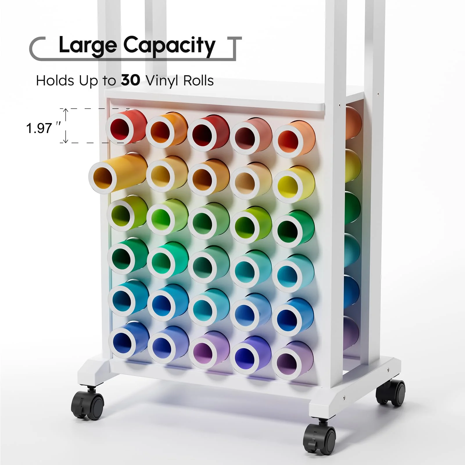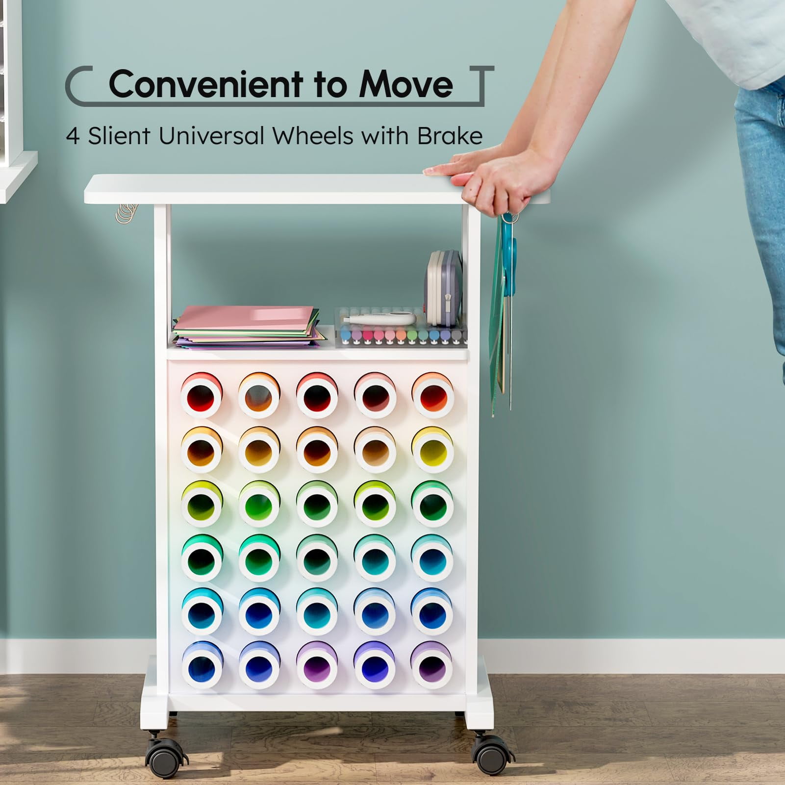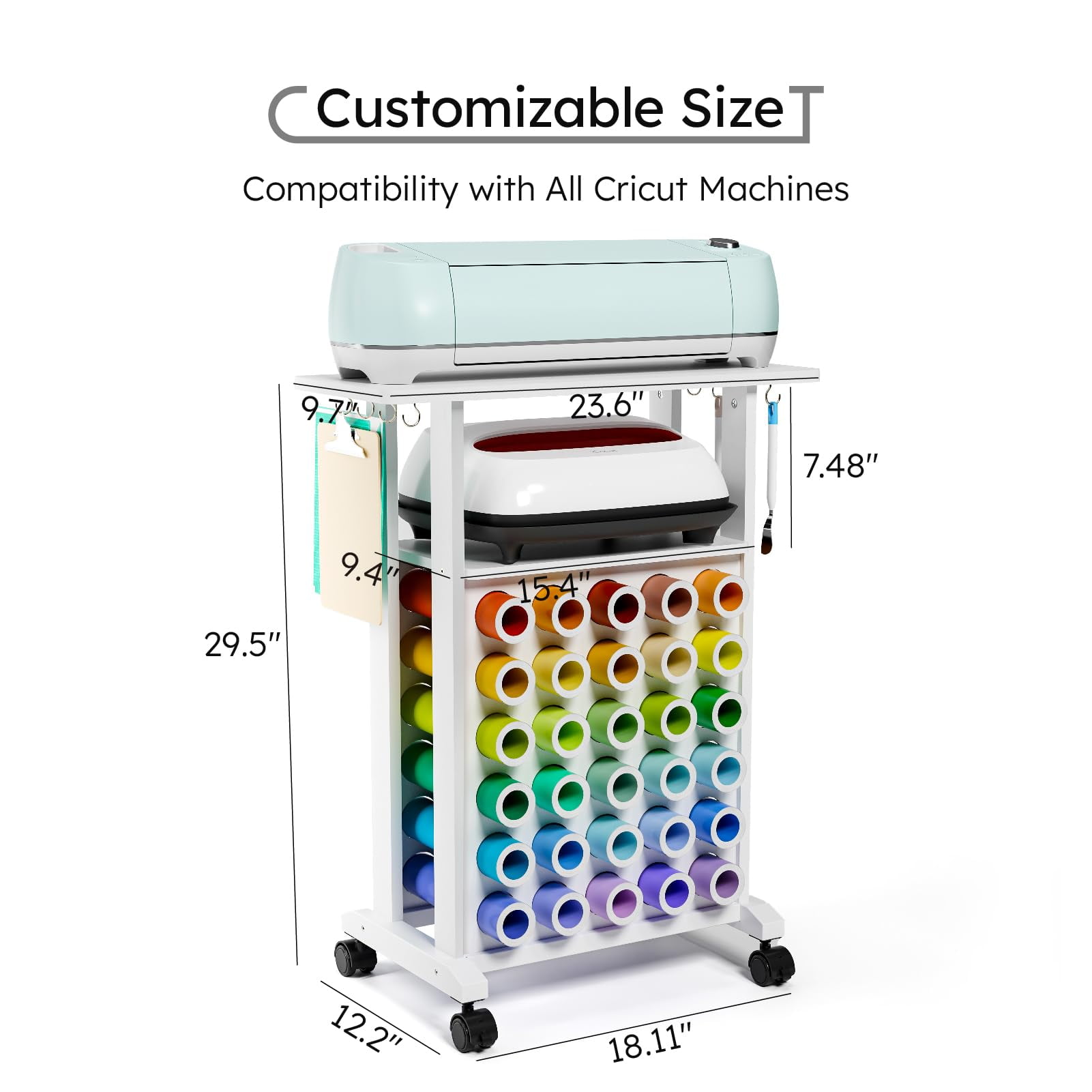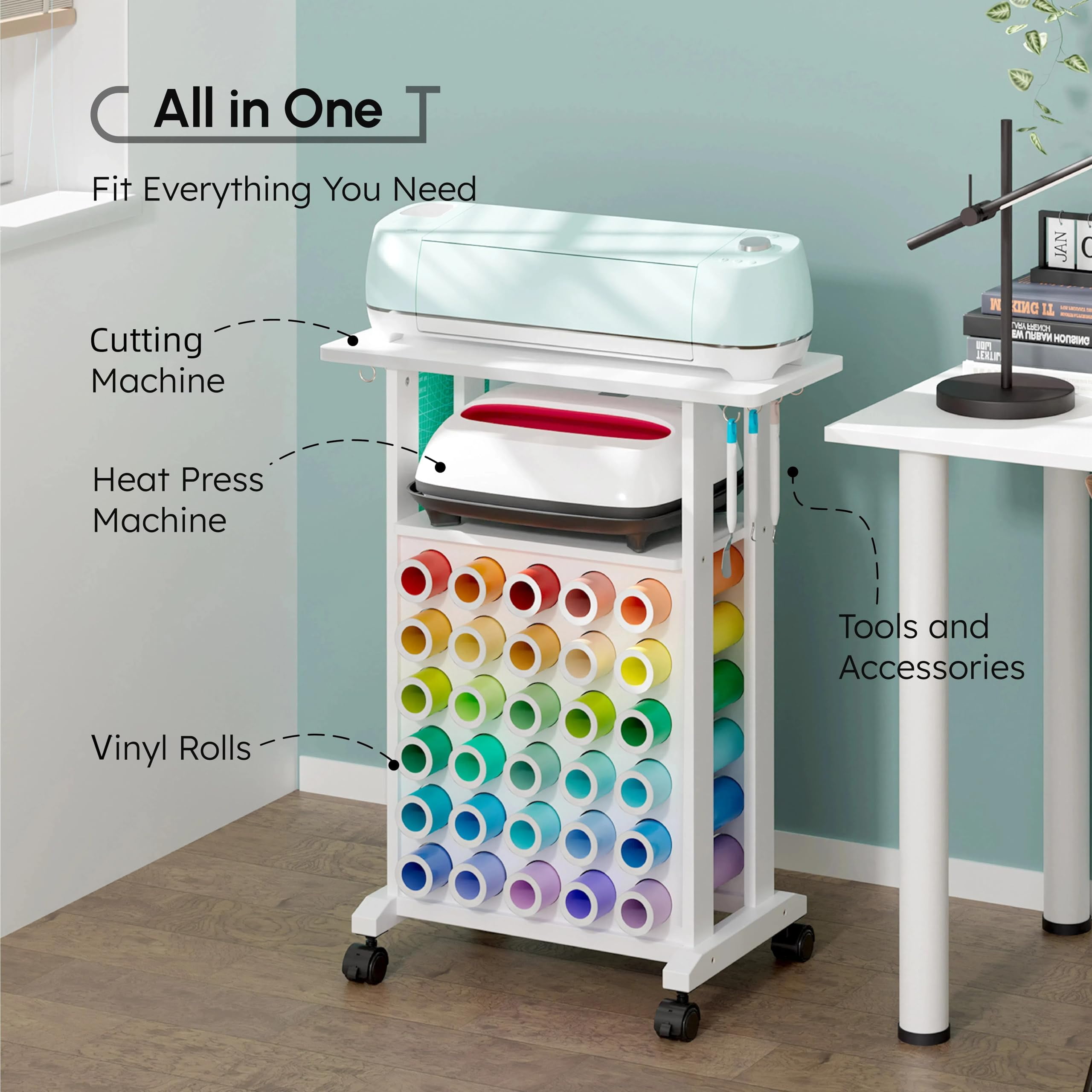 Tianhe Rolling Craft Storage Cart with Vinyl Roll Holder, White Rolling Craft Station: Keep all your crafting essentials organized and within arm’s reach. The cart features four universal wheels that glide smoothly and include brakes for secure placement AllInOne Storage: The top and middle shelves accommodate cutting machines and heat presses, while the lower vinyl roll organizer holds up to 30 vinyl rolls. Includes four hooks on each side for hanging cutting mats and tools Dimensions & Compatibility: Overall dimensions are L23.6″ x D9.7″ x H29.5″. The middle shelf fits heat presses up to 12″ x 10″. Compatible with all Cricut machines, including Cricut Maker and Cricut EasyPress Solid Construction: Made from premium MDF with a waterresistant surface for easy cleaning. Highquality materials ensure a loadbearing capacity of up to 80 lbs, maintaining stability even when fully loaded. Assembly required Space Saving: Compact design helps organize craft items, freeing up workspace. Ideal for crafters and beginners looking to optimize craft room space and simplify the crafting process