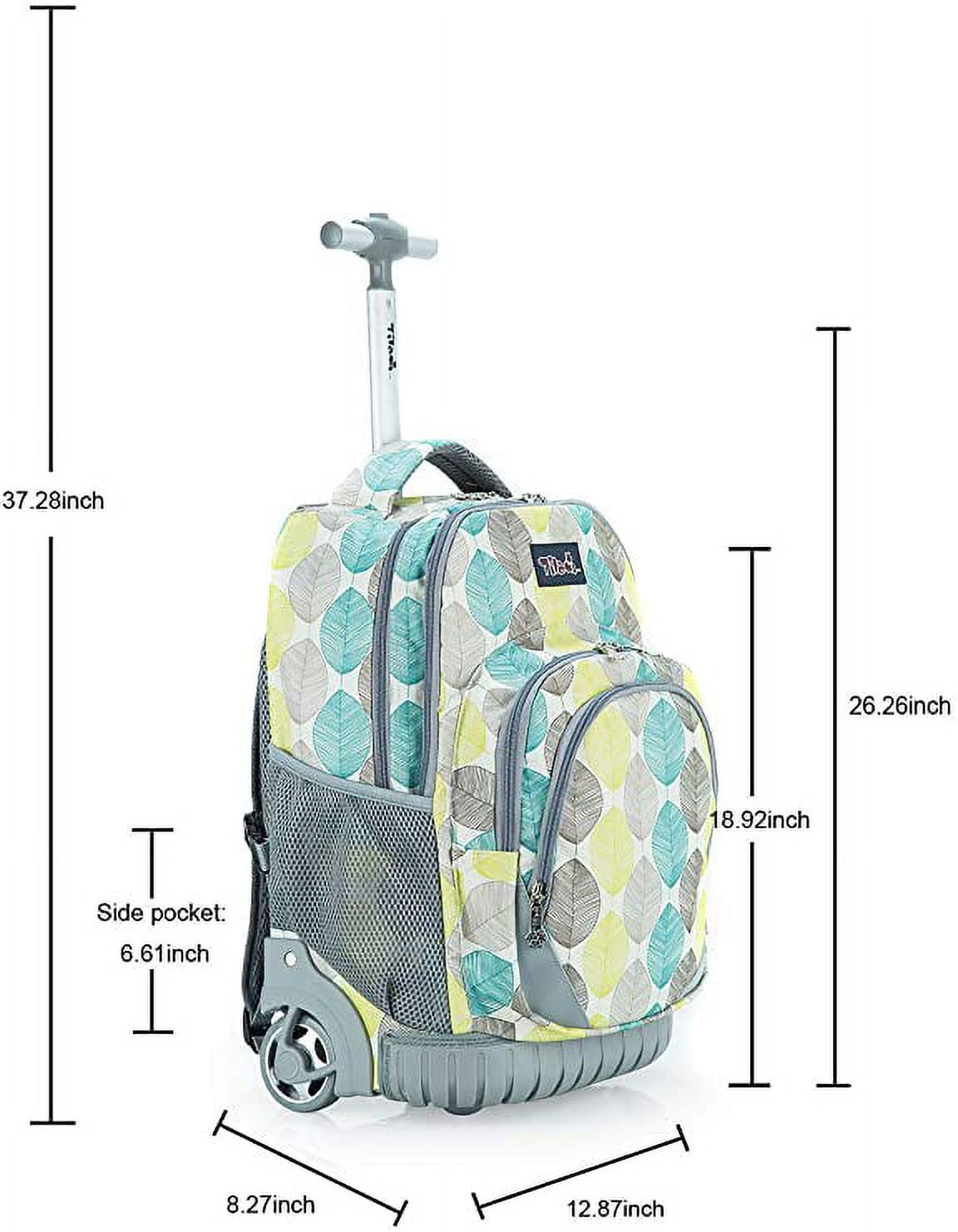 10″ Drop Shoulder At least 30 lbs TILAMI Rolling Backpack Bearings, Waterproof Material More Durable Large capacity multi-compartment design, can hold more items, easily save your shoulder Personalized design of shoulder strap padded pockets make your riding time more convenient and fun Brand new pattern, suitable for different occasions, such as elementary school, high school, college, nursing school, vacation, travel, etc. Rolling Backpack Dimensions: 18.92x 12.87x 8.27 inches; Lunch Bag Dimensions: 10x 7.5×10 inches. This backpack is suitable for children over 4 years old. Notification Actual colors may differ slightly from online images due to monitor color settings. Please allow for slight measurement deviations in the data. If you want to know more details or have any questions, please browse the detailed page or contact customer service. 3-in-1 Multifunctional Kids Backpack High Density Splashproof Fabric Lightweight Ripstop Kids Backpack Large capacity and practical 3-in-1 backpack Good for school & travel & walking & other activities