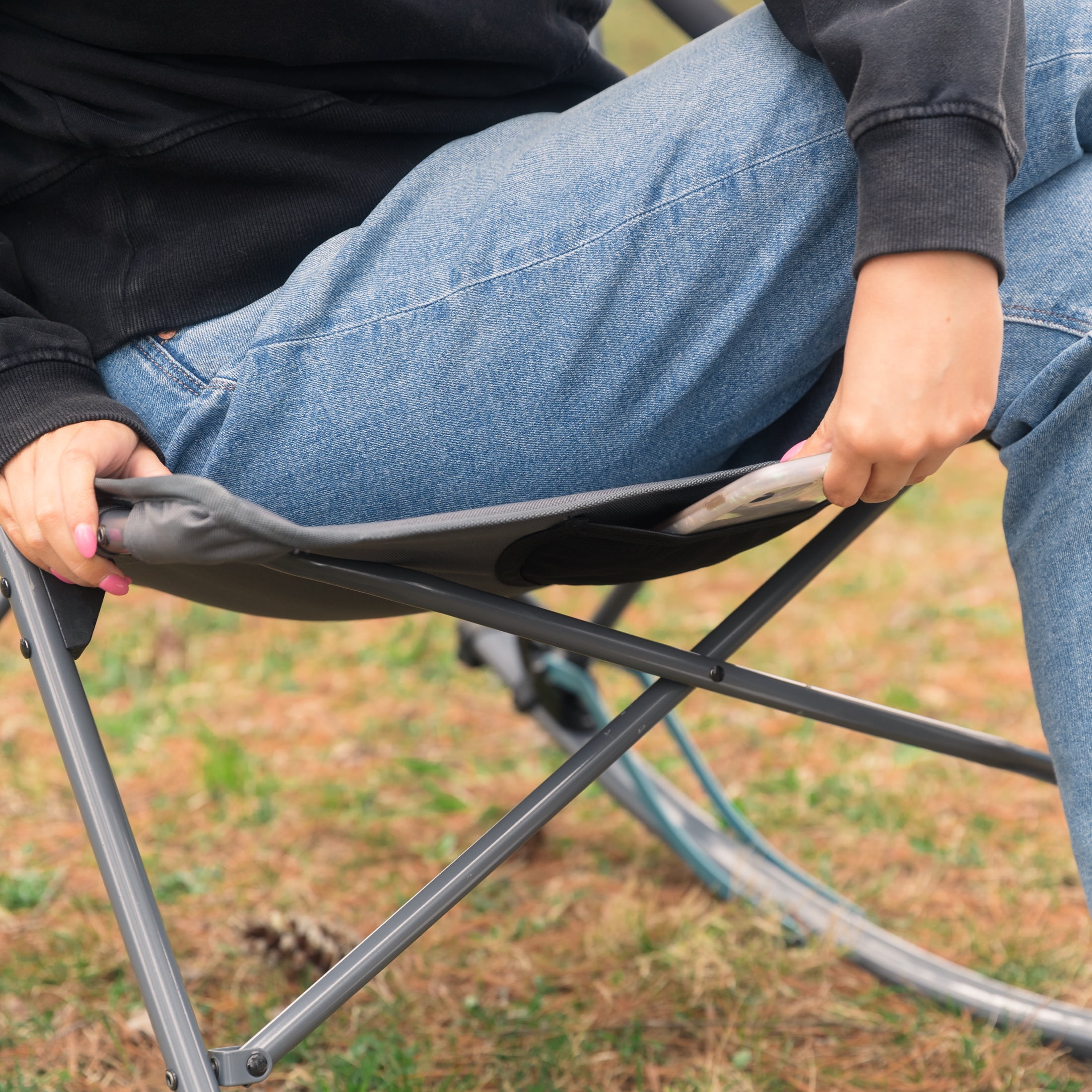 Made with durable 600D polyester fabric Steel tube frame with powder coating for added durability Sets up easily with quad frame design Hard arms with EVA wraps for comfort Easily rocks or creates “lean back” natural position Mesh phone pocket under seat Carry bag included for easy storage and transportation Product dimensions (inches): 22.8” x 17.1” x 19.3” x 34.5” Weight capacity (pounds): 250 lbs.