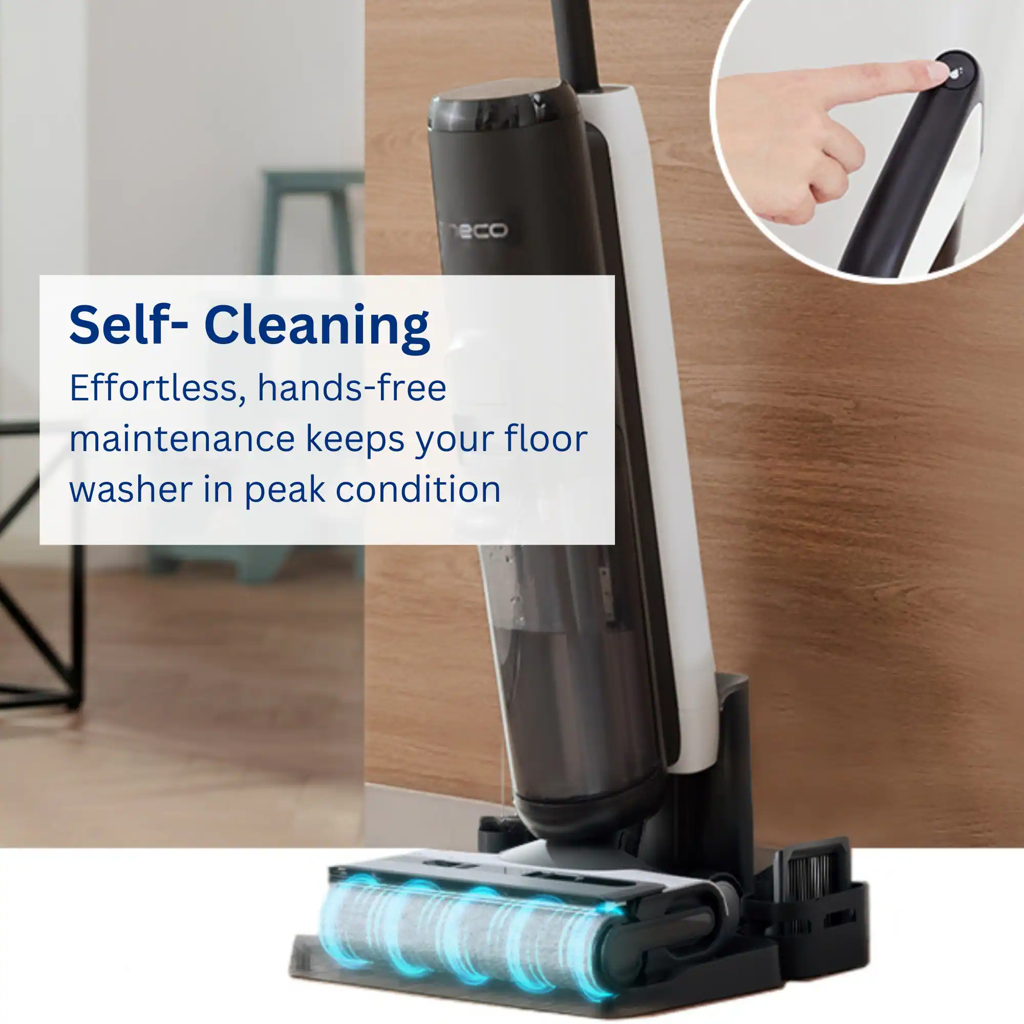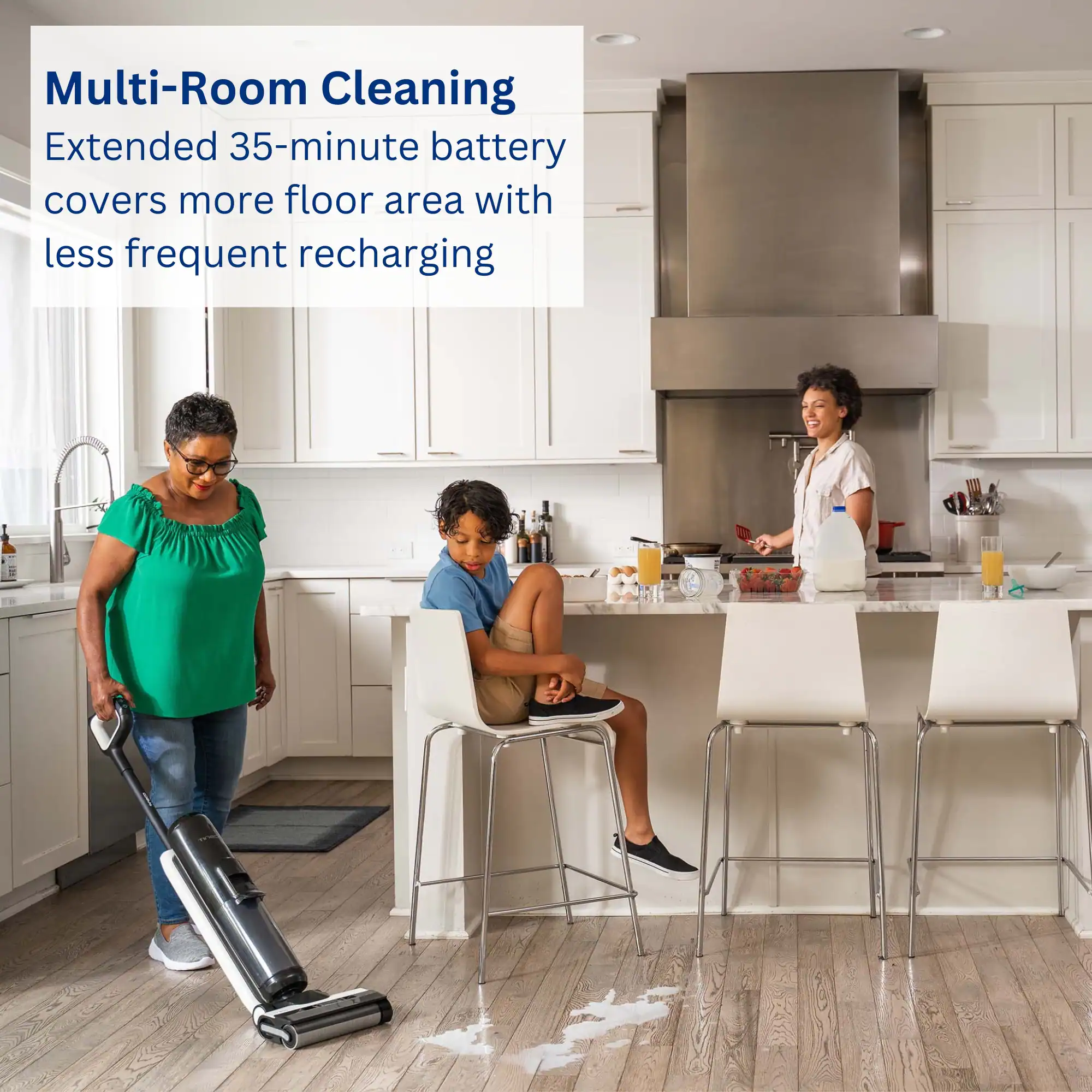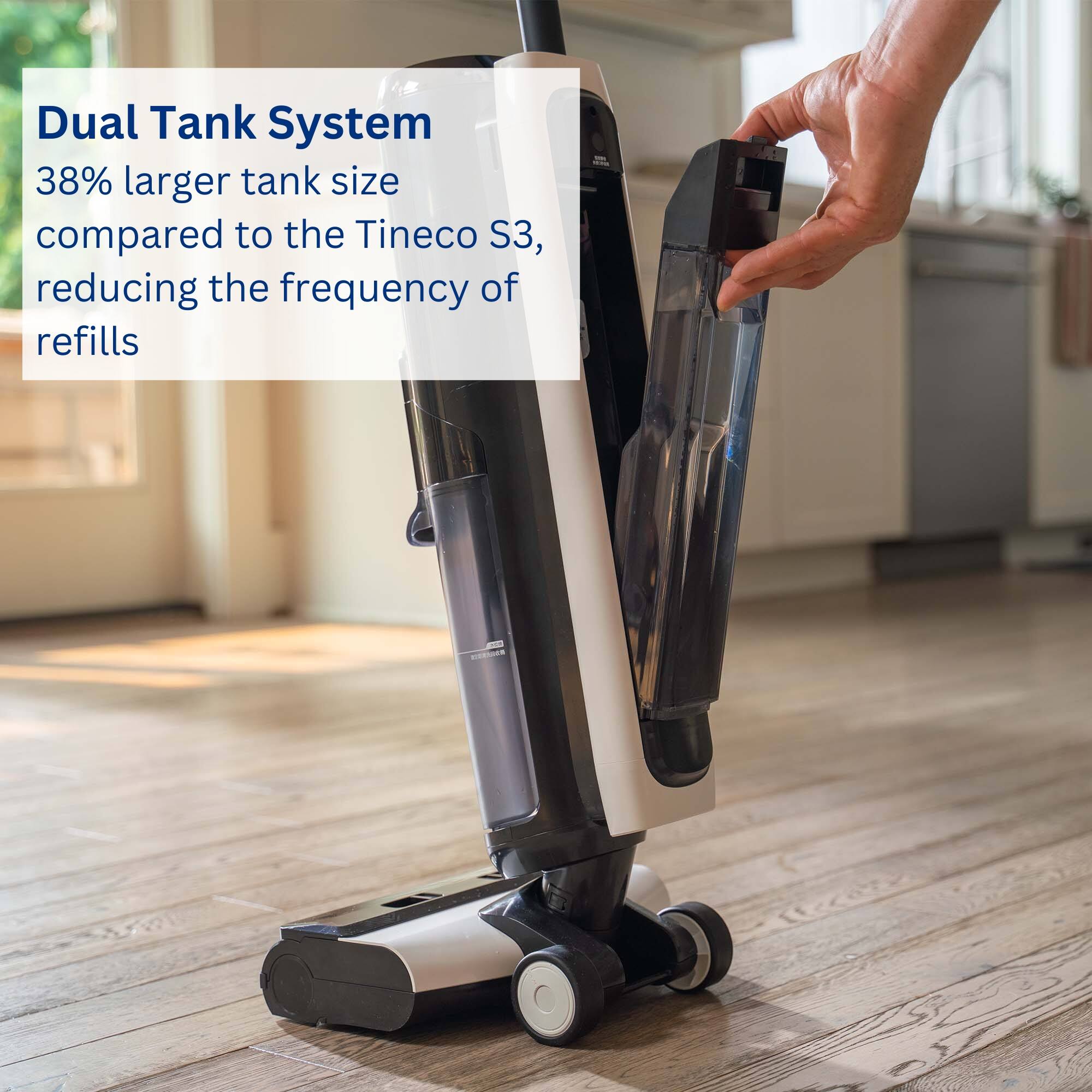 Cleaning your floors doesn’t need to be a stressful experience. With the Tineco Floor One S5 Extreme, say goodbye to tedious mopping, sweeping, and vacuuming. With this three-in-one vacuum, cleaning your floors just got easier, better, and more powerful. The incredible suction power of Tineco Floor One S5 quickly picks up debris, while the continuous fresh water cleaning removes the need for dirty mops and disposable pads. Now with a larger capacity clean and dirty water tank, you can clean expansive areas without interruption. That means no more lugging heavy water back and forth. The Floor One S5 Extreme is one of our most advanced floor washers yet! Glide across all sealed hard floor types, picking up debris and liquids effortlessly. Then, transition to another room seamlessly with the whisper-quiet brush rollers. Not only does the Floor One S5 Extreme make whole-house cleaning a breeze, but the iLoop Smart Sensor Technology instantly adjusts water flow, suction, and brush roller speed based on the mess below. Adding to our already advanced design is an exclusive brush head design that offers superior edge cleaning capabilities allowing you to clean along baseboards and into corners. And, when you want to vacuum up a mess without water, simply switch to the featured suction-only mode. Whether chasing after your messy toddler or cleaning up after an evening of guests, the Floor One S5 Extreme is the tool you need to turn grimy into pristine. When you’re done, simply attach the floor washer to its handy self-cleaning dock.