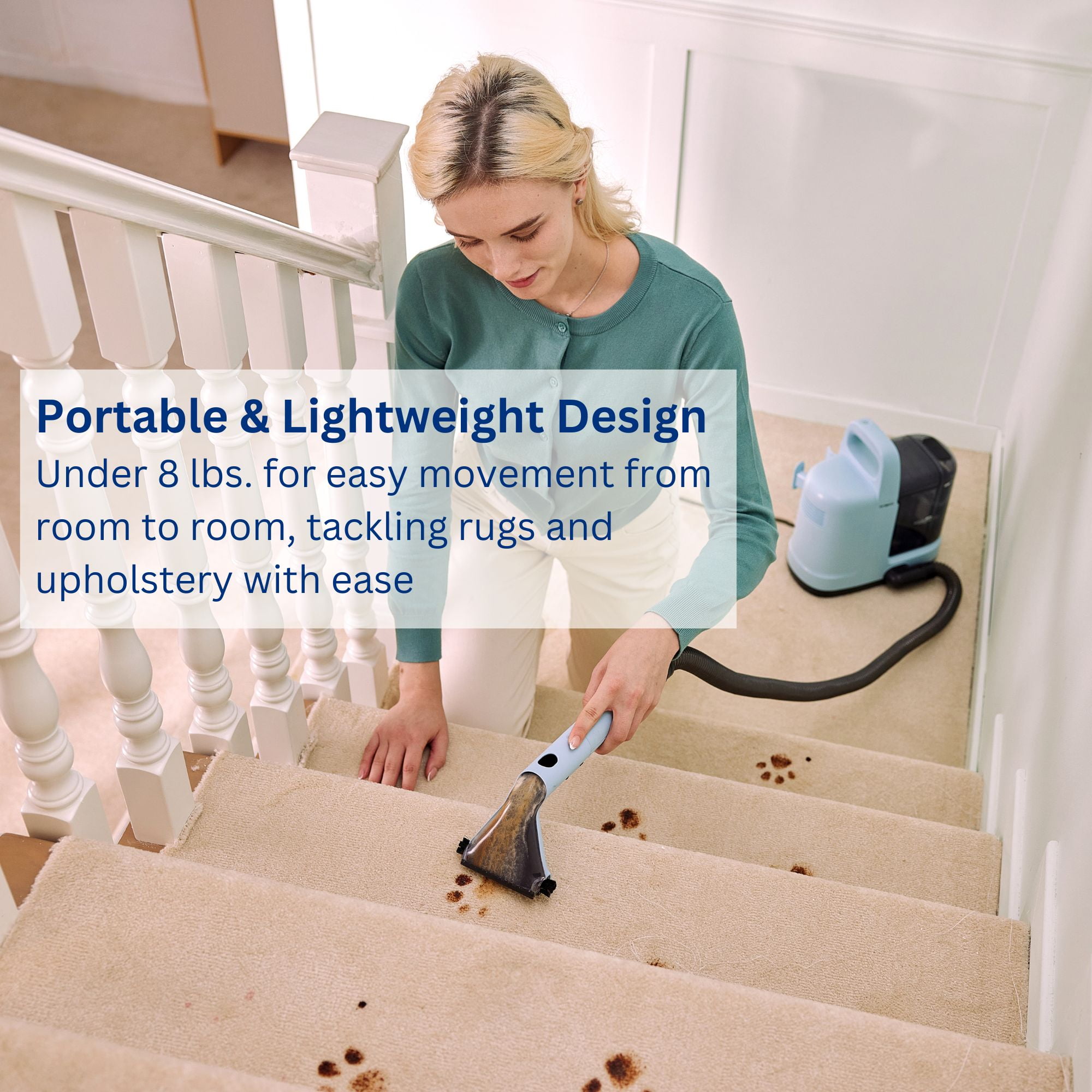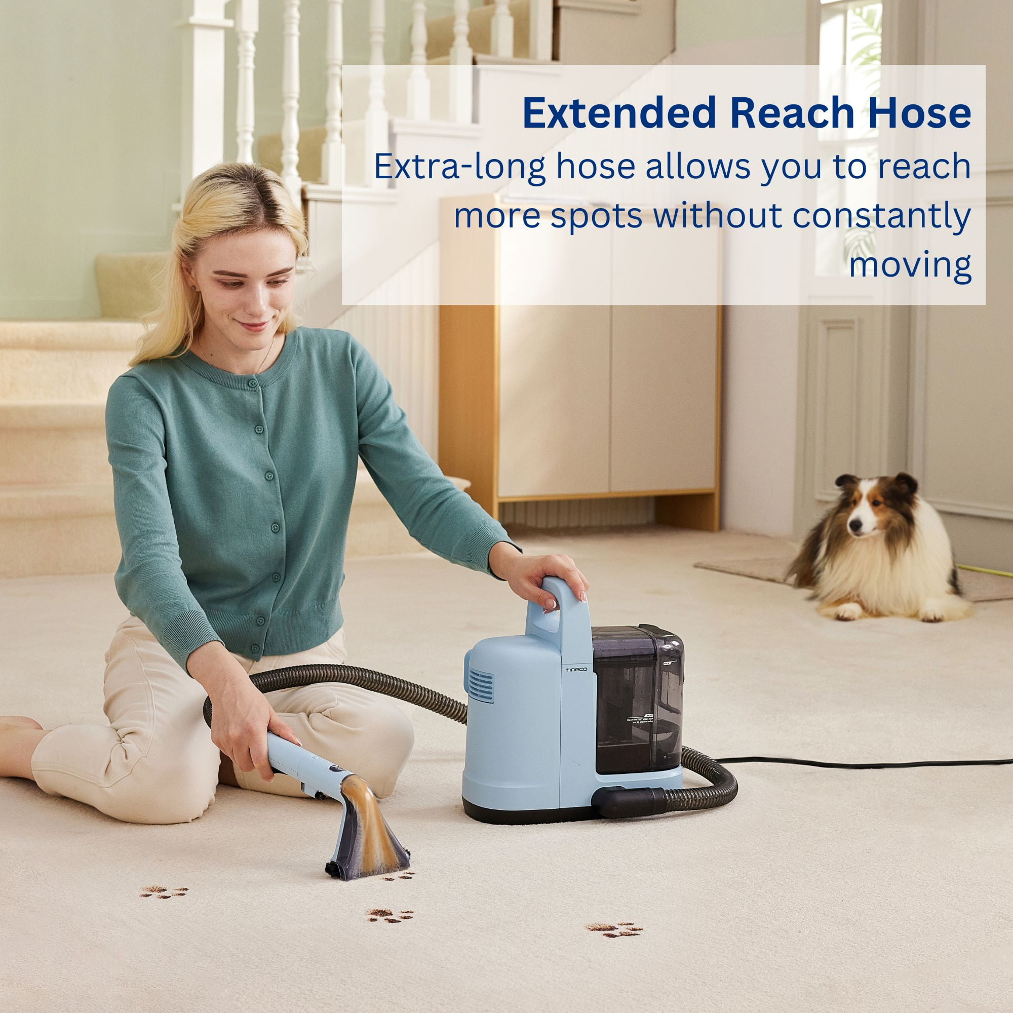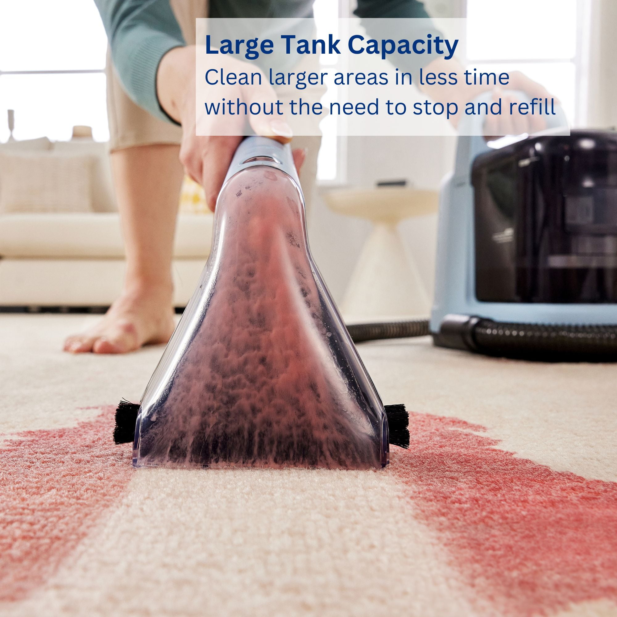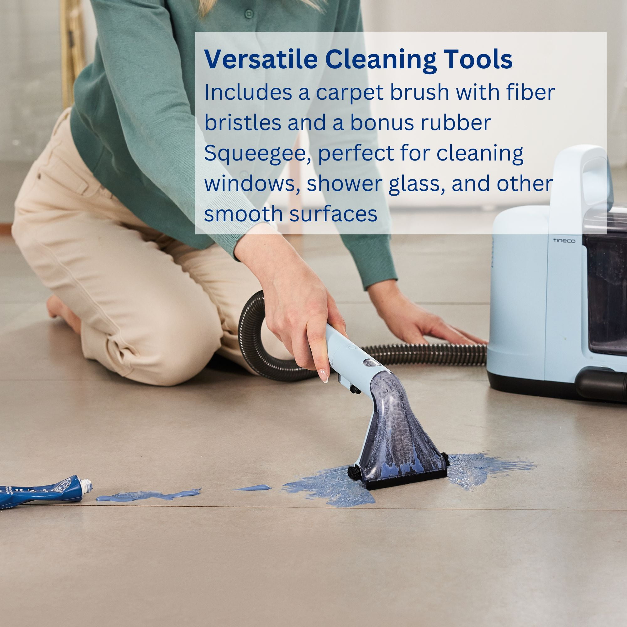 Effortlessly remove stubborn spots from upholstered furniture like couches, chairs, and rugs with the compact yet powerful GO Spot carpet cleaner. Perfect for quick, deep cleanups anywhere in your home. Easily transport this under 8 lb carpet spot cleaner from room to room, tackling rugs and upholstery with ease. Experience strong water pressure and suction to effortlessly lift tough stains and spots from carpets, rugs, and more. Achieve optimal results by combining the Tineco Stain Pre-treatment solution with water treated using Tineco carpet solution. Say goodbye to stubborn stains. Includes a Carpet Brush with fiber bristles and a bonus rubber Squeegee, perfect for cleaning windows, shower glass, and other smooth surfaces. Clean more without the need to stop and refill, letting you cover larger areas in less time. The extra-long hose allows you to reach more spots without constantly moving the water tanks. Includes lightly scented Carpet Solution (16.9fl oz) and Pre-Treatment Spray (16.9fl oz) to help you tackle the toughest cleanups and leave your carpets smelling clean.