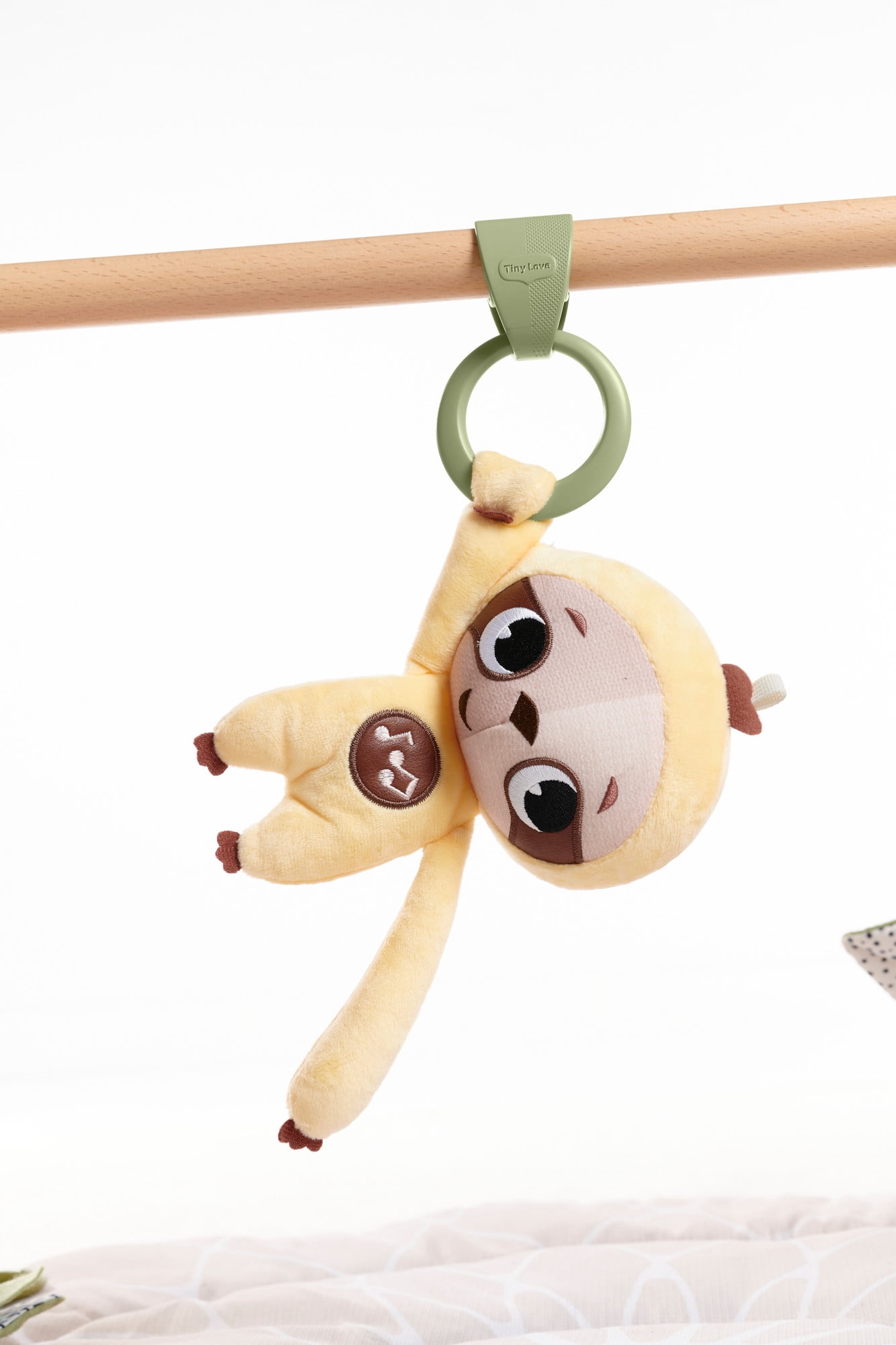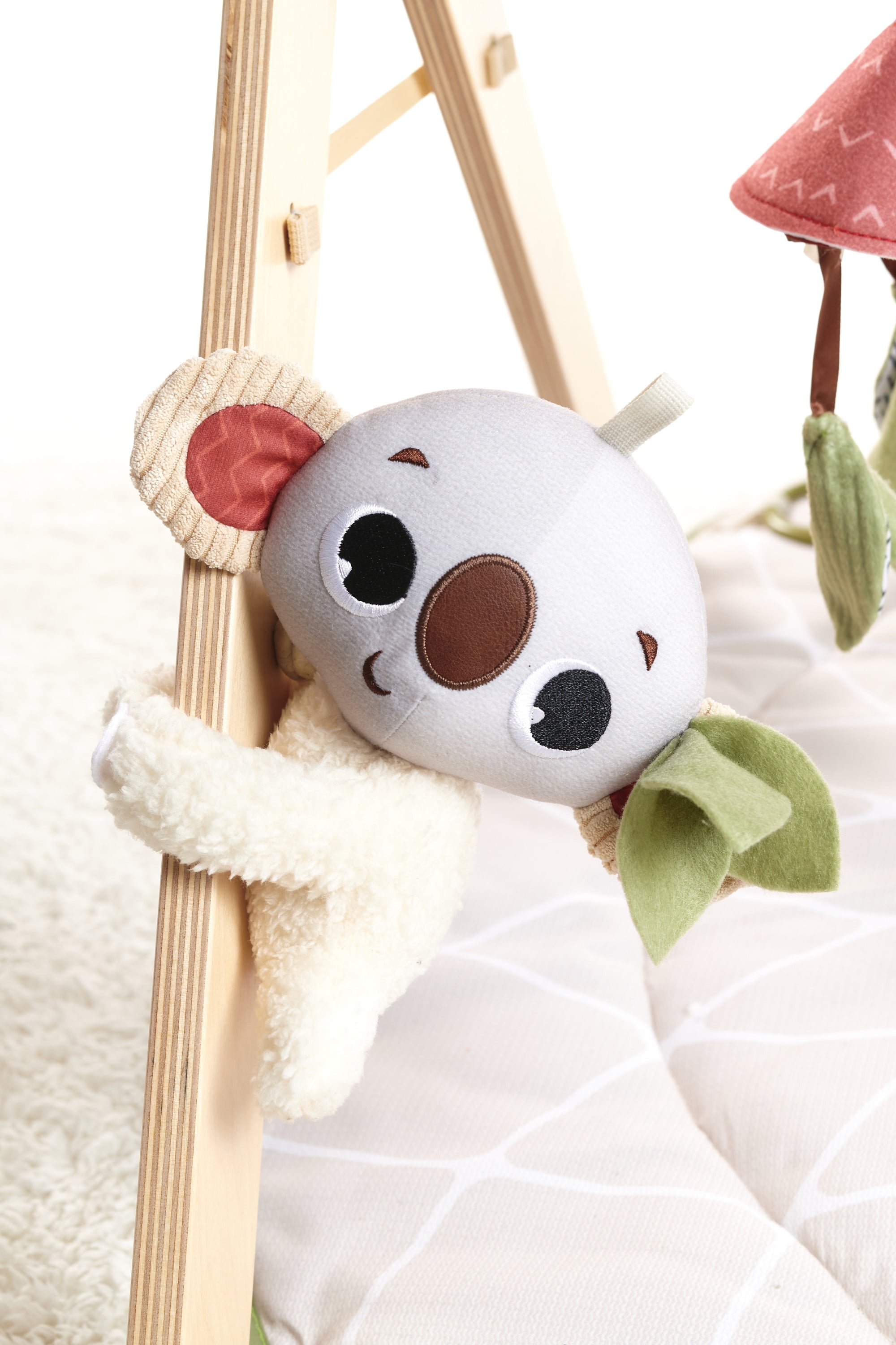 Stand-alone, wooden toy arch Crinkly, multi-fabric plant toy with textured ring and transparent bead ball Double padded, extra soft activity mat Batteries included Baby-activated musical sloth doll that plays melodies Giant, crinkly peek-a-boo leaf with rattle and satin ribbons hiding underneath Mobile with crinkly eucalyptus leaves Dream catcher mirror Giant leaf kicker with a rattle Natural wood tri: 3 gripping rings with rattle and fun satin ribbons 12 milestone cards to capture key moments Machine washable mat Easy & quick assembly Plush take-along koala hug-doll with rattle