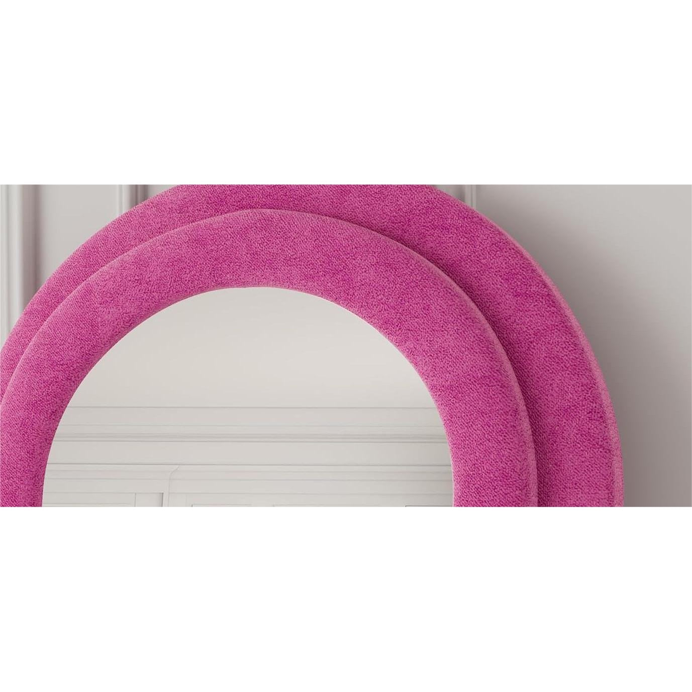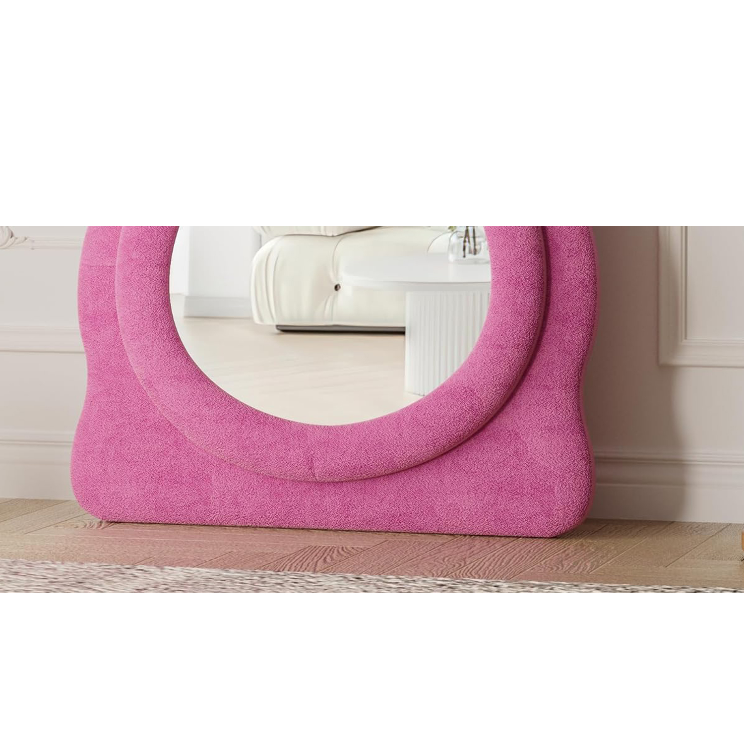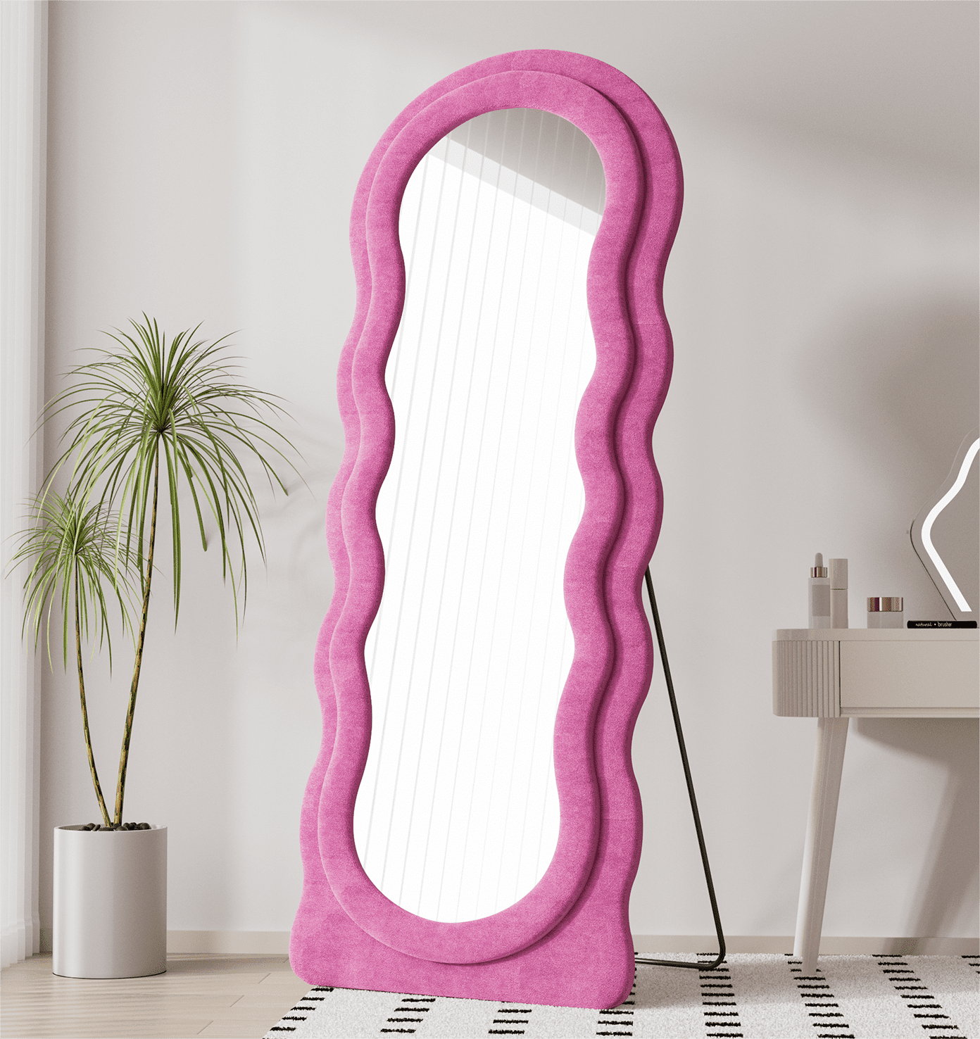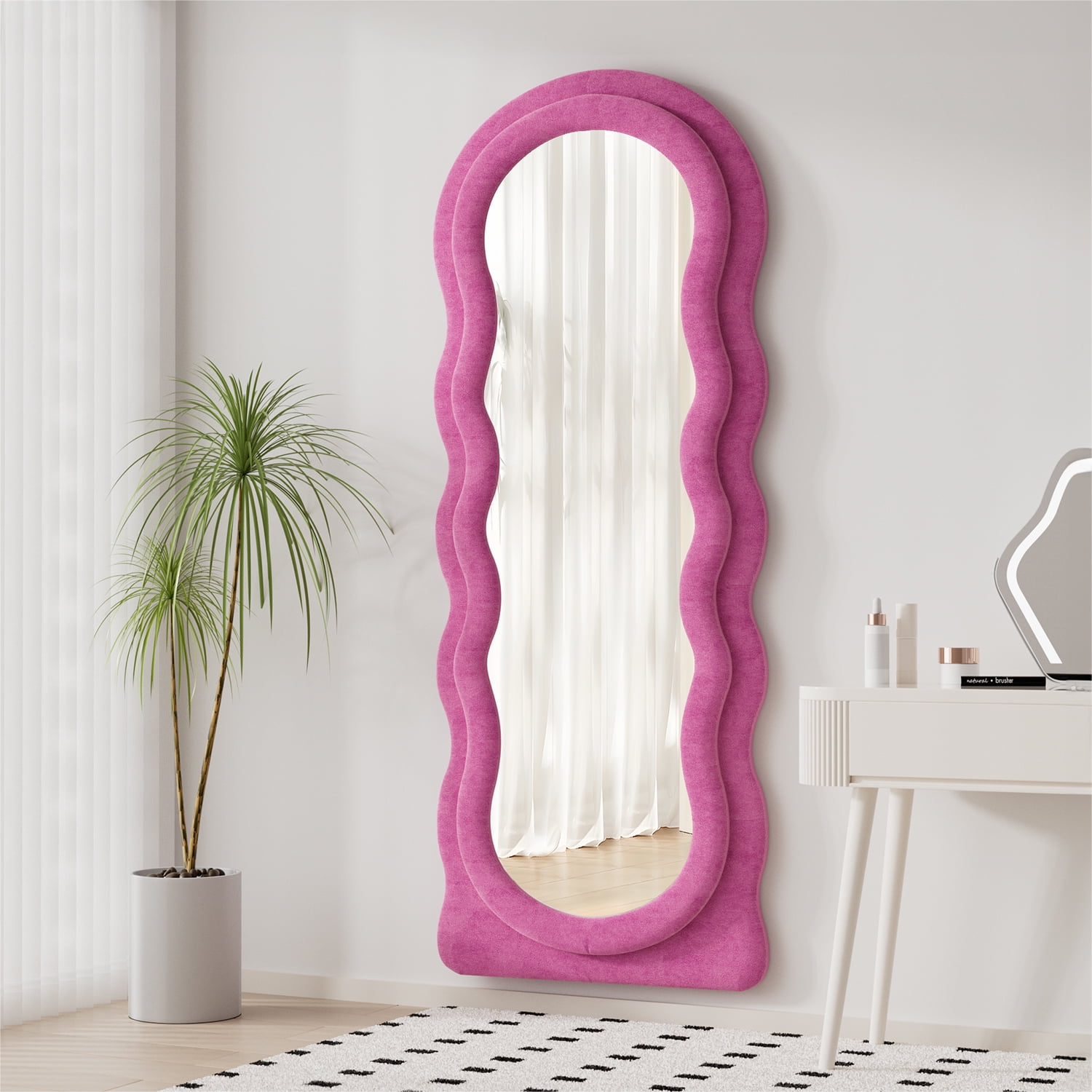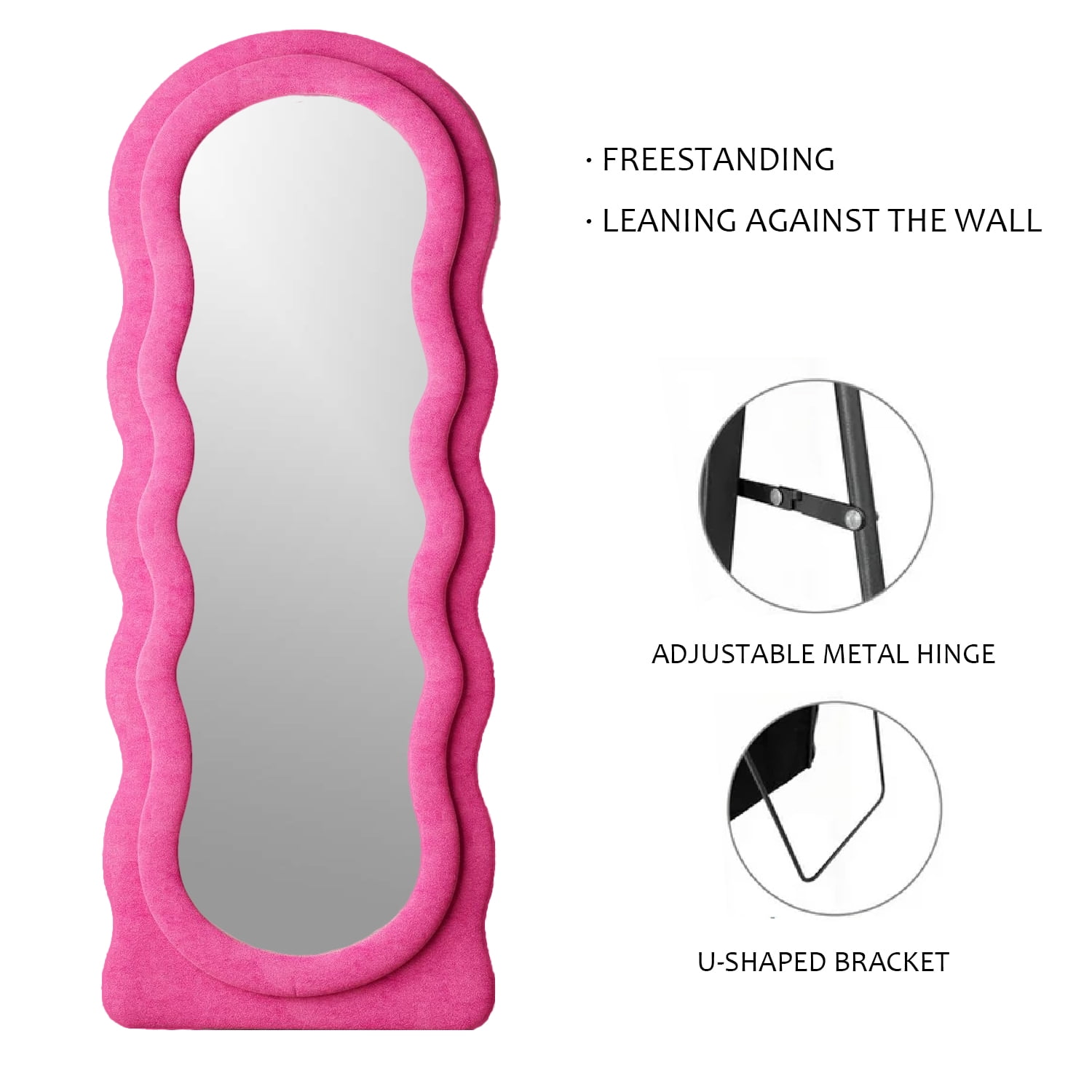 DIMS 24″ W x 63″ H STYLE Wavy Full-Body MATERIAL MDF, Flannel COLOR Pink APPLICATION SCENARIOS Living Room, Bedroom, Cloakroom, Entryway, Boutique FLANNEL FRAME The mirror frame is enveloped in soft, thick velvet fabric, ensuring no risk of collisions. Perfect for classic, modern, and elegant floor length mirror looks. TIMELESS DESIGN This modern mirror features a wavy shape that captivates attention and enhances its beauty. An excellent addition to the living room, powder room, any area in your home, or a design space such as a clothing store. FULL-BODY This long mirror features dimensions of 63” x 24”, providing a comprehensive reflection for a full-body view, thereby augmenting your illumination, aesthetics, and self-assurance. SPLASH-PROOF HD Lenses undergo various processes including sensitization, silver plating, and protective coating. With six layers of protection, they are safe and splash-proof, offering HD imaging and effective care. GUARANTEED SATISFACTION If the mirror arrives damaged or if you don’t absolutely love our product, please contact us promptly, and we will provide you with the best solutions. Please note that hooks are NOT INCLUDED with this mirror.