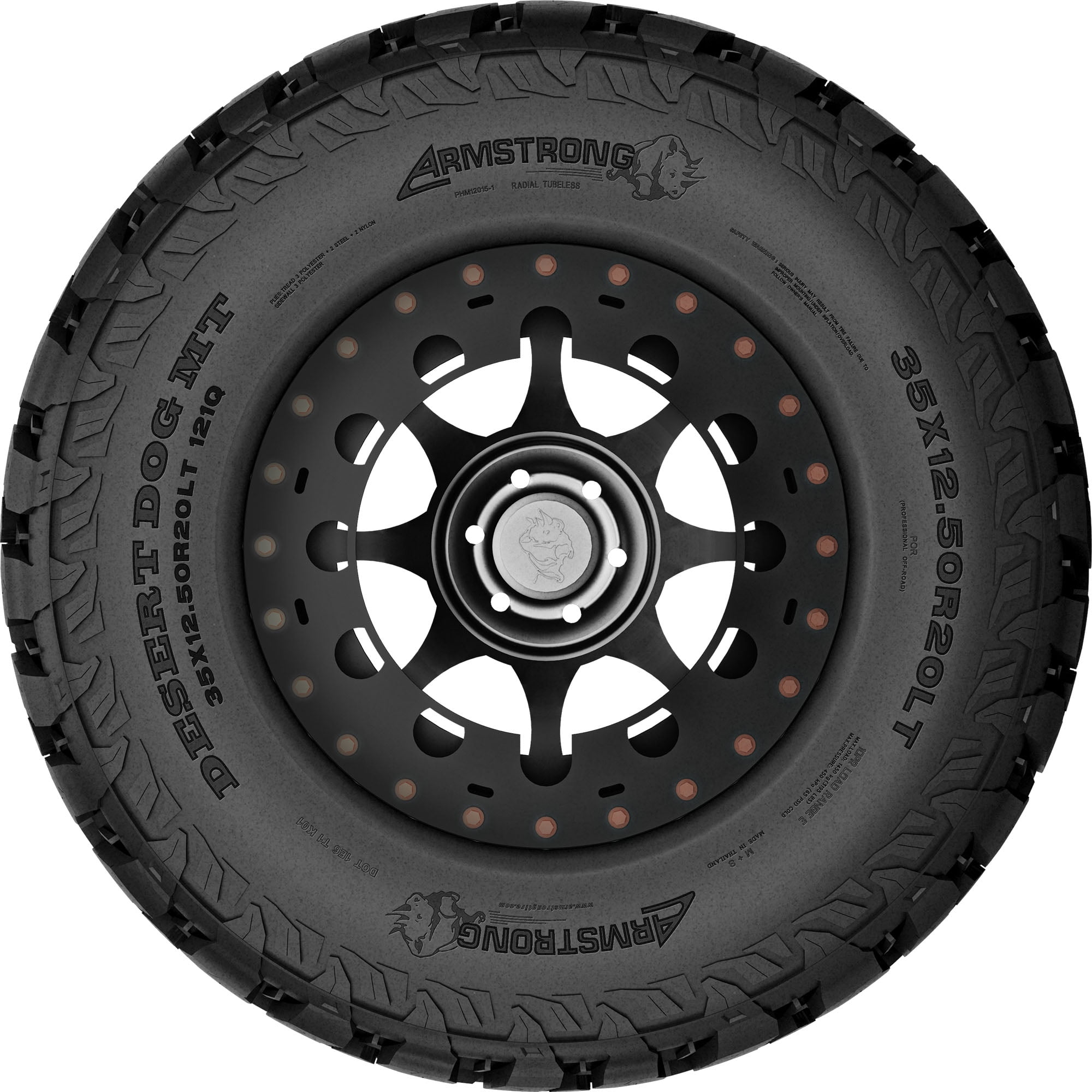 Armstrong Desert Dog MT FEATURES AND BENEFITS Mud terrain traction Damage resistance Heavy-duty controllability Longer lasting tread life OVERVIEW The Armstrong Desert Dog MT is a mud terrain, all season tire manufactured for light trucks. The tire promotes excellent mud terrain performance with the aggressive tread design. The staggered, zigzag block pattern, high void ratio, and detailed sidewall pattern upgrade the soft, loose, and uneven terrain traction. This enables the tire to greatly improve its performing capability throughout the performance, increasing the deep mud and loose terrain surface grip. The tread elements disperse mud and snow stuck between the tread elements, preventing them from blocking the surface contact. The combination of these elements greatly enhances the model’s off-road terrain performing capability. The self-cleaning nature of the tread and the reinforced sidewall plies boost the tire’s damage resistance. The tread elements feature zigzag stone ejectors which eliminate rocks stuck in the footprint. As a result, they cannot drill into the tread area and cause stone retention. The sidewall structure and the detailed sidewall design work together to prevent external damage. They avoid punctures, cuts, and impact damage from shortening the tire’s overall service life. Controllability is also improved with the tread design. The stabilized block placement enables the tire to increase the surface contact while the tires are in motion. This significantly boosts the tire’s steering response time and accuracy to the driver’s commands, while the structural stability is also maintained at all times. The strengthened structure and the optimal pressure circulation help keep the ideal tire shape under pressure. This significantly upgrades the tire’s ability to carry and withstand heavy loads with ease, resulting in the tire’s secure heavy-duty performance. The Desert Dog MT increases the length of the usability. The special compound and the stabilized tread elements allow the tire to enhance the service life. The stronger compound utilizes wear-resistant elements in order to decrease the treadwear rate. The stability of the footprint ensures even pressure circulation, greatly avoiding irregular wear as well. The slow and even wear boosts the tire’s overall tread life. The intended purpose of Mud Terrain tire types is off-road use. They are not designed for regular highway driving. Manufacturers recommend changing tires every 10 years. As long as tires are properly stored before they are sold, the year of their manufacture will not shorten their service life.