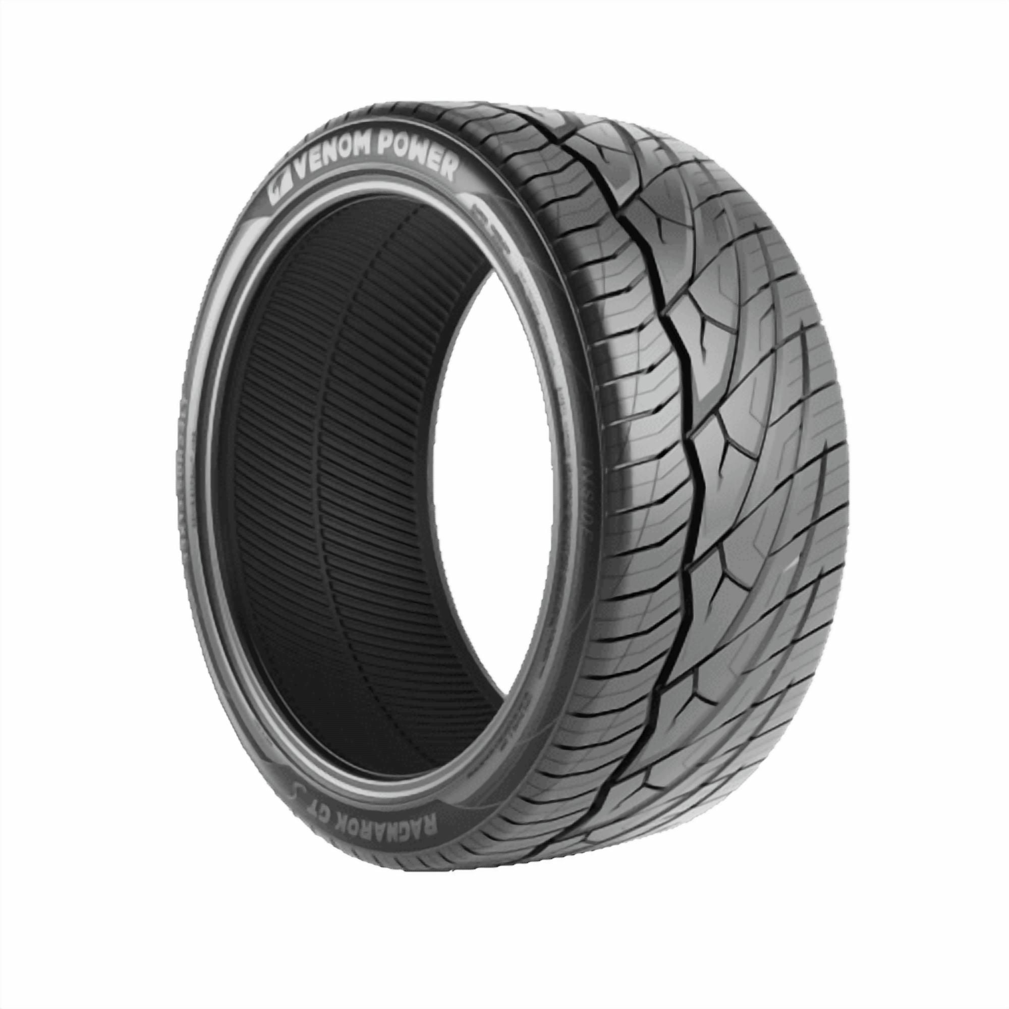 Venom Power Ragnarok GTS FEATURES AND BENEFITS All season traction Enhanced controllability Upgraded durability Longer lasting tread life Venom Power Road Hazard Warranty OVERVIEW The Venom Power Ragnarok GTS is a performance and high performance, all season tire made for passenger vehicles and SUVs. This model has light truck highway sizes as well. Venom Power offers a 50,000 mile treadwear warranty with specific sizes, of 35 or higher aspect ratio and 22-inch and below sizes. Venom Power covers this tire model and size with its 1-year Road Hazard Warranty. This warranty is available for tires damaged within the first 12 months after the purchase date, or until the first 3/32” of the tire tread wears away, whichever comes first! If this tire sustains road hazard damage (typically caused by nails, glass, or potholes) on its tread area, customers have a right to use the Road Hazard warranty for a Tire Replacement or Tire Repair. To receive the Road Hazard warranty, customers with damaged tires must file a claim with Priority Tire. This model promotes exceptional all season traction by using its ribbed tread design and all season compound. The ideal sipe pattern and staggered block placement enhance the tire’s grip on the driving surface, as they generate additional biting edges. Stronger compound elements keep the rubber flexible and maintain the tire’s pliability throughout the year. The angled groove placement disperses water and slush from the footprint, effectively avoiding hydroplaning in the process. The stabilized tread design maintains its consistent surface contact, upgrading the tire’s controllability. The better road contact upgrades the tire’s steering responsiveness and driving stability. In this manner, the tire guarantees its optimized steering response time and accuracy and it also manages to stabilize the structure. The ideal shoulder block placement firmly grips the road surface with extra biting edges, boosting its controllability. The staggered blocks and sipe detail generate friction, shortening its braking distance. High speed durability is ensured with this tire. The ideal tread design, the high performance compound, and the strengthened structure work together to optimize the tire’s high speed performance. This tread pattern evenly distributes the driving pressure along the tread area, while the compound is heat-resistant. These work together to actively resist heat build-up along the tread area. The strengthened internal structure maintains the optimal tire shape under the high speed driving pressure affecting the model. This allows the tire to perform at its best high speed capability. The Ragnarok GTS guarantees a quiet drive. The variable pitch sequence decreases the road noise heard in the vehicle’s cabin. The tread design’s pitch sequence negates road noise generated while the tires are in motion. It creates a sound frequency that cancels road and tread pattern noise out during the drive. The result is a quiet and comfortable drive. Manufacturers recommend changing tires every 10 years. As long as tires are properly stored before they are sold, the year of their manufacture will not shorten their service life.