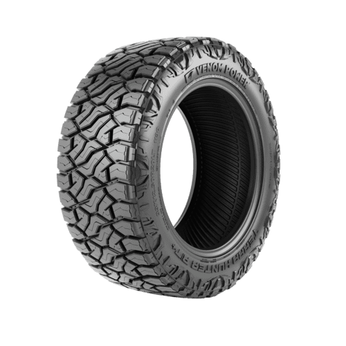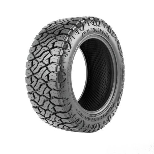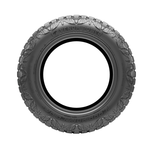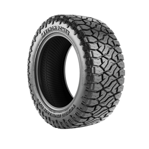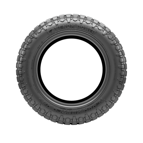Venom Power Terra Hunter R/T FEATURES AND BENEFITS 50,000 mile treadwear warranty Rugged terrain traction All season traction Enhanced controllability OVERVIEW The Venom Power Terra Hunter R/T is a rugged terrain, all season tire manufactured for SUVs and light trucks. Venom Power offers a 50,000 mile treadwear warranty with some of the sizes of this tire model. 22-inch and lower, and 13.5-inch wide or lower sizes receive this warranty if the correct procedures are followed. The mounted tires must be rotated according to the prescribed rotation patterns, at least 3,000 – 5,000 miles, and the documented rotation schedule must be shown. Tires must be presented for adjustment during routine maintenance. The documentation showing the rotation schedule, date of purchase, vehicle type, model, odometer reading, and tire pressure must be presented when requesting an adjustment of a prematurely worn-out tire. The aggressive footprint ensures the tire’s secure on- and off-road terrain traction. The staggered block pattern and high void ratio enhance surface traction, boosting the soft, loose, and uneven terrain performance. The scalloped shoulder pattern also helps to upgrade the deep mud and loose dirt terrain traction. The tread elements help to keep the footprint clean, by eliminating mud, snow, and rocks. As a result, stone retention is effectively avoided as rocks cannot drill into the tread area, while mud and snow are unable to block the surface contact. All weather traction is also provided. The all season compound and the detailed tread elements greatly upgrade the dry, wet, and winter weather grip on the road surface. The stronger compound elements optimize the rubber’s flexibility throughout the year, greatly enhancing the summer and winter weather performance. The groove pattern enables the tire to improve on-road, wet-weather traction. The groove placement helps to disperse water and slush from the footprint in wet weather conditions during the tire’s on-road performance. The Terra Hunter R/T upgrades the heavy-duty controllability. The stabilized tread elements enable the tire to maintain surface contact at all times, boosting the steering responsiveness and driving stability. In this manner, the tire boosts the steering response time and accuracy, while the structure is secured against the driving pressure affecting the tire. The reinforced internal structure with the steel belt reinforcement upgrades load durability. Since the tire does not deform, it can securely handle heavier loads. Manufacturers recommend changing tires every 10 years. As long as tires are properly stored before they are sold, the year of their manufacture will not shorten their service life.