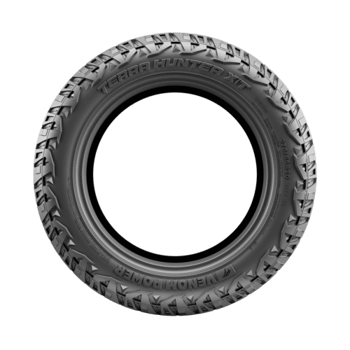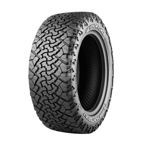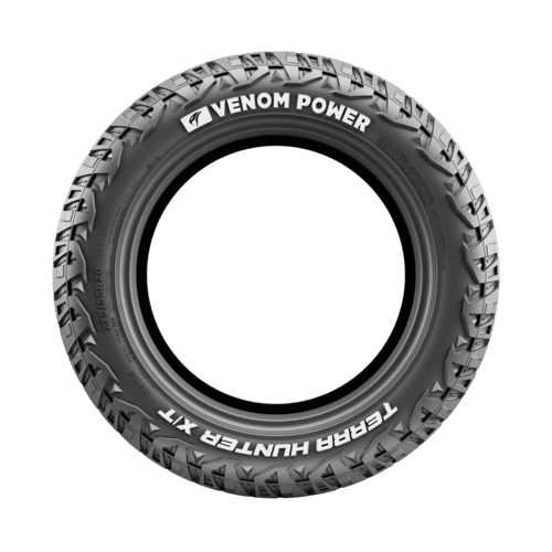 Venom Power Terra Hunter X/T 2 FEATURES AND BENEFITS All weather traction Improved controllability Extreme terrain drive Upgraded load durability OVERVIEW The Venom Power Terra Hunter X/T 2 is an extreme terrain, all weather tire made for light trucks and SUVs. The model has some commercial van sizes available as well. Venom Power offers a 50,000 mile treadwear warranty with this model. Maintaining the surface contact enables controllability on different terrains. The aggressive tread pattern maintains road contact at all times. It improves steering responsiveness and driving stability. The steering response time is faster and more precise to the driver’s commands, while the structure is secured against driving pressure. On the other hand, the wide shoulder blocks upgrade the tire’s cornering and maneuvering. These elements enable the driver to have full control over the vehicle and promote a safe driving experience. The model ensures excellent extreme terrain traction. This rugged tread design updates the soft, loose, and uneven terrain grip. The tread blocks and the rubber compound improve the deep mud and lose dirt performance as well. These tread elements increase the number of biting edges gripping the terrain to ensure a secure performance. The tread’s wide grooves and staggered blocks keep the footprint clean. They eliminate mud and snow from between the tread elements to prevent them from blocking the tire’s contact with the terrain surface. They also avoid stone retention by ejecting rocks from the footprint. This, combined with the durable compound, enhances the tire’s damage resistance and driving safety. The tire improves its load and driving durability. The strengthened and flexible carcass structure enables the tire to significantly increase its larger load capacity. Since the construction does not deform under load and driving pressure, the model is able to effectively enhance its heavy-duty applications. This enables the tire’s exceptional performance under large loads. The Venom Power Terra Hunter X/T 2 provides true year-round traction. This model has received the three mountain peaks and snowflake symbol, indicating its severe winter-weather durability. The detailed tread design and the all weather compound optimize the tire’s dry, wet, and winter traction. The groove pattern helps to prevent on-road hydroplaning during the drive, further upgrading the driving security. All weather tires receive the three mountain peak and snowflake (3PMS) symbol for their exceptional winter weather performance. They are all season tires with extra winter weather grip, in order to guarantee safer year-round durability. This ensures their true and secure driving ability throughout the year. Extreme Terrain tire types are not designed for regular highway driving. They are primarily designed for off-road applications. Manufacturers recommend changing tires every 10 years. As long as tires are properly stored before they are sold, the year of their manufacture will not shorten their service life.
