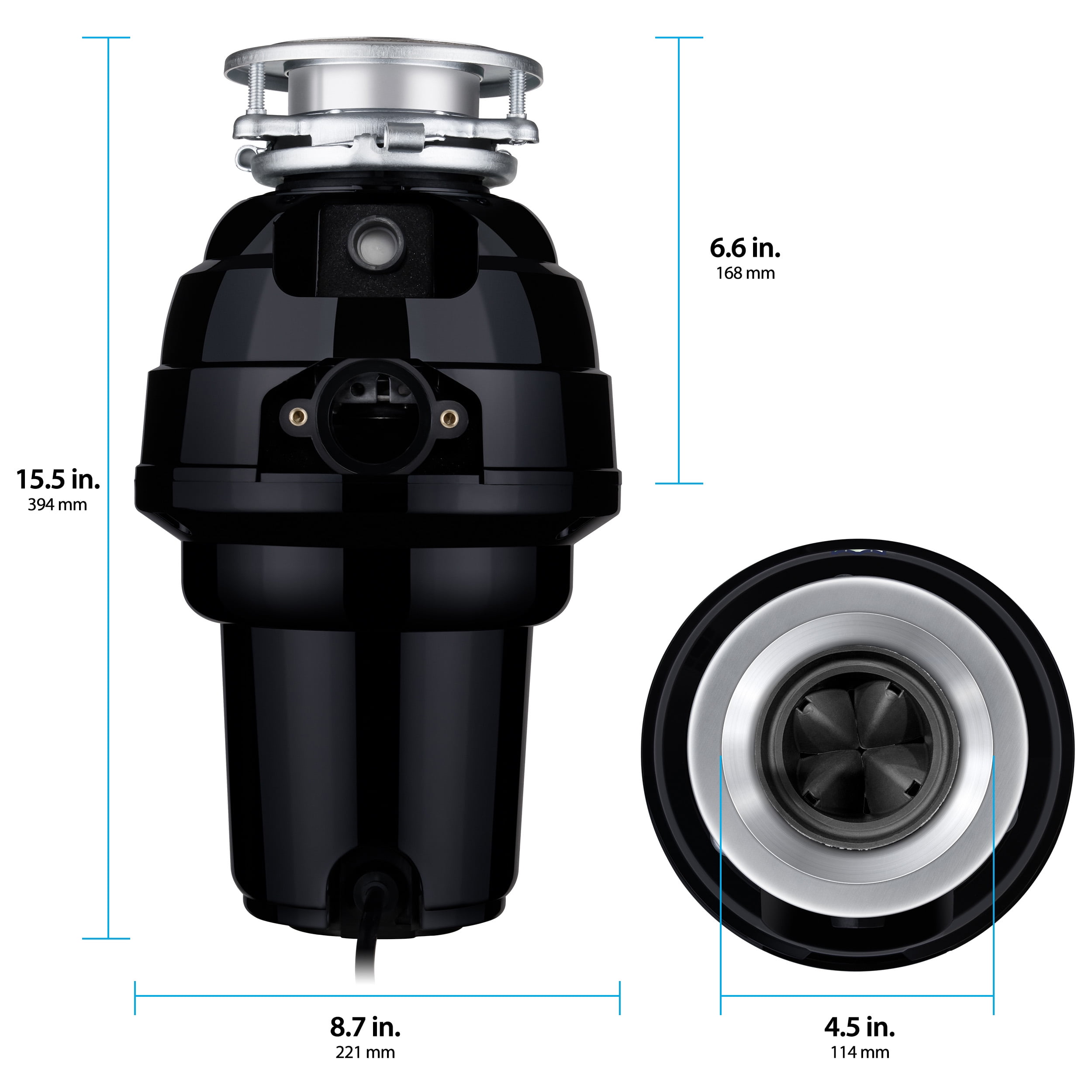 1-1/4 HP 2800 RPM (Horsepower claimed on package does not indicate motor output or motor power applied for processing) Stainless Steel Sink Flange and Stopper Attached 34 Inch Power Cord Removable Splash Guard – Fast Draining, Easy to Push Food Through Silver Guard Magnetic Metal Catch – Catches Silverware 110V 36 oz Hopper Capacity – Heavy Duty Grinding Continuous Feed 3-Bolt Mount Assembly Torque Master Balanced Grinding System – High Torque, Anti-Jamming, Consistent Performance Bio-Shield Anti-Microbial Agent Molded Into Chamber – Fights Odor and Bacteria Corrosion Resistant Stainless Steel Grinding Components Fully Insulated Shell – Quiet Operation