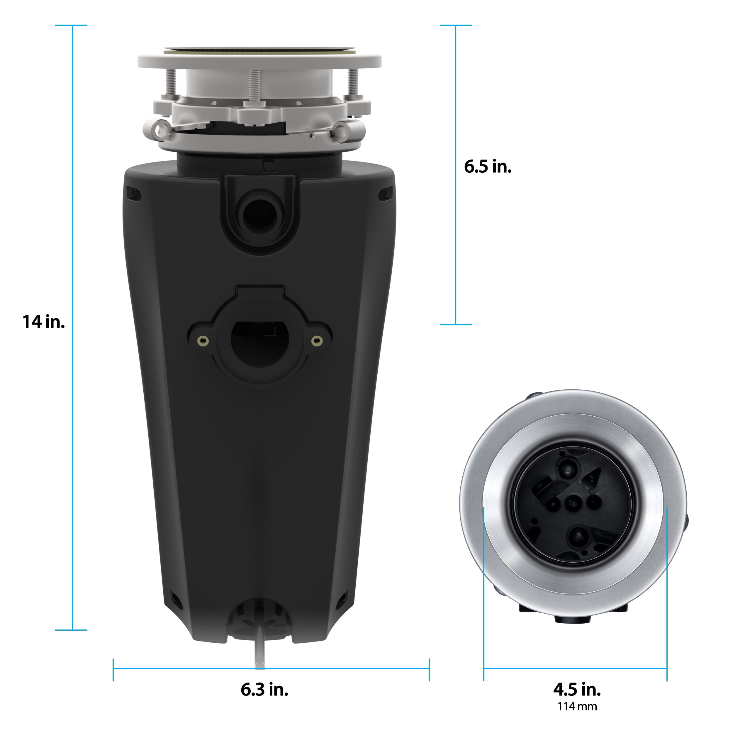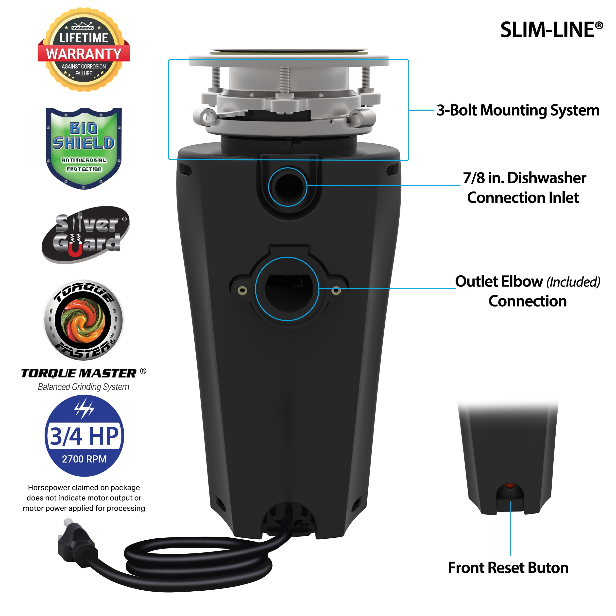 3/4 HP 2700 RPM (Horsepower claimed on package does not indicate motor output or motor power applied for processing) Stainless Steel Sink Flange and Stopper Attached 3 Ft Power Cord Sound Dampening Removable Splash Guard Drain Connection Kit 110V/120V Standard 29oz Load Capacity Continuous Feed Universal 3-Bolt Mount Assembly Torque Master Balanced Grinding System – Superior Torque, No Jams, Minimal Vibration and Rattle Torque Master Balanced Grinding System – Superior Torque, No Jams, Minimal Vibration and Rattle Compact/Lightweight Shell for Space-Saving Convenience All Stainless Steel Grinding Parts – Corrosion Resistant Bio-Shield Anti-Microbial Odor and Bacteria Protection Quiet Motor