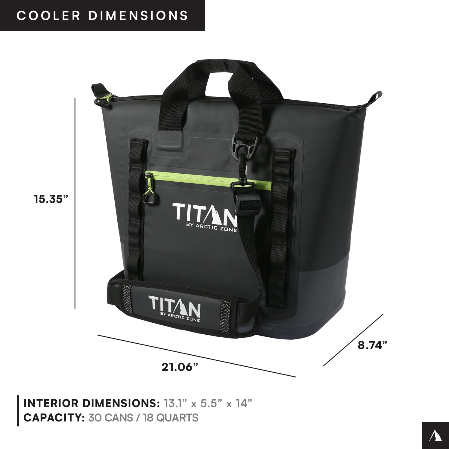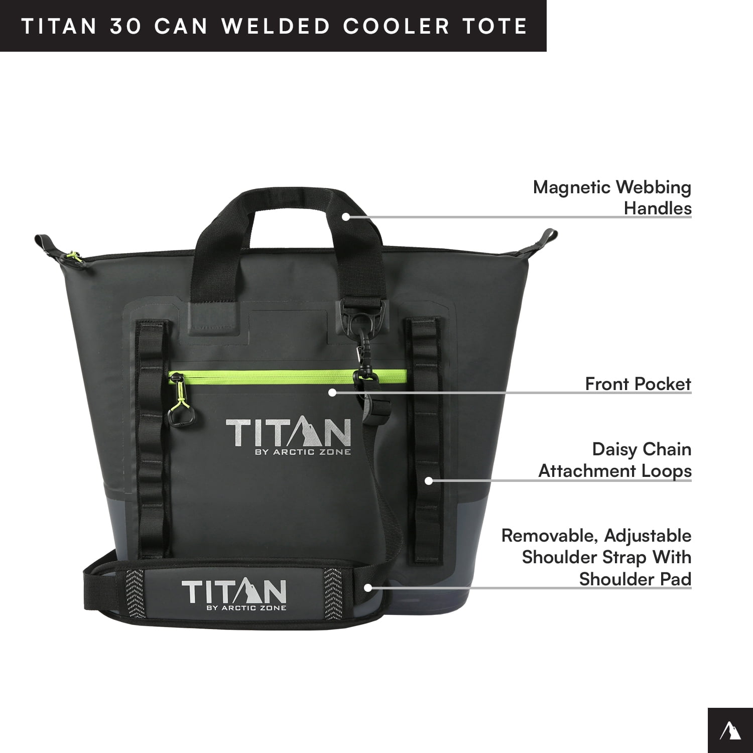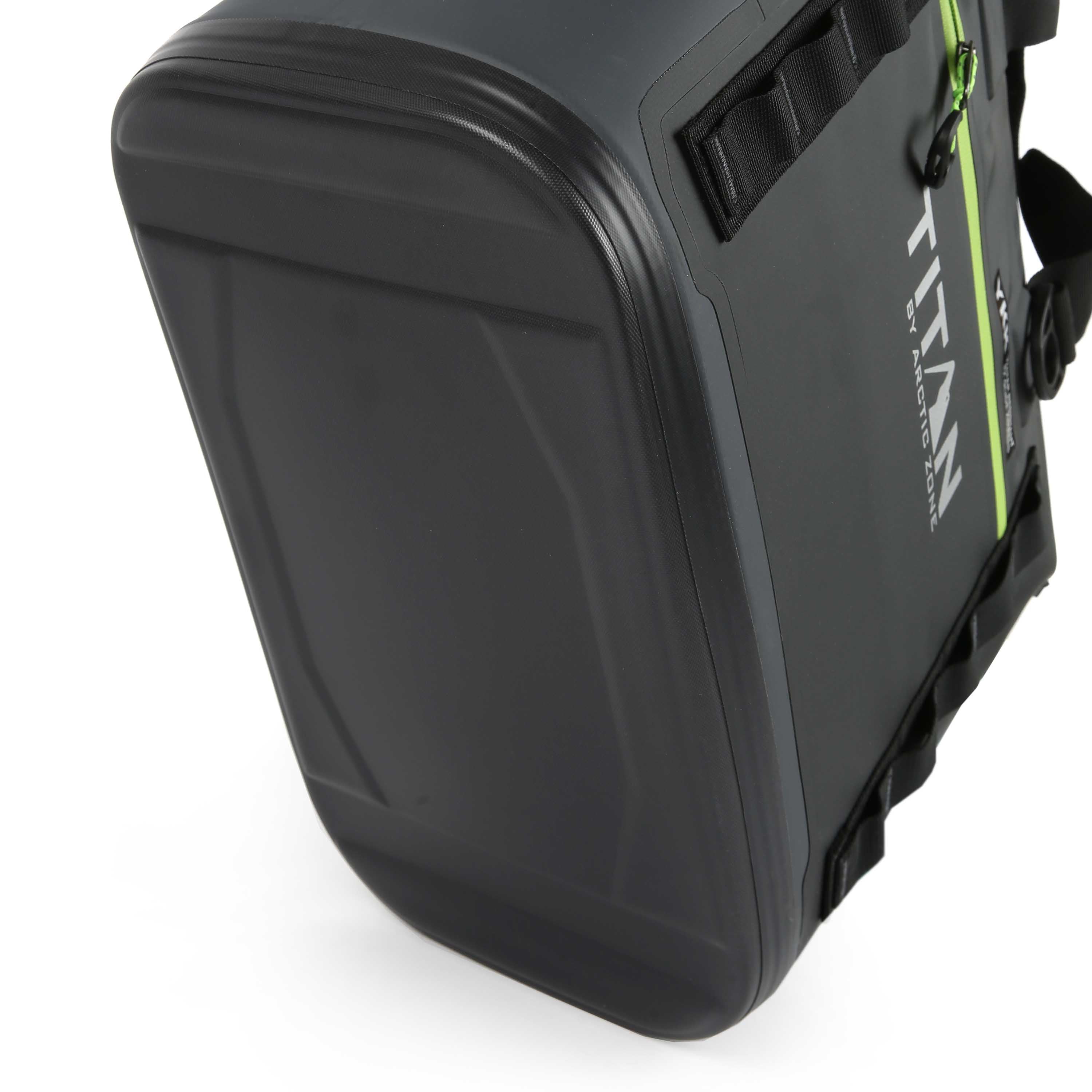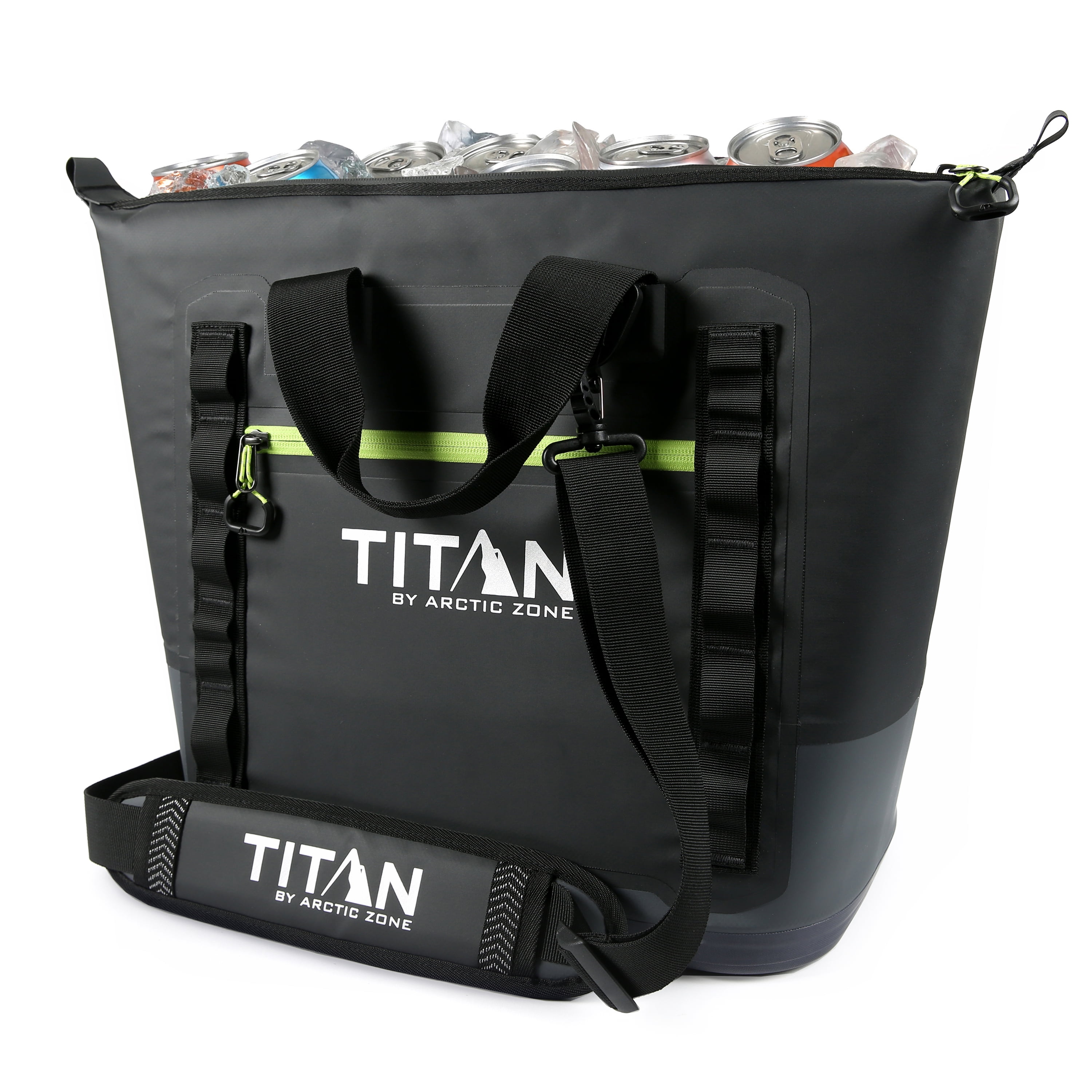 Titan by Arctic Zone Welded Tote Cooler has a welded, stitch-free, waterproof, puncture resistant exterior Holds 30 cans/20 quarts Deep Freeze Performance Insulation with integrated radiant heat barrier and interior ColdBlock base lock in the cold to keep ice up to 3 days Ultra Safe leak proof, easy clean interior lining with Microban to help protect against bacterial odors and stains YKK water resistant, EZ glide zippers Removable, adjustable, shoulder strap Magnetic webbing handles Exterior zippered pocket Daisy chain attachment loops
