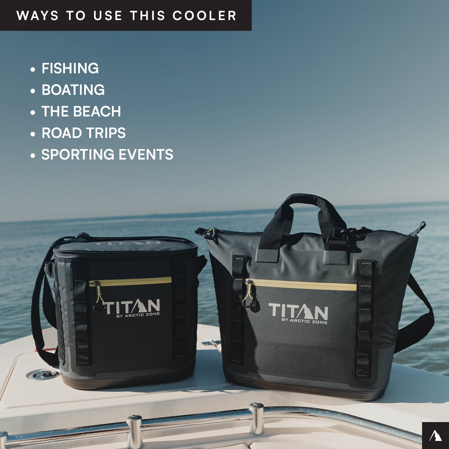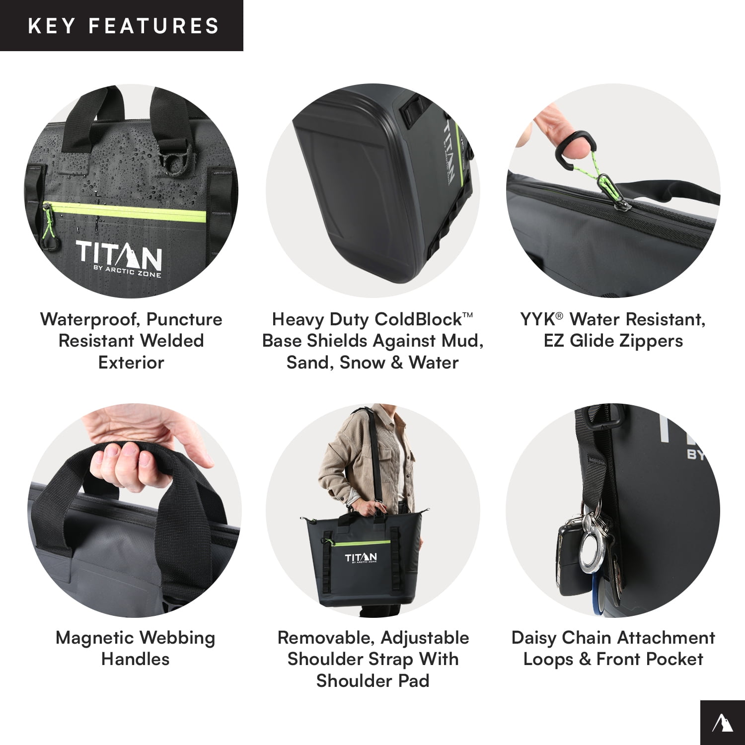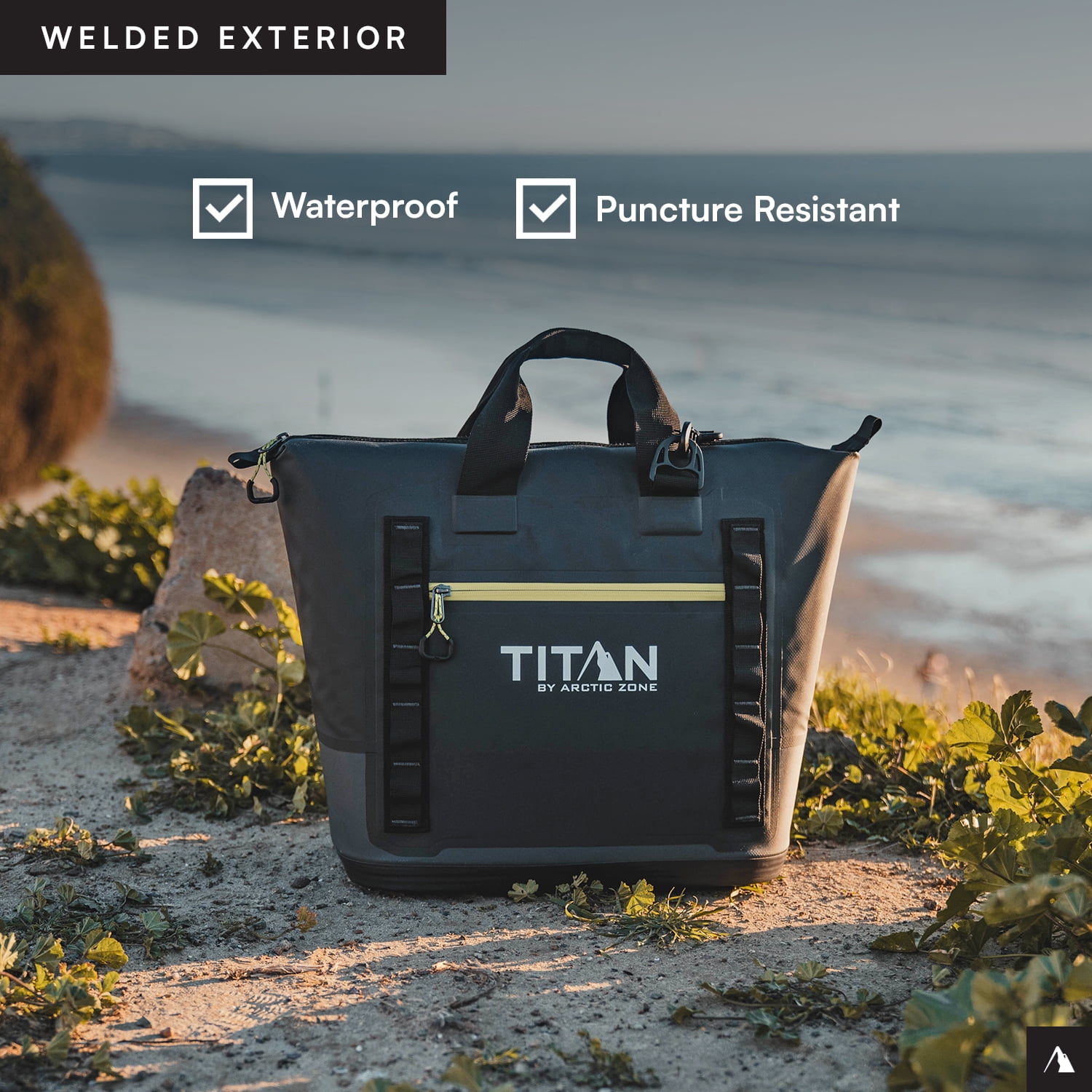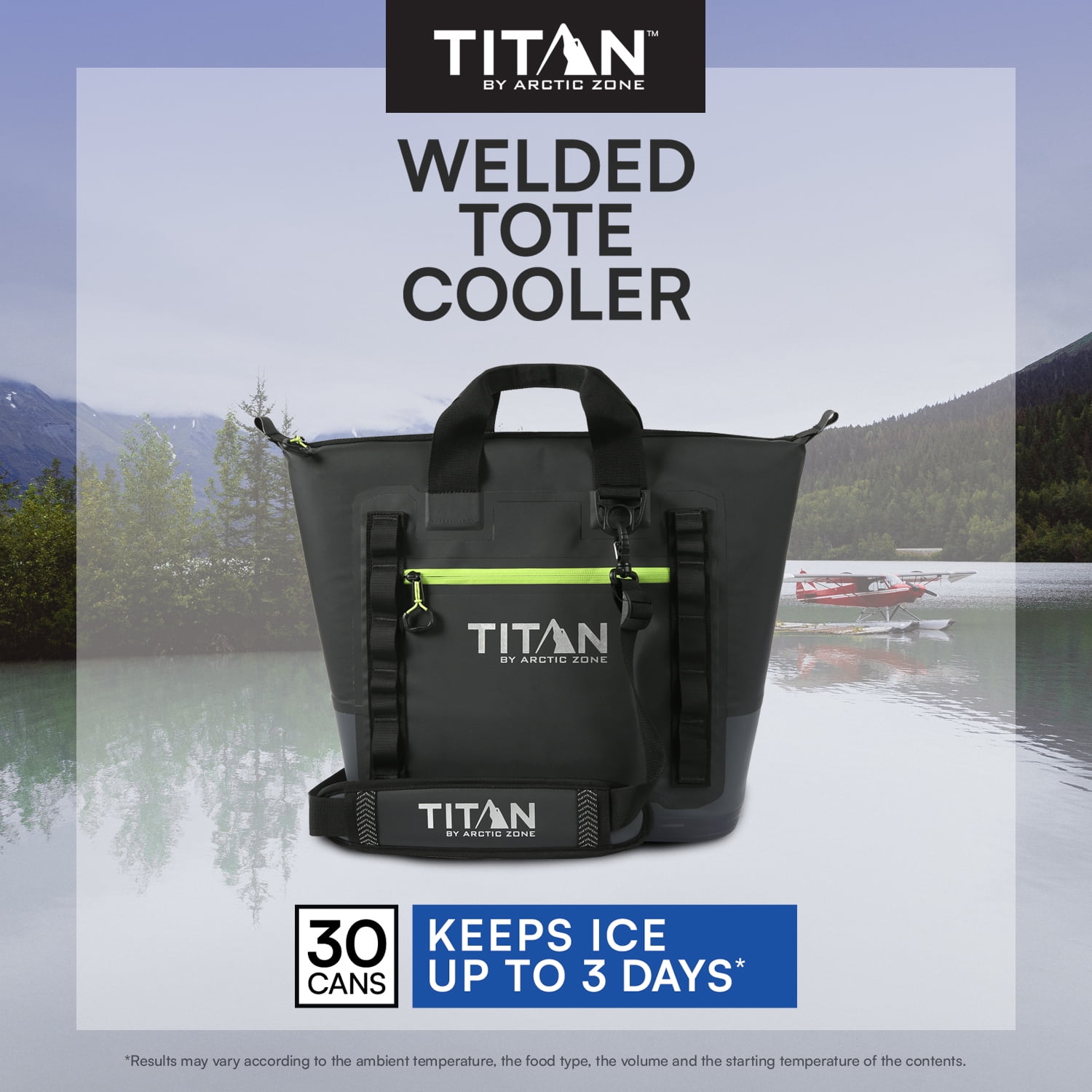 Titan by Arctic Zone Welded Tote Cooler has a welded, stitch-free, waterproof, puncture resistant exterior Holds 30 cans/20 quarts Deep Freeze Performance Insulation with integrated radiant heat barrier and interior ColdBlock base lock in the cold to keep ice up to 3 days Ultra Safe leak proof, easy clean interior lining with Microban to help protect against bacterial odors and stains YKK water resistant, EZ glide zippers Removable, adjustable, shoulder strap Magnetic webbing handles Exterior zippered pocket Daisy chain attachment loops