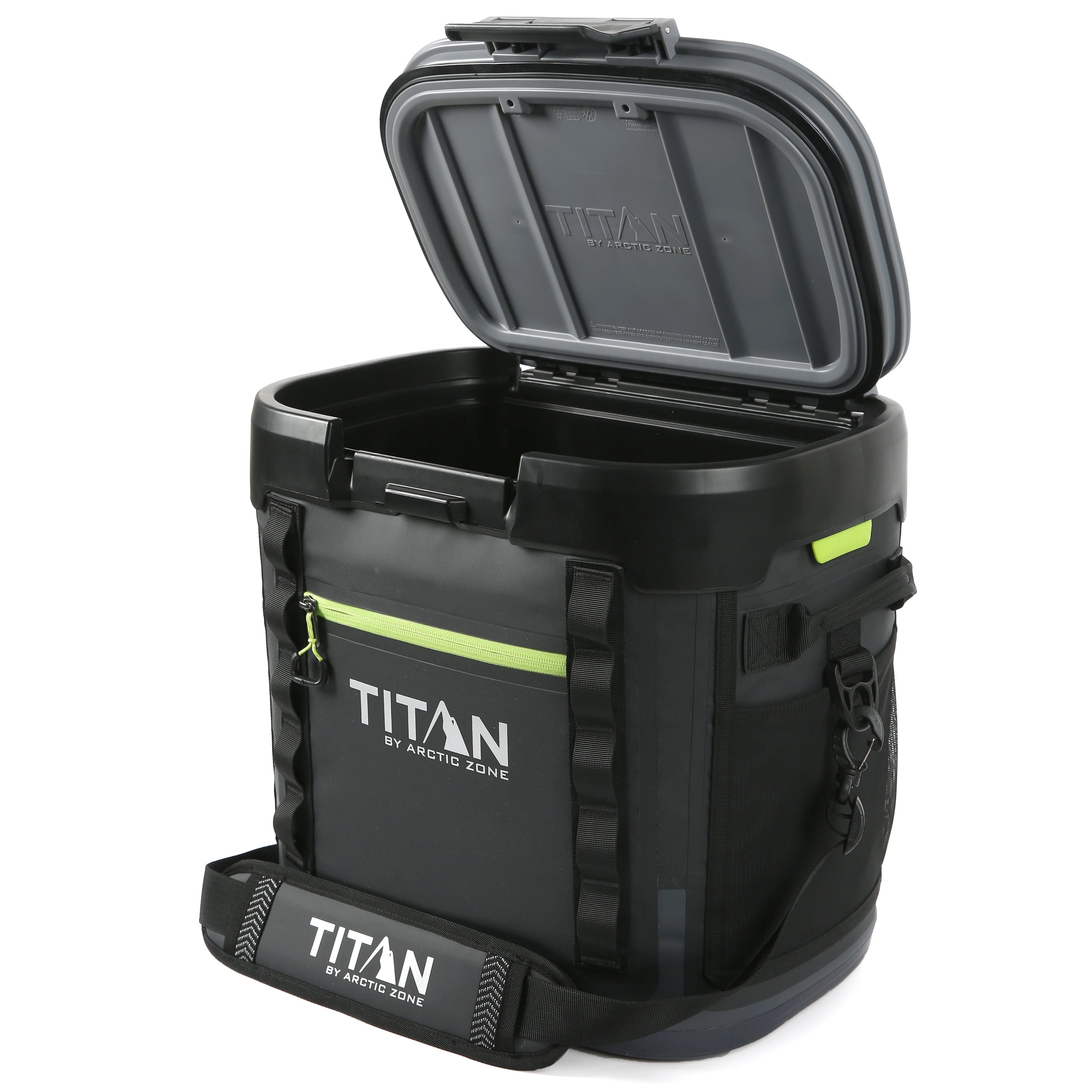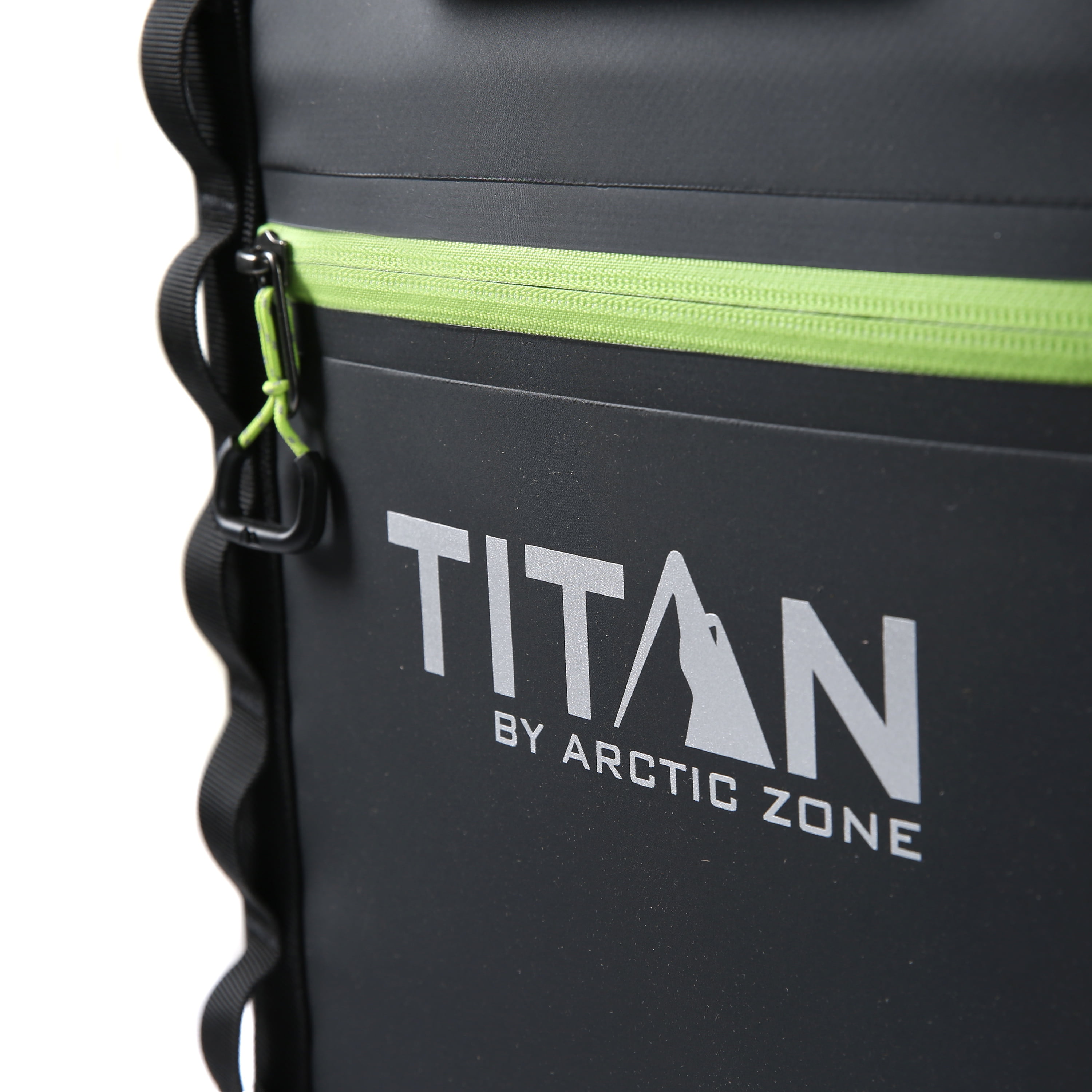 Titan by Arctic Zone Welded Cooler has a welded, stitch-free, waterproof, puncture resistant exterior Holds up to 36 cans/24 qts Deep Freeze Performance Insulation with integrated radiant heat barrier and interior ColdBlock base lock in the cold to keep ice up to 3.5 days Recyclable, rugged HardBody liner with Microban to help protect against bacterial odors and stains Ultra Safe leak proof, easy cleaning Front pocket with YKK water resistant, EZ glide zipper 2 Exterior mesh pockets Removable, adjustable shoulder strap with shoulder pad Daisy chain attachment loops