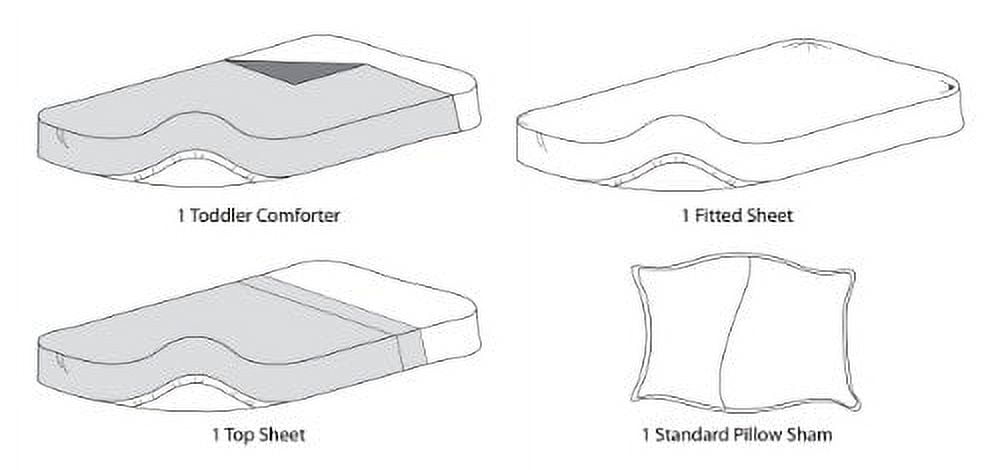 100% Cotton Fits Standard toddler bed and standard crib size 28″ x 52″ mattresses 4-piece set includes one comforter, one top sheet fitted on one end with elastic, one fitted bottom sheet, and one standard pillow Available in an array of colors to help decorate your toddler’s room