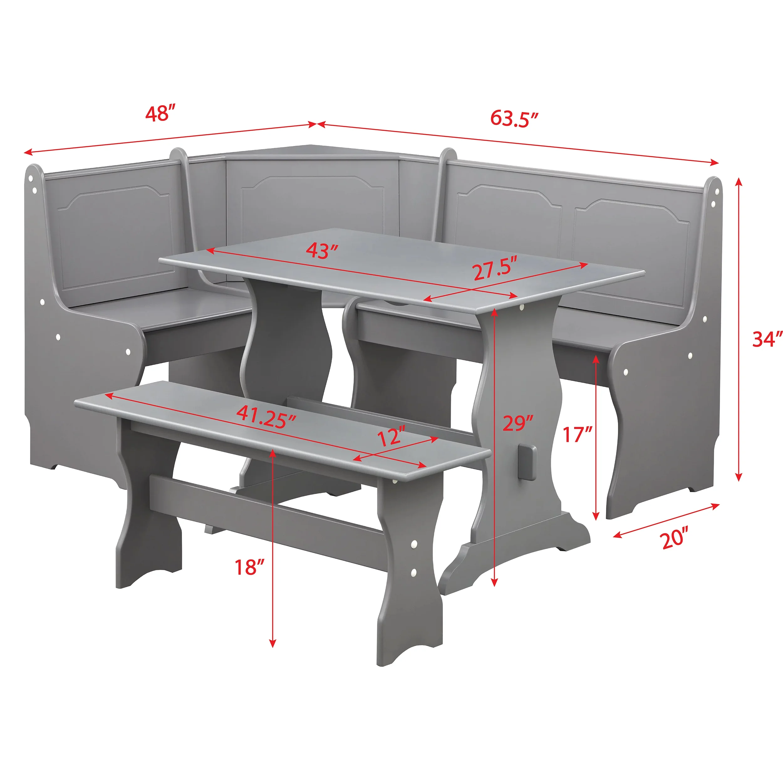 Update your home decor with this charming 3-piece dining nook set Nook set includes table, bench, and nook bench Nook corner bench includes a seat that lifts for storage Constructed of MDF and finished in antique white, black, or espresso Nook corner long side: 63.5″L x 20″W x 34″H Short Side: 48″L x 20″W x 34″H Nook table measures 43″L x 27.5″W x 29″H Nook bench measures 41.25″L x 12″W x 18″H Assembly required Do not use power tool for assembly Site to Store Pickup Note: This item is packaged in multiple large boxes that may not fit in a standard-sized vehicle. Please make sure you have a large car or truck for store pickup. Box 1 dimensions: 43″L x 22.8″W x 4.75″H; weight: 54 lbs Box 2 dimensions: 44″L x 29.25″W x 4.75″H; weight: 35 lbs Box 3 dimensions: 47″L x 31.3″W x 4.25″H; weight: 45 lbs Box 4 dimensions: 47″L x 16.75″W x 3.5″H; weight: 16 lbs For Indoor Use Only