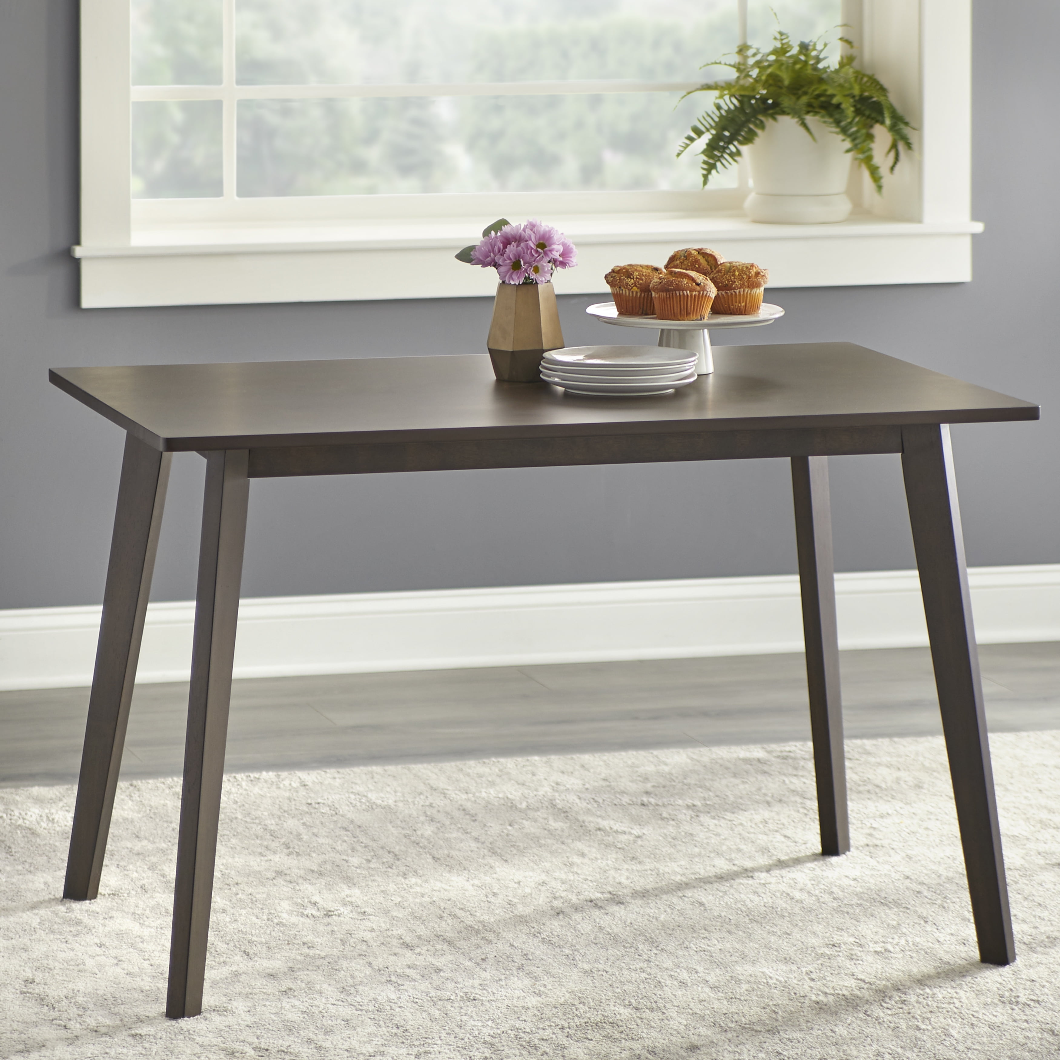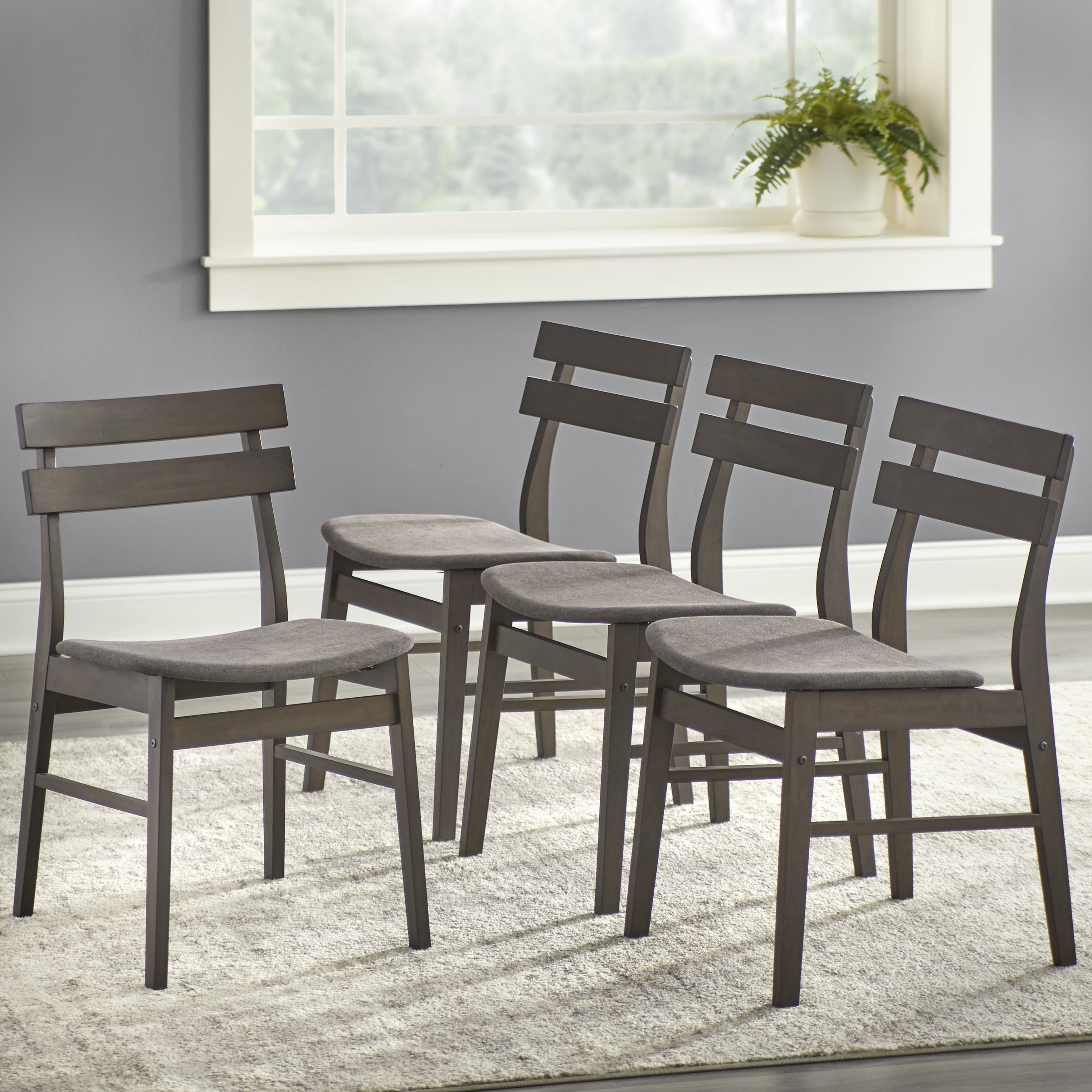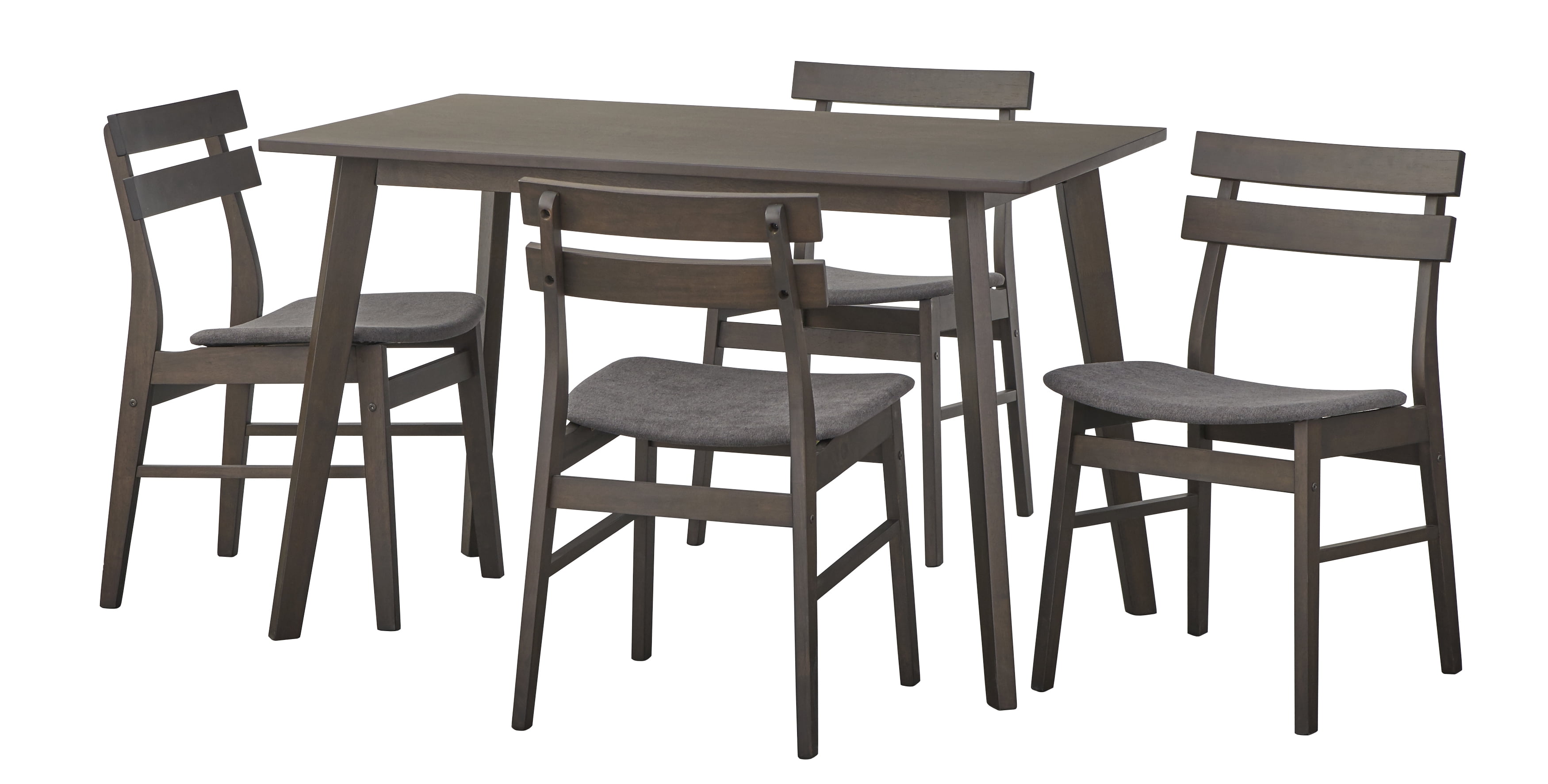 Set includes: One (1) dining table and four (4) dining chairs Clean line design is ideal for many room interiors Ideal placement in the kitchen, breakfast nook Angled legs provide design interest Walnut finished rectangular shape table and chairs Chairs are constructed of rubber wood, foam, and fabric Upholstered seat cushions in a gray or beige Ships in one (1) carton Assembly required Table dimensions: 29.5 inches high x 47.3 inches wide x 29.5 inches deep Chair dimensions: 30.1 inches high x 17.8 inches wide x 20.8 inches deep