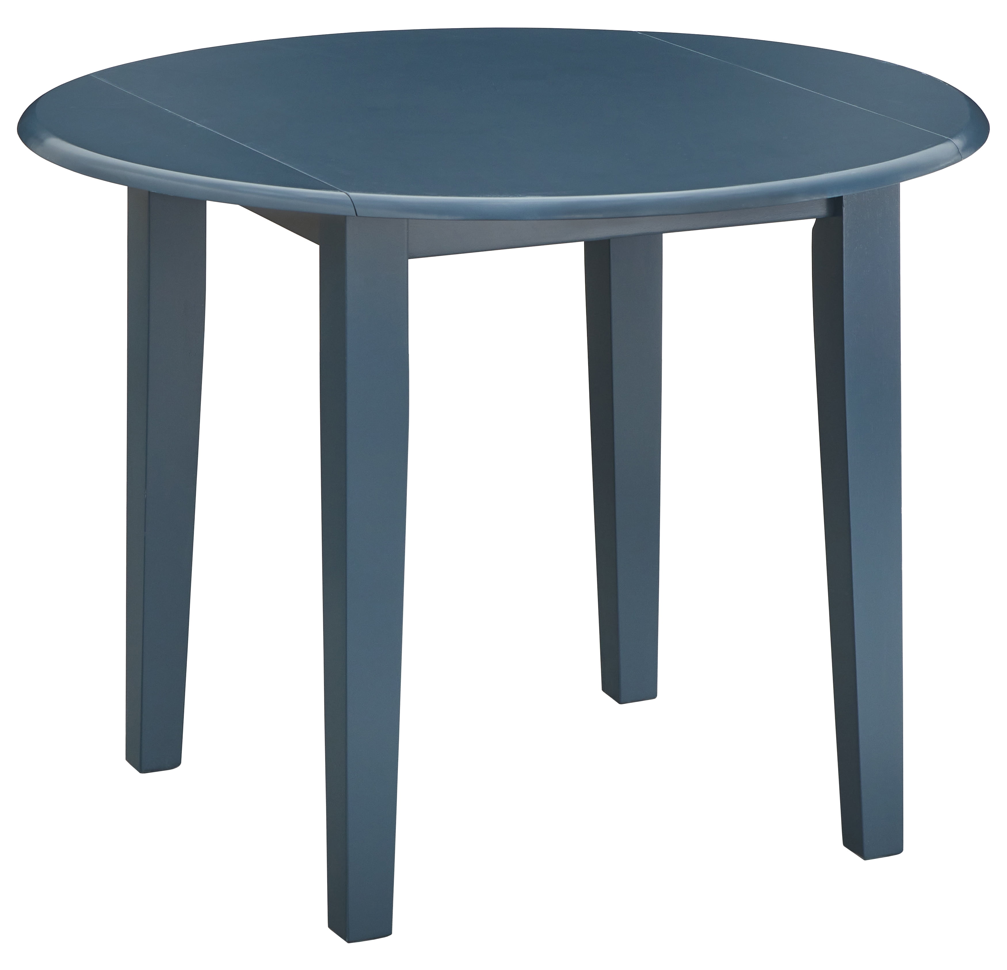 Includes: one (1) table Two 7-inch drop leaves Ideal placement in the breakfast nook or small eat-in kitchen Easy assembly required Constructed of solid Rubberwood Midnight Blue finish Ships in one (1) carton Overall table dimensions: 29.5 inches height x 40 inches width x 40 inches length (with leaves up) Width with leaves down: 26 inches Weight capacity: 100 lbs